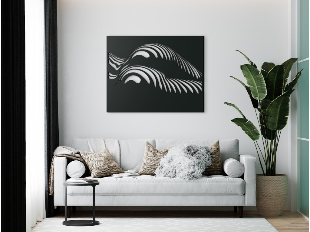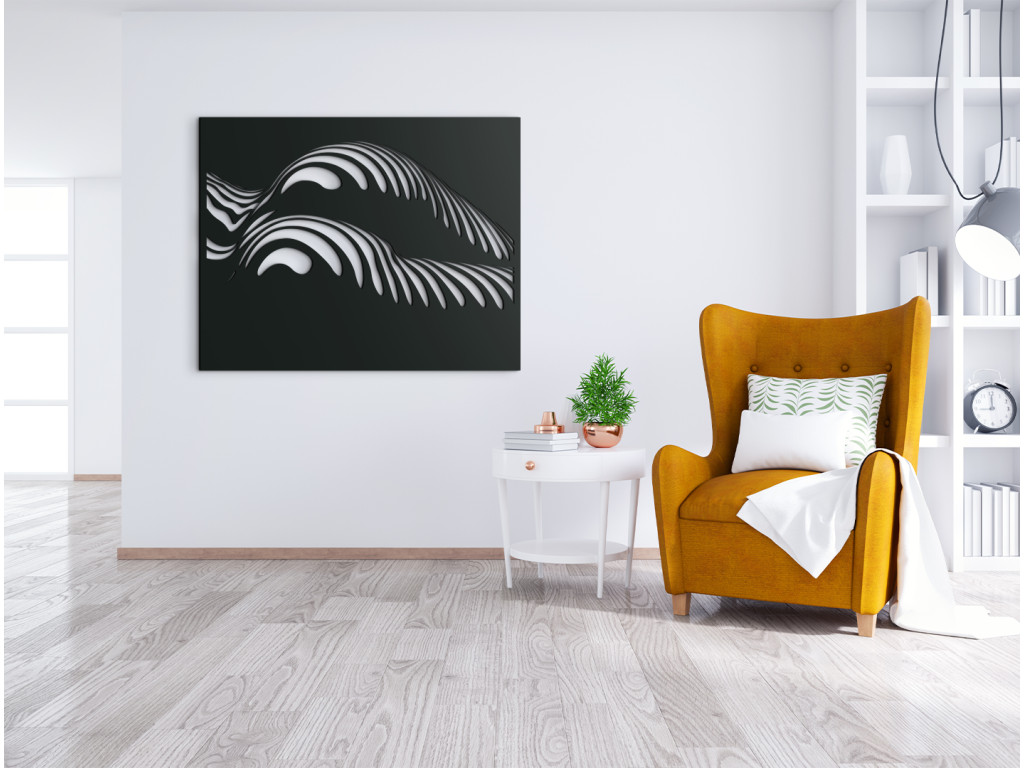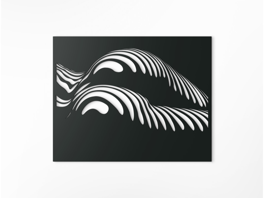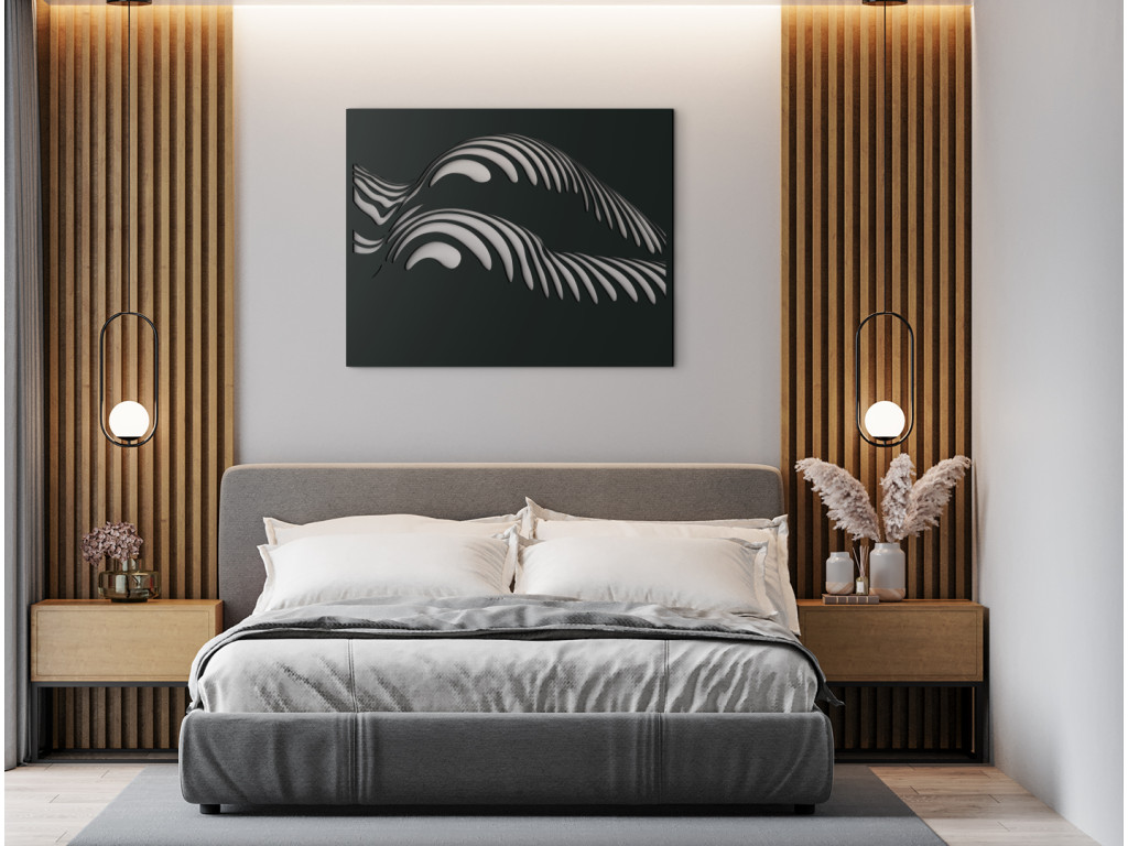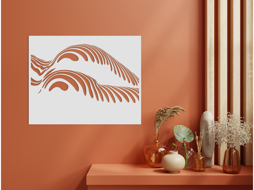 A Görbék jellegzetes elnevezésű modern fakép a kerek női csípő és alak művészi ábrázolása. Kiemeli a természetes női formák szépségét és teltségét, amelyek finoman körvonalazódnak a hullámokon és csíkokon keresztül.