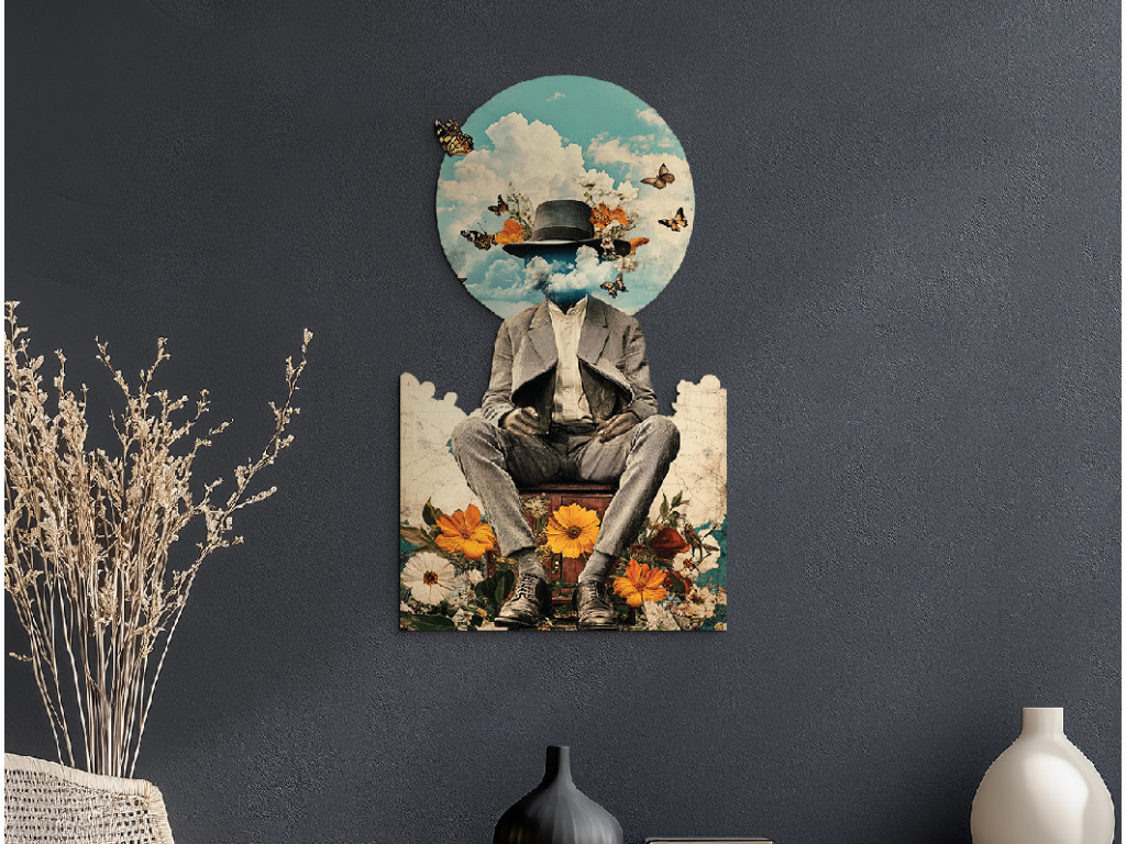 Ez az álomszerű alkotás egy elegáns öltönyös és kalapos alakot ábrázol, akinek a feje a felhőkben lebeg – a szemlélődés, a szabadság és a menekülés utáni vágy metaforája. Pillangók röpködnek a kék ég háttere előtt, amelyek a meleg narancssárga és fehér tónusú virágos alappal együtt a tavaszt, a megújulást és az ember és a természet békés kapcsolatát szimbolizálják.