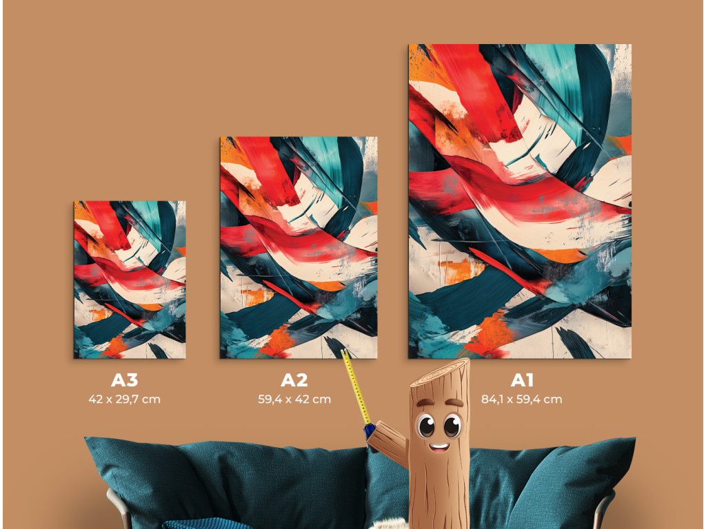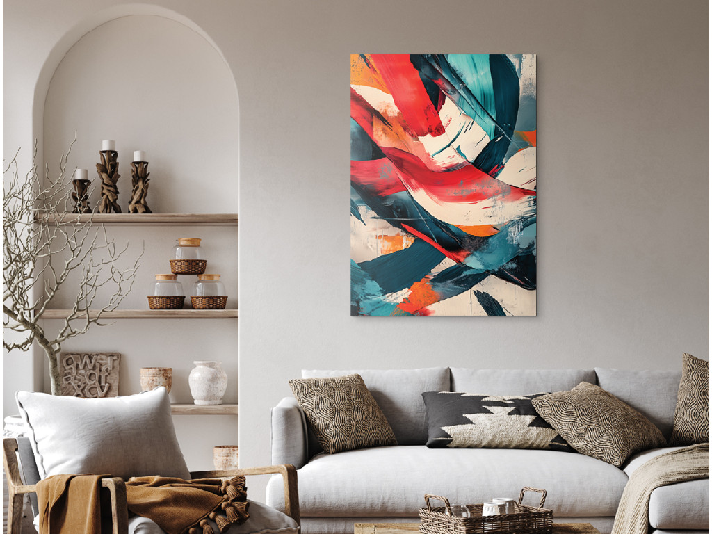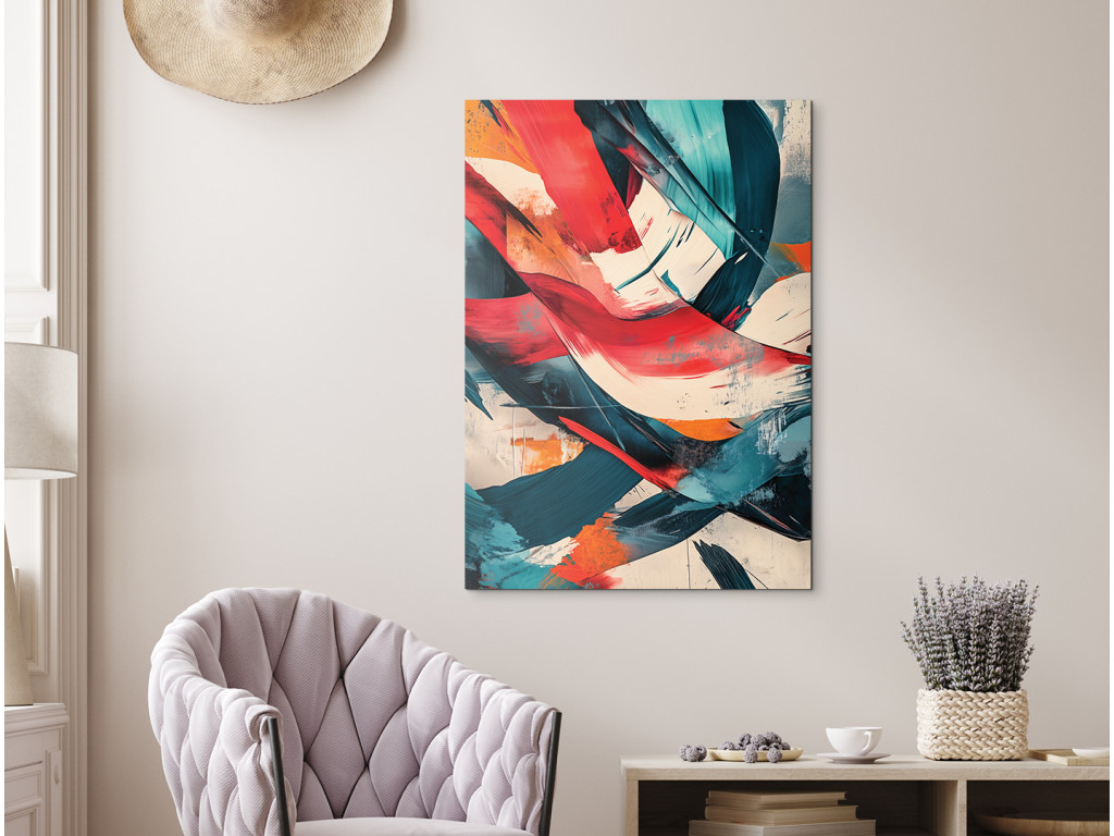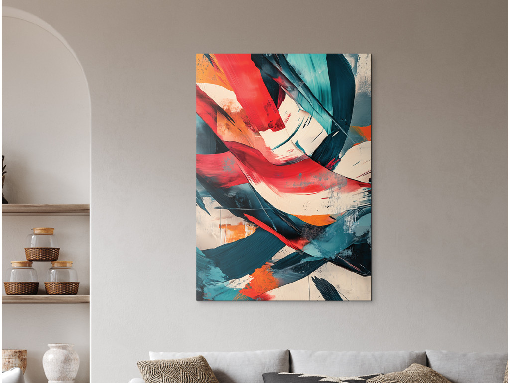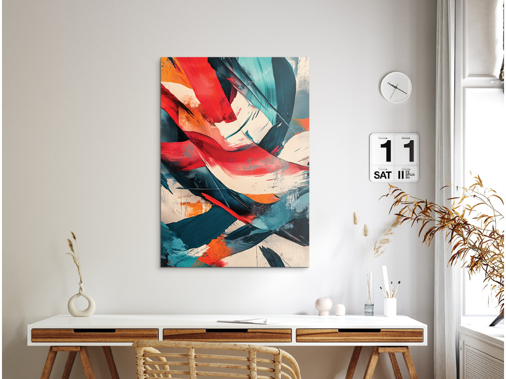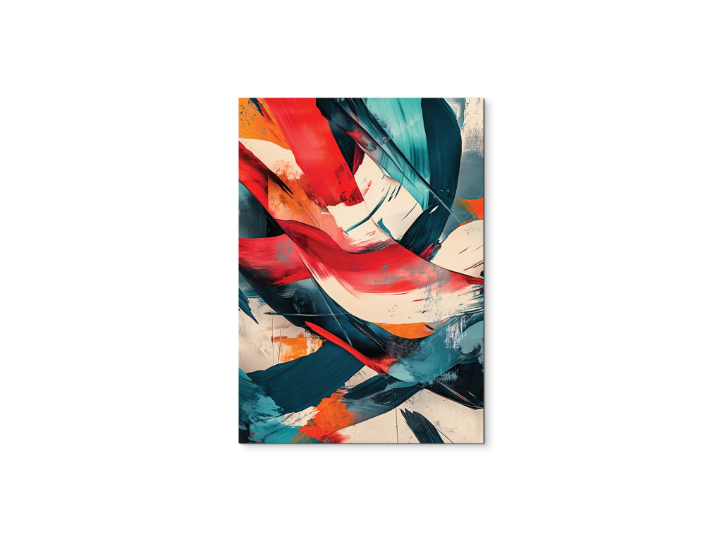 Az energiával és élettel teli absztrakt festmény merész ecsetvonásokat és kontrasztos színeket – vörös, türkiz, narancs és fehér – használ. A kompozíció spontán és kifejező, mozgás és érzelem érzetét kelti a nézőben.