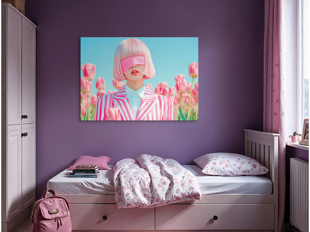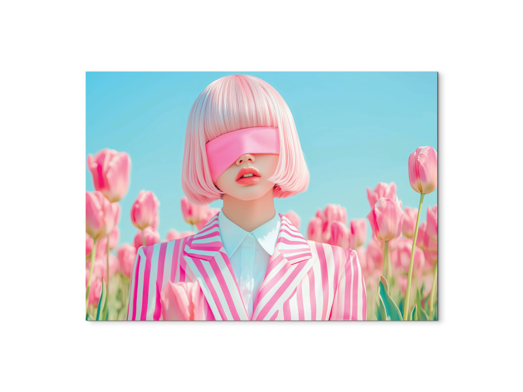 A festmény egy erősen stilizált, rövid rózsaszín hajú és rózsaszín szemkötővel ellátott alakot ábrázol, aki egy virágzó rózsaszín tulipánmezőn áll. Az alak rózsaszín-fehér csíkos kabátot és fehér inget visel. A háttérben látható ragyogó kék ég kontrasztot alkot a rózsaszín árnyalatokkal, szürreális és vizuálisan lenyűgöző kompozíciót hozva létre.