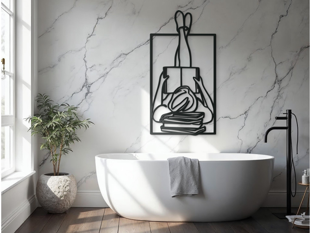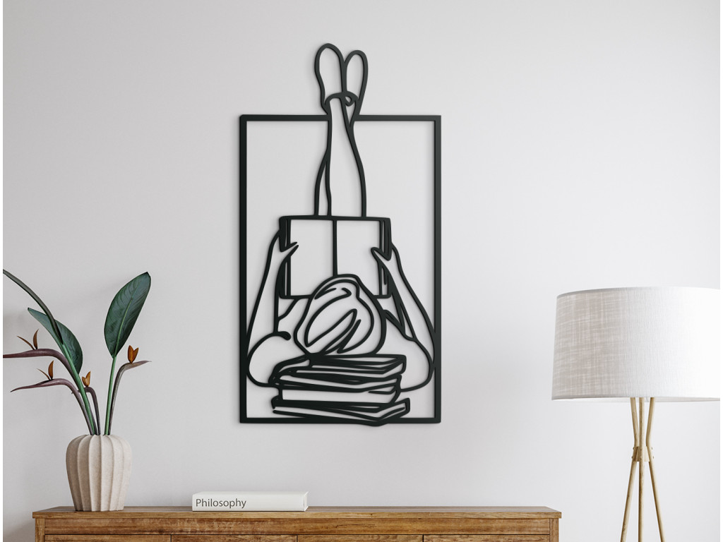 Egy könyvvel a kezében lévő lányt ábrázoló, fából készült falfestmény ellazult, jóléttel teli érzést kelt. A finoman megrajzolt vonalak a békét és az olvasás mély koncentrációját hangsúlyozzák. Ez egy eredeti dekoráció, amely kellemes hangulatot teremt és első látásra magára vonzza a figyelmet.
