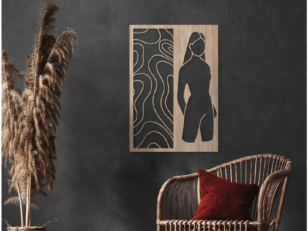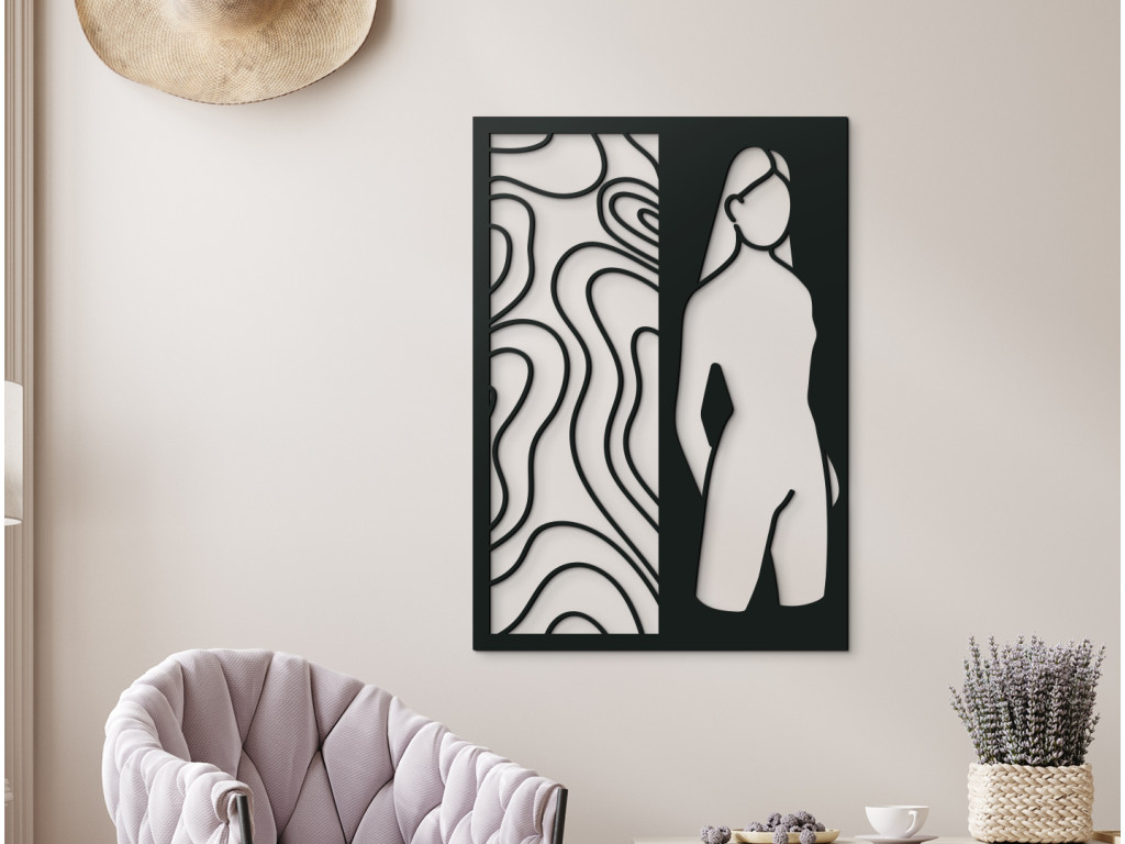 Ez a dekoráció egy olyan nő sziluettjét ábrázolja, aki a békét, a kecsességet és a természetes nemességet testesíti meg. A precízen kidolgozott vonalak kiemelik a mű absztrakt jellegét, teret nyitnak az értelmezésnek és serkentik a képzeletet. Minimalista környezettel kombinálva művészi akcentusként tűnik ki, amely kiemeli otthona egyedi stílusát. Ideális választás azok számára, akik a modern design és az időtlen esztétika közötti kiegyensúlyozott harmóniát keresik.