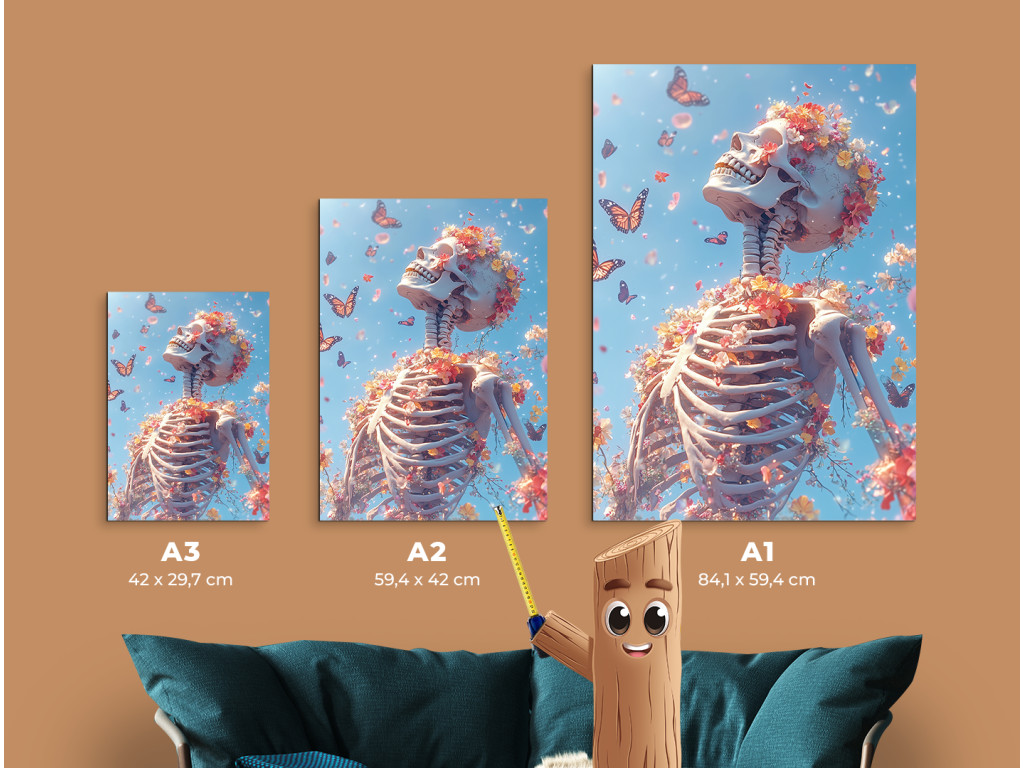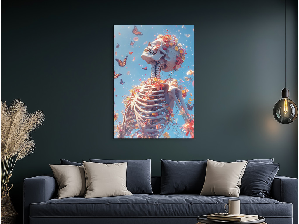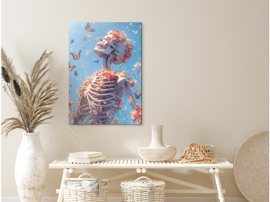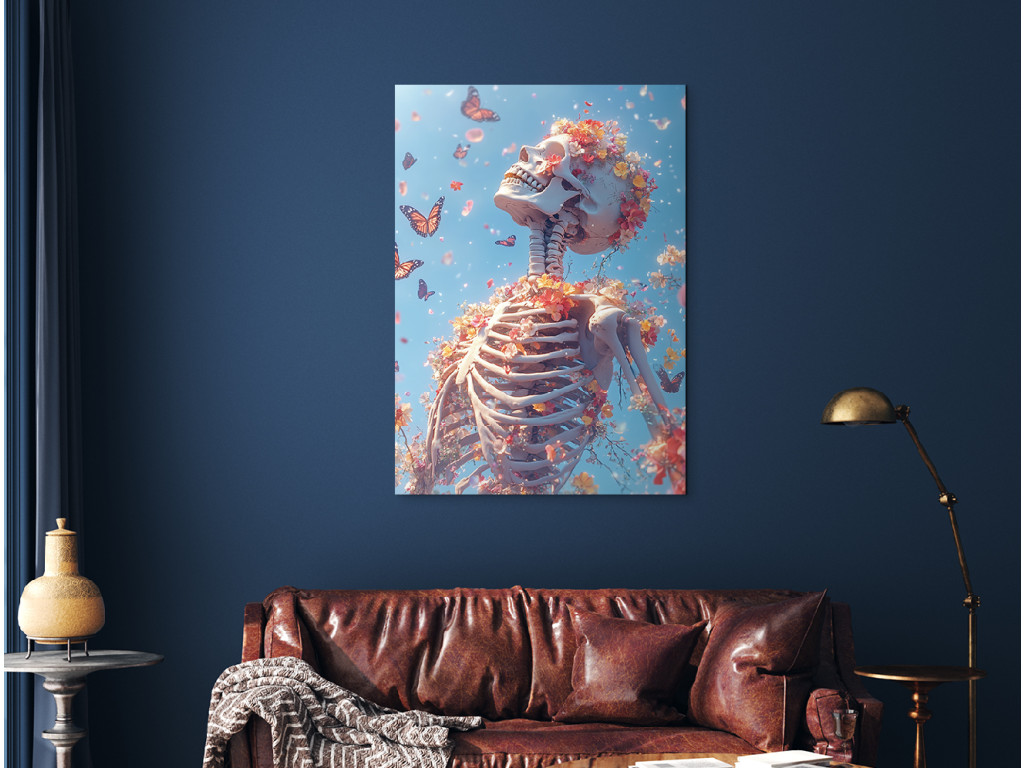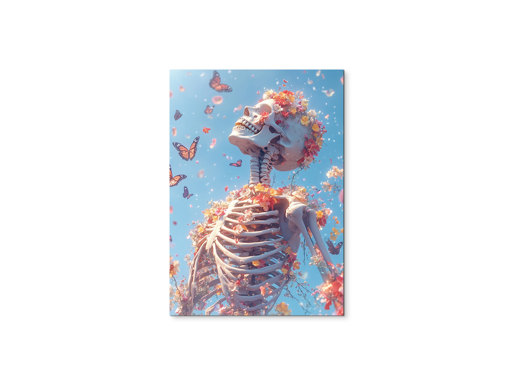 A festmény egy emberi csontvázat ábrázol, amelyet virágok és pillangók vesznek körül, erős kontrasztot teremtve a halál és az élet között, szimbolikusan összekapcsolva a múlandóságot a megújulással és az élet körforgásának szépségével.