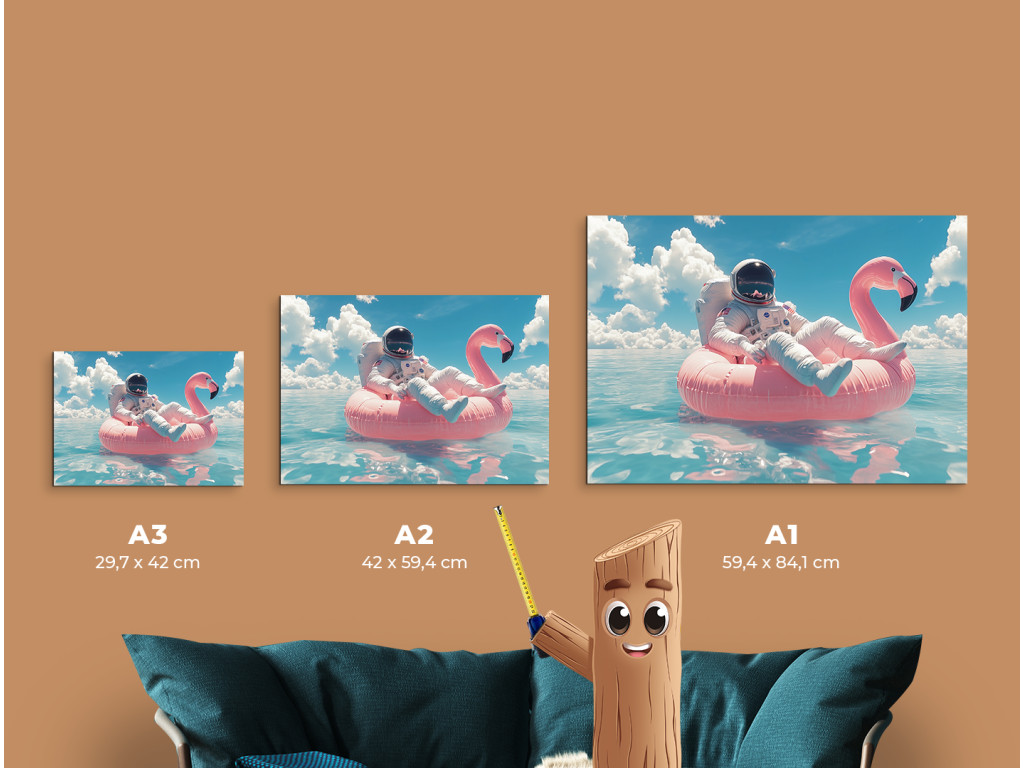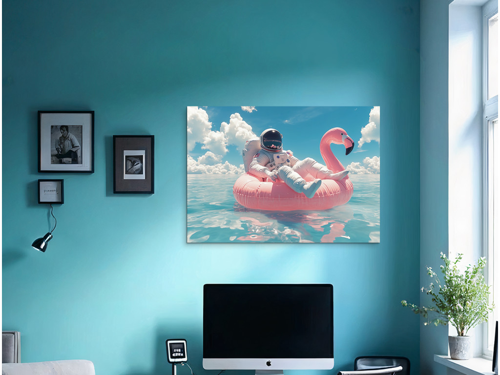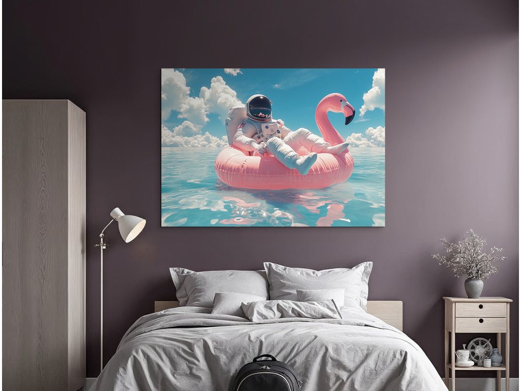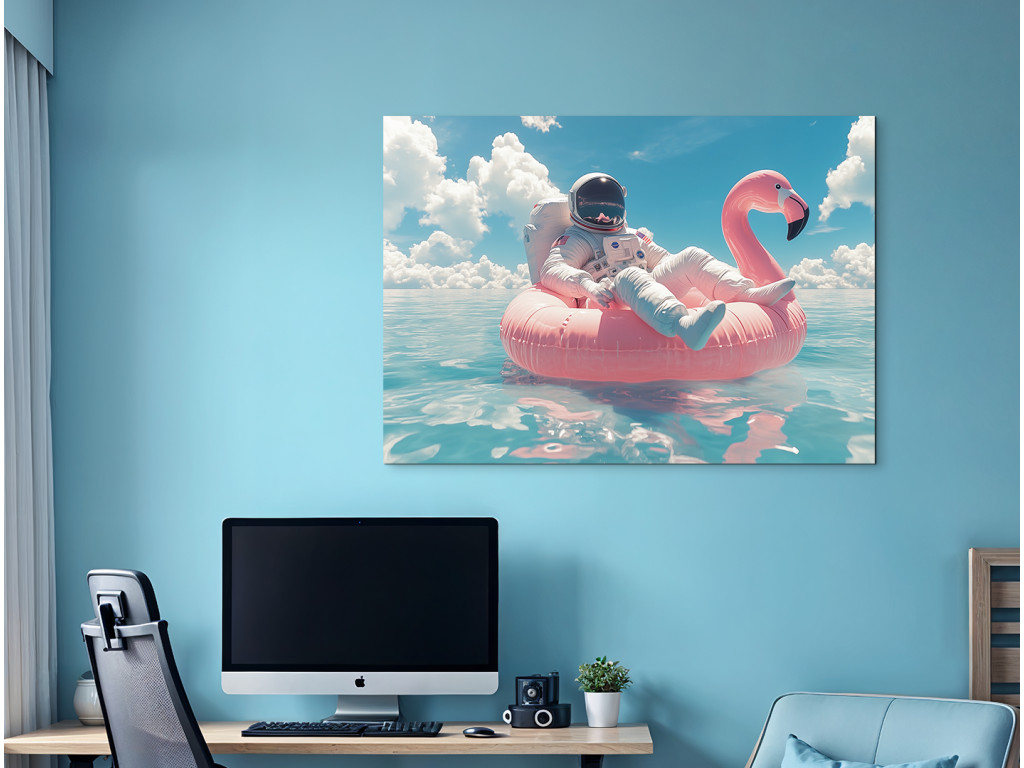A művészi jelenet egy űrhajóst ábrázol, amint egy rózsaszín felfújható flamingón pihen a nyugodt türkizkék vízben. A jelenet a tér futurisztikus elemét ötvözi a nyugodt nyári vakáció hangulatával a tiszta kék ég alatt.