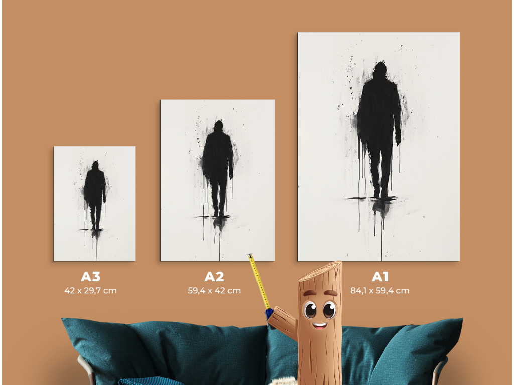 Az absztrakt festmény egy sétáló alak fekete sziluettjét ábrázolja világos háttér előtt, elmosódott és áramló hatásokkal, amelyek a mozgást és az érzelmi mélységet hangsúlyozzák. A mű a magány, az átalakulás vagy a belső utazás érzését idézi fel.