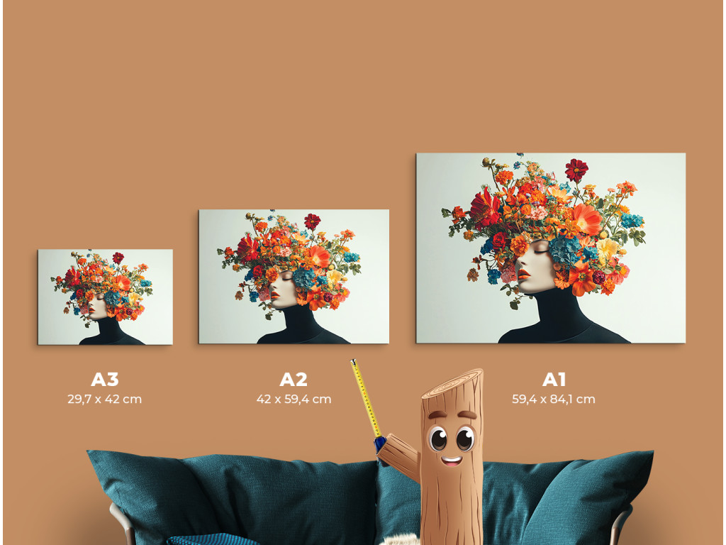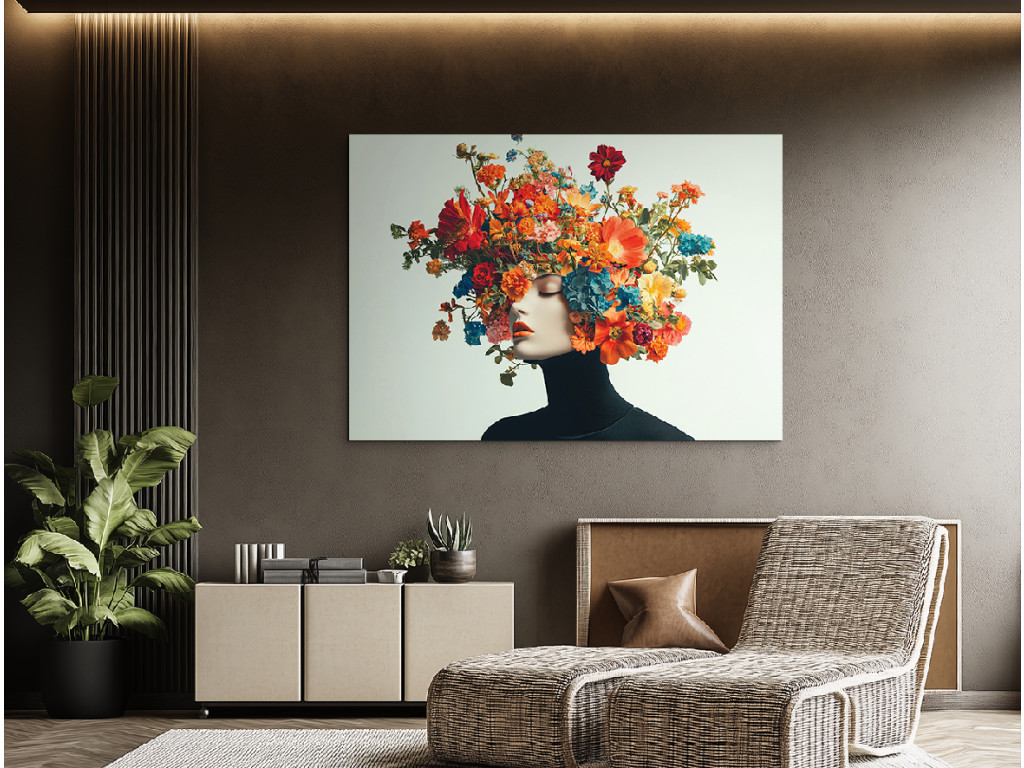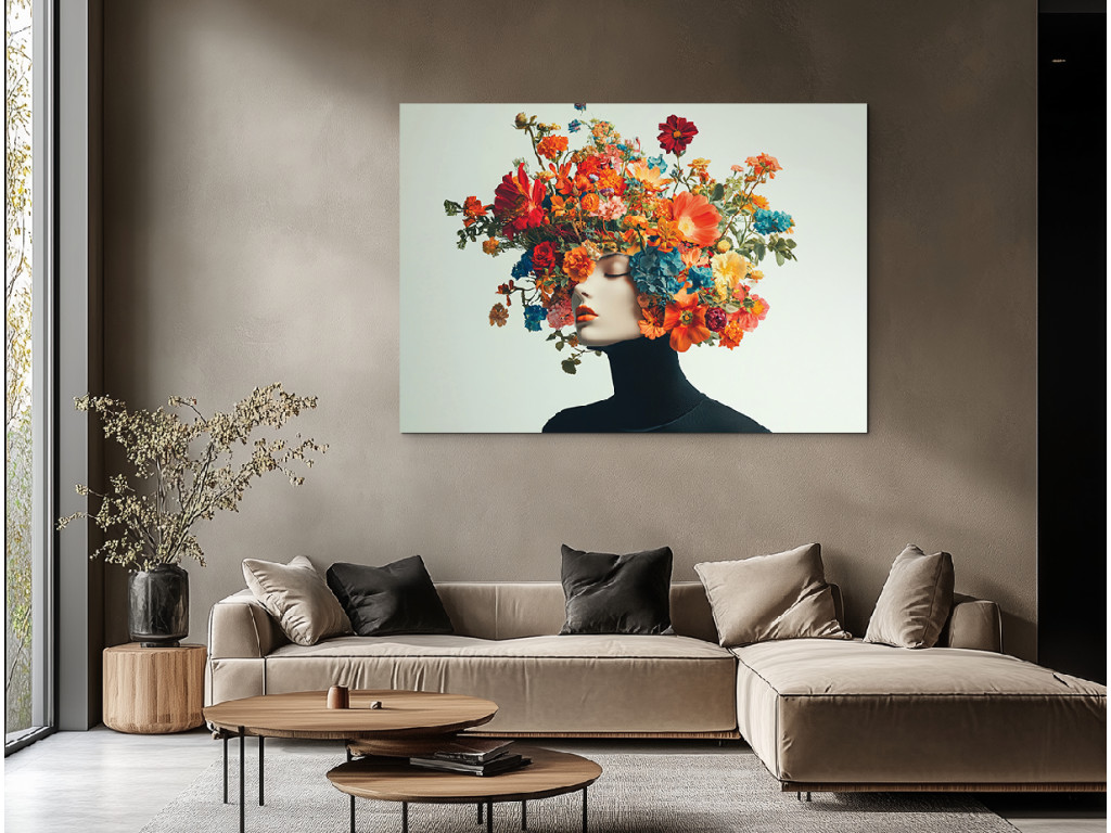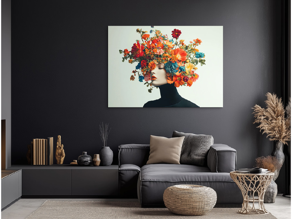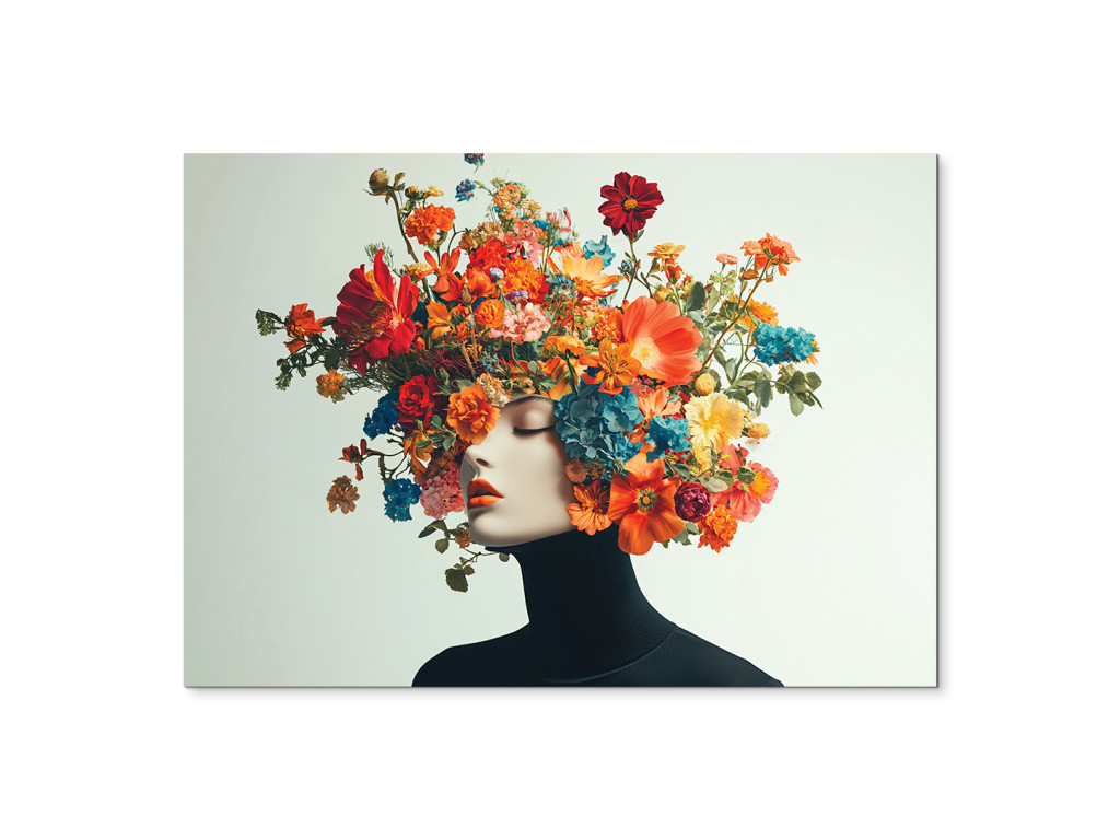 Egy nő művészi portréja profilból, haja helyén feltűnő virágdíszítéssel. A virágok színes robbanása kontrasztot alkot a fekete garbóval és a semleges háttérrel, elegáns és harmonikus kompozíciót hozva létre.
