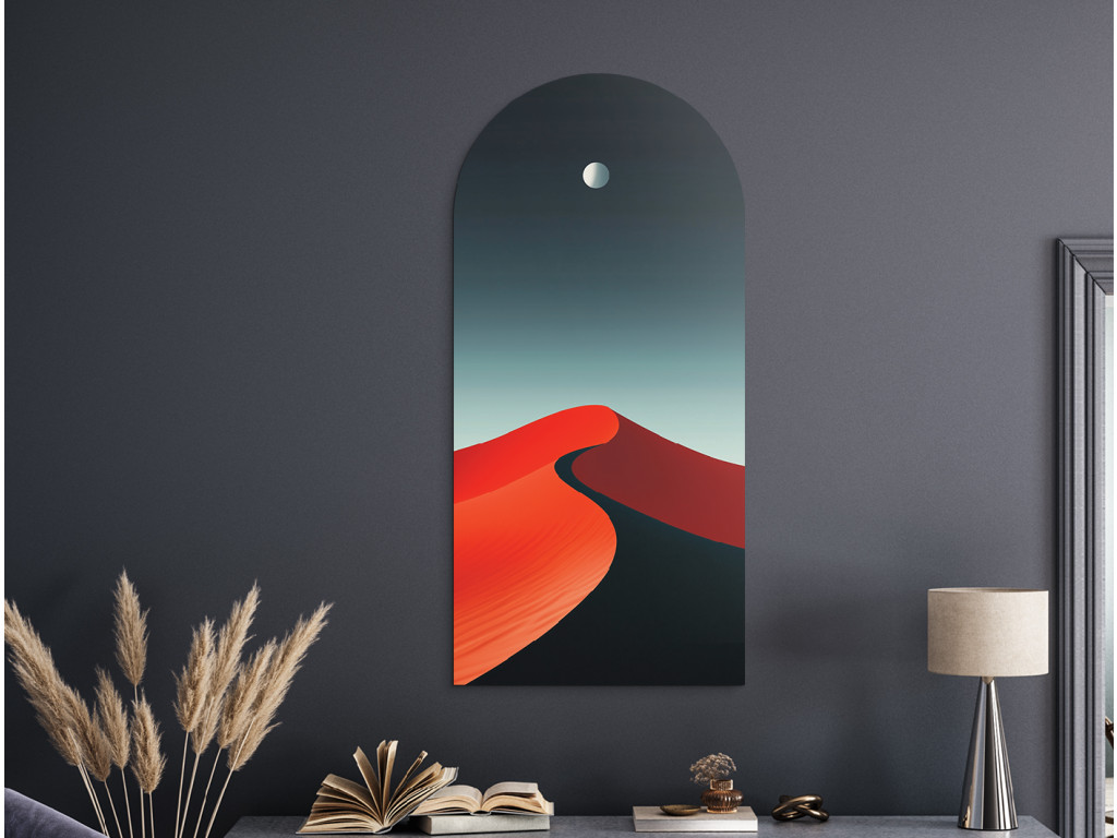 A festmény egy drámai jelenetet ragad meg, amelyben egy feltűnő vörös homokdűne emelkedik ki egy sötét, szinte fenyegető háttérből. Felette egy fehér, holdra emlékeztető kör alakú képződmény lebeg, titokzatos és álomszerű hangulatot kölcsönözve az egész kompozíciónak