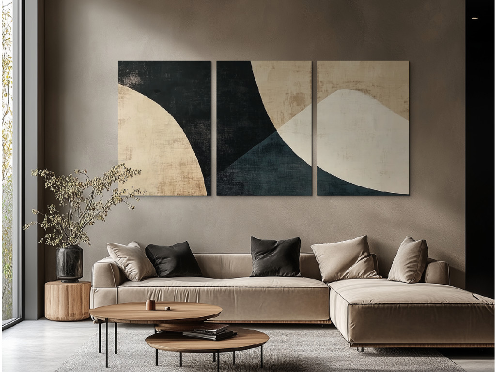 Elegáns, modern absztrakt stílusú háromrészes kép. A kompozíció geometrikus és organikus formákat egyensúlyoz harmonikus rendben. Semleges árnyalatok dominálnak – a fekete sötét kontrasztjai finoman találkoznak a homok- és bézstónusok lágyságával. Ideális modern enteriőrbe, nappaliba vagy irodába.
