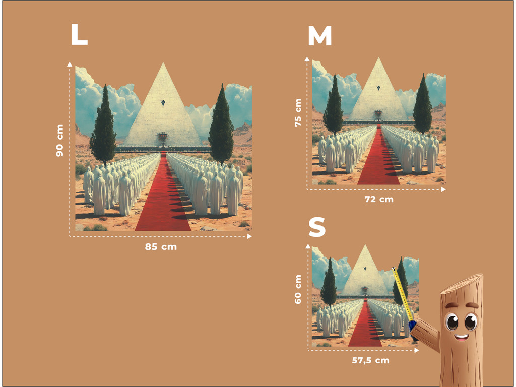 A Csend a piramis előtt kép titokzatos sivatagi jelenetet ábrázol: fehér ruhás alakok vörös szőnyegen vonulnak egy mindent látó szemmel ékesített piramis felé, ahol a szimbolika és a kompozíció az ókori rituálékat, az ezoterikát és a spirituális beavatást idézi.
