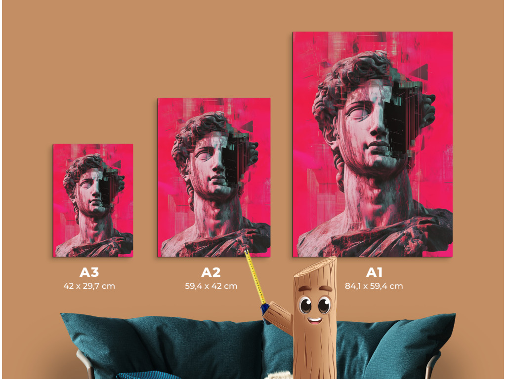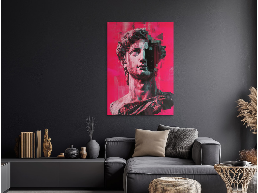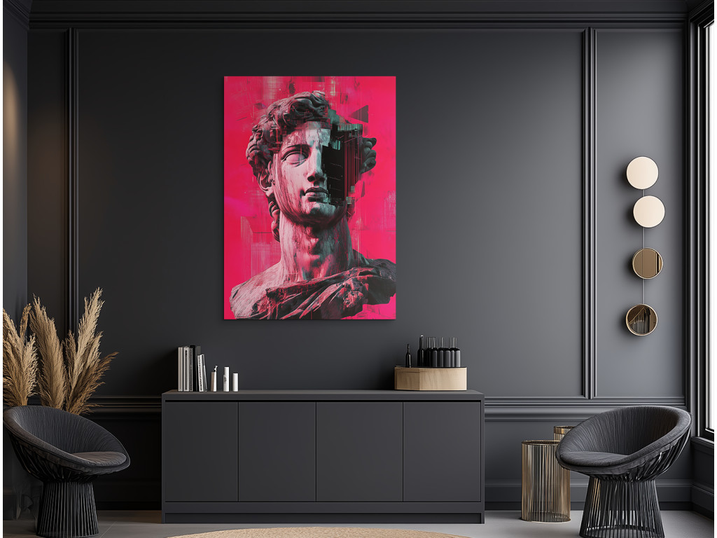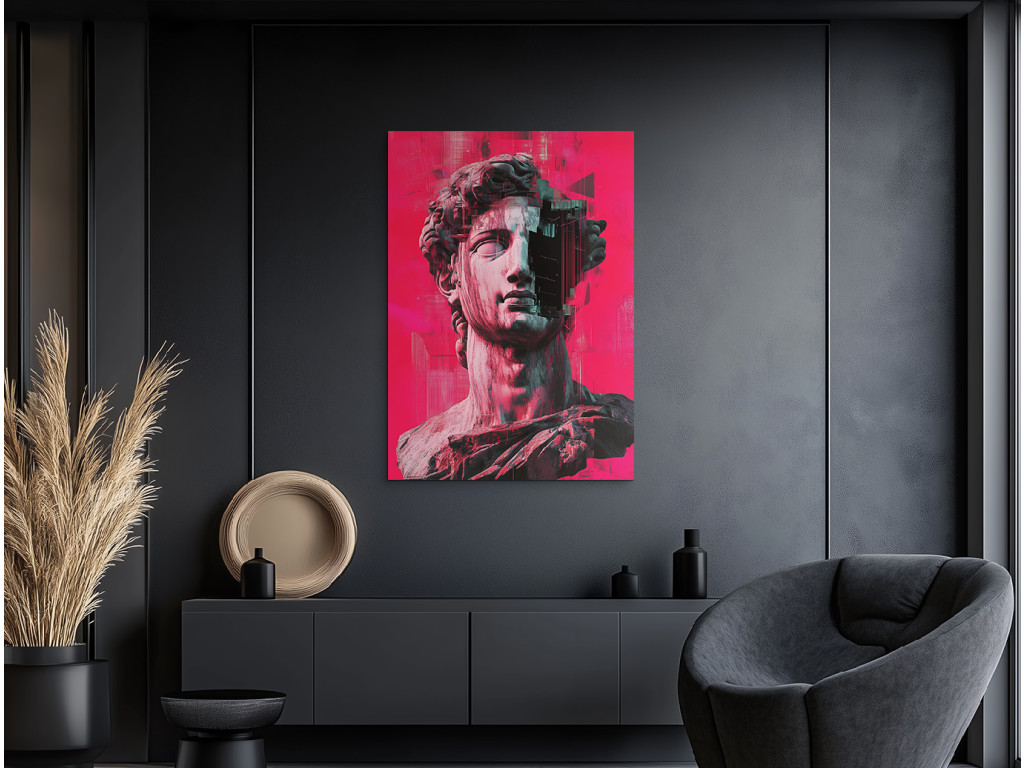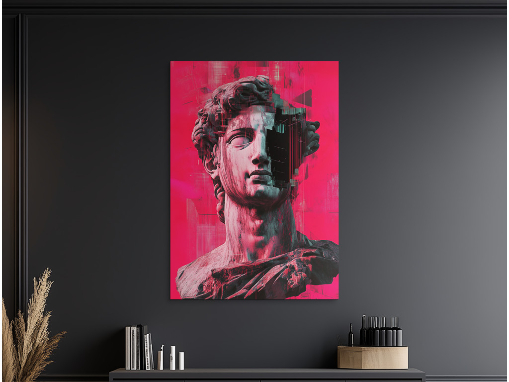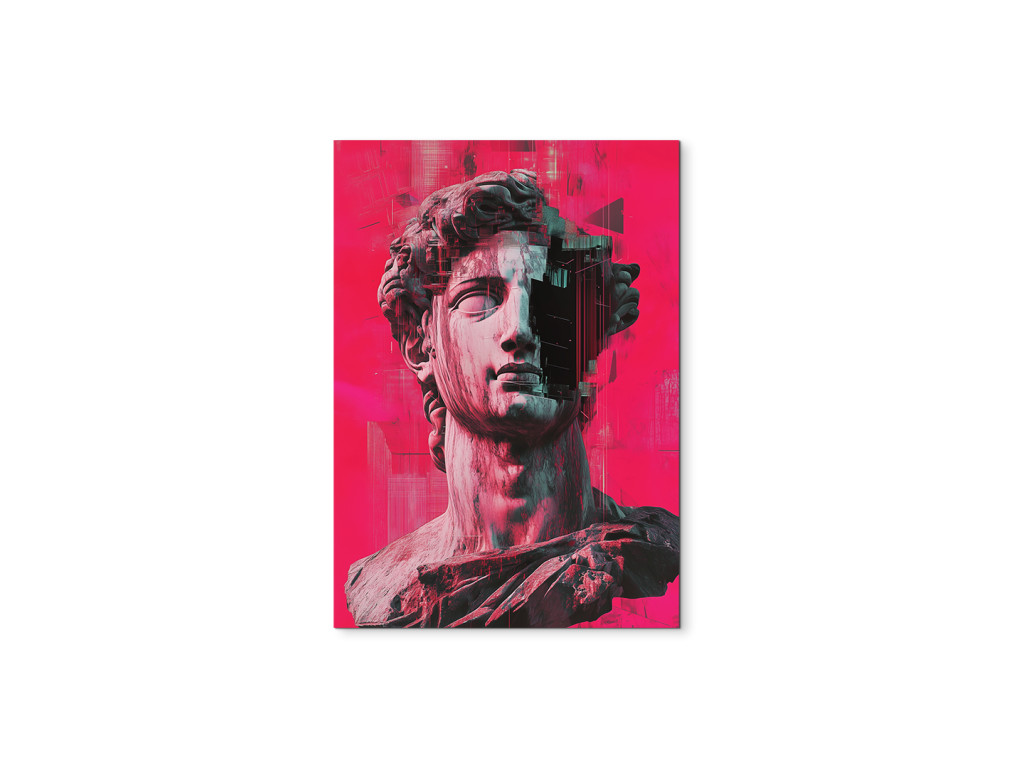 A kép egy ókori szobor mellszobrát ábrázolja, amelyet egy digitális glitch effektus torzít el, kontrasztot teremtve az ókori esztétika és a modern digitális töredezettség között. A rózsaszín háttér fokozza a vizuális hatást, és határozott pop-art jelleget kölcsönöz a műnek.