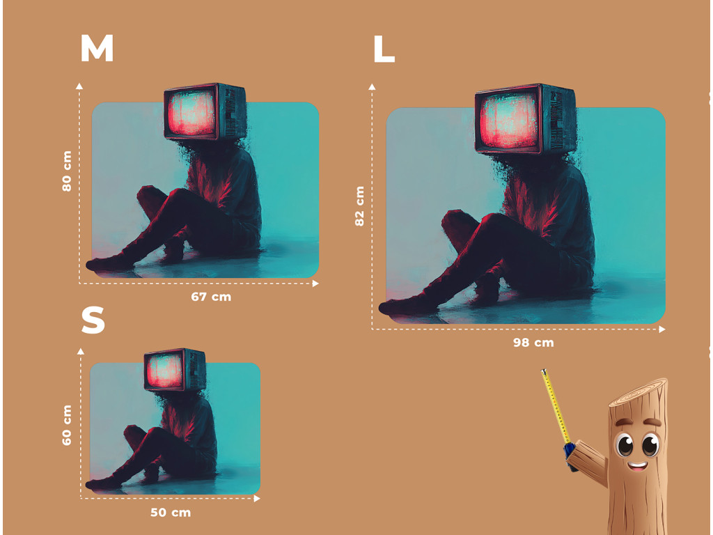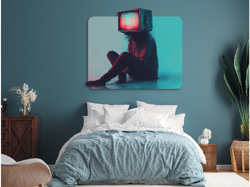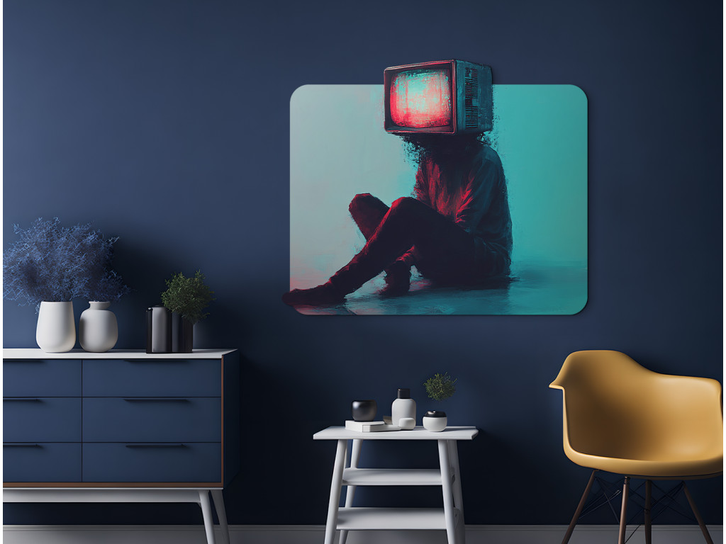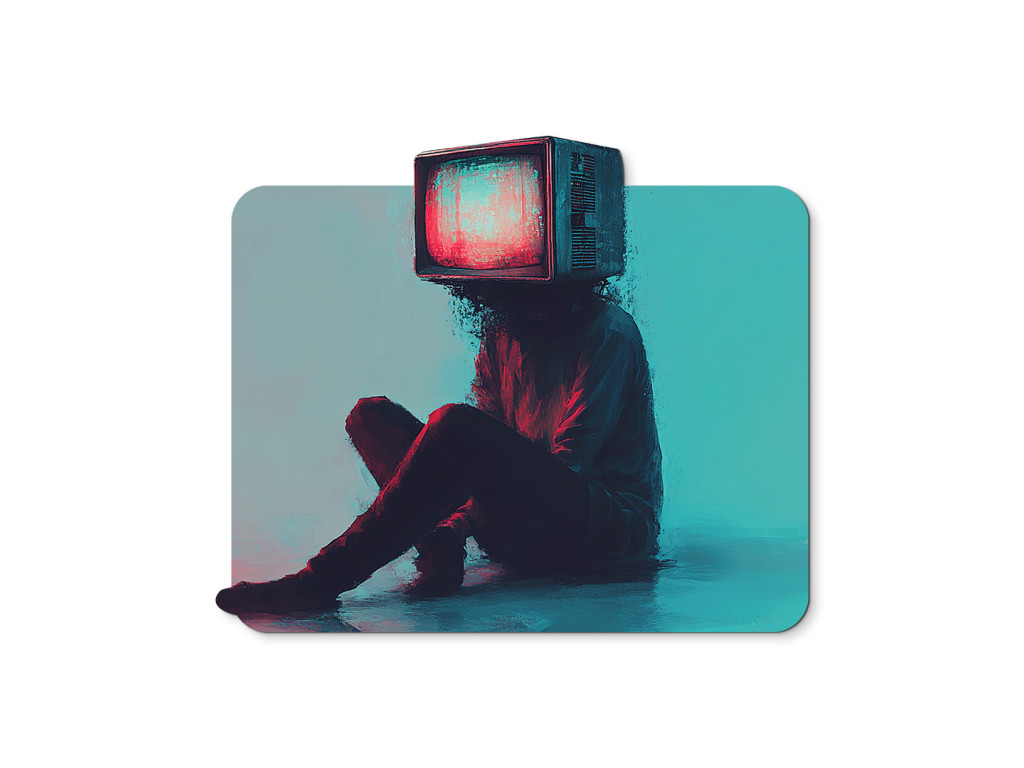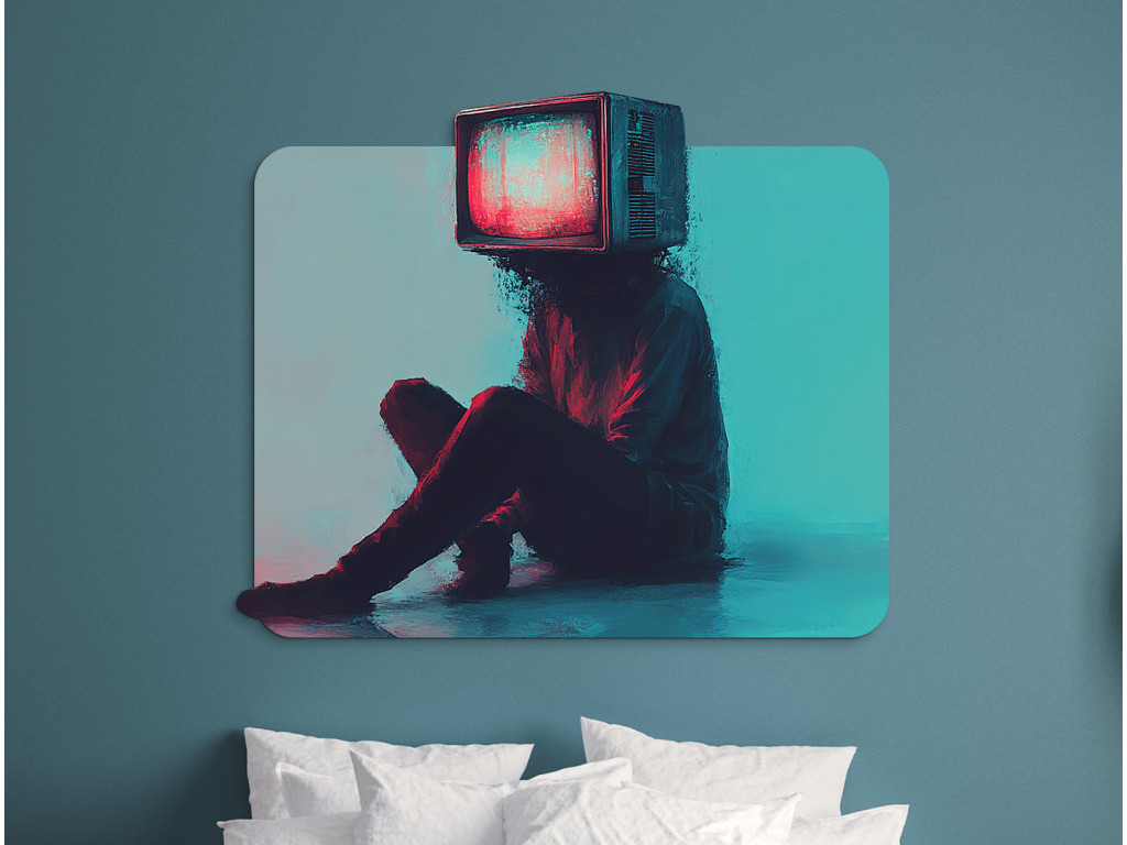 A kép egy földön ülő alakot ábrázol, akinek egy retró televízió a feje. A jelenetet kontrasztos kékesvörös fénnyel világítják meg, ami az elidegenedés, a média túlterhelés vagy az elszigeteltség érzését hangsúlyozza a digitális világban