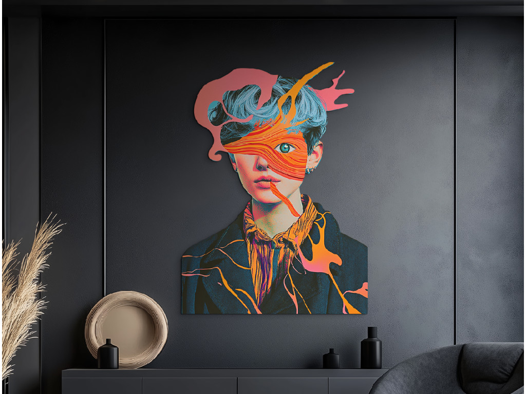 Egy kék hajú és átható zöld szemű alak kifejező portréja, amely absztrakt, színes formák rétegei alól emelkedik ki. Az arcon látható rózsaszín és narancssárga idomok feloldódott érzelmekként jelennek meg, mozgásban rögzítve.