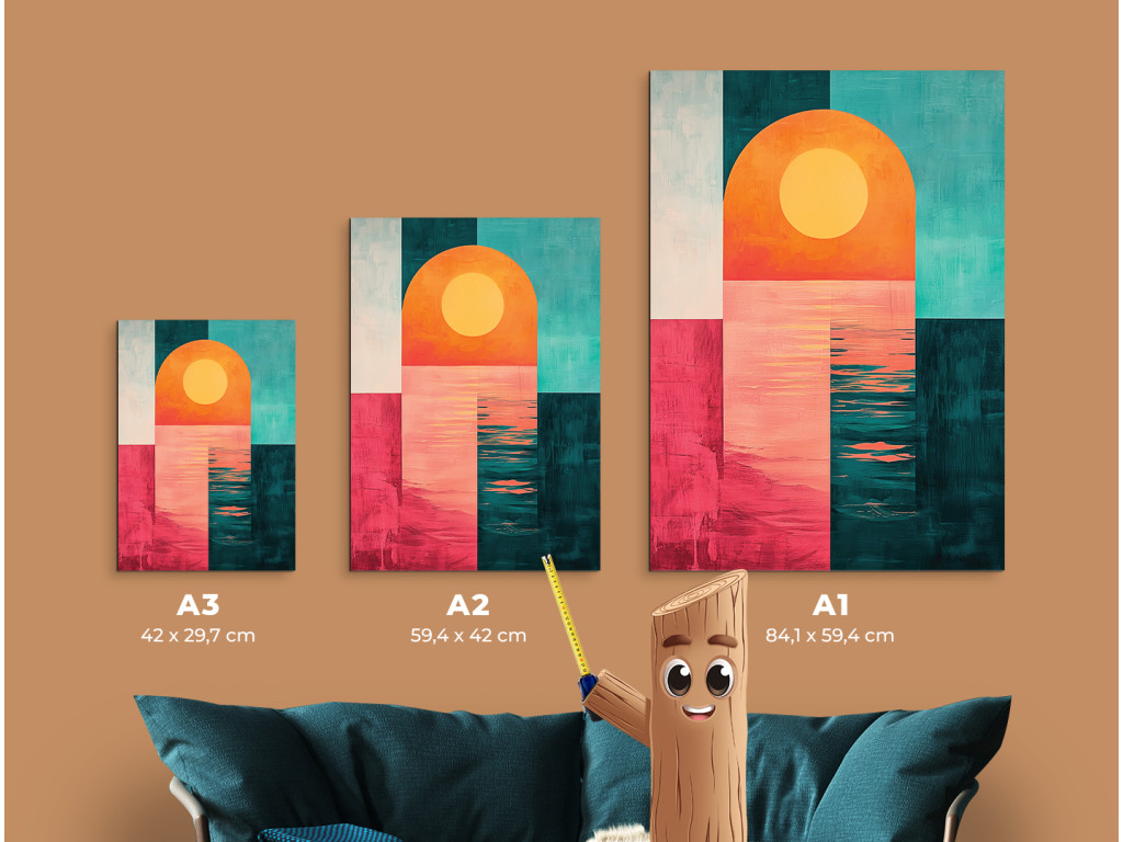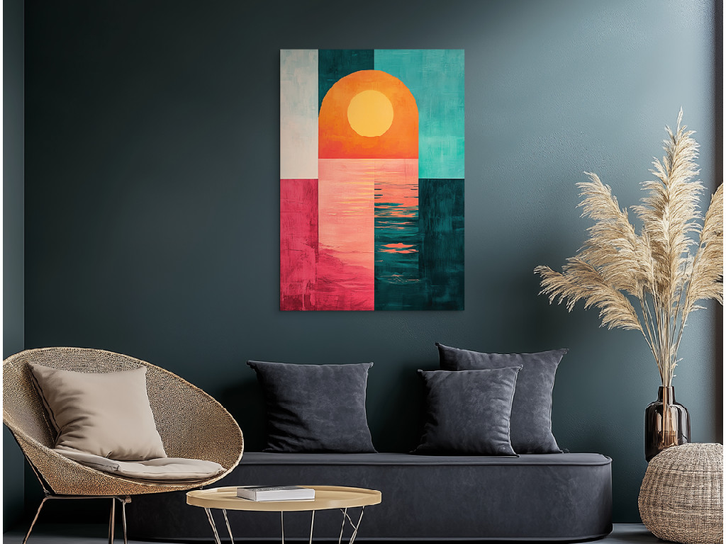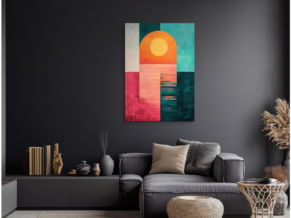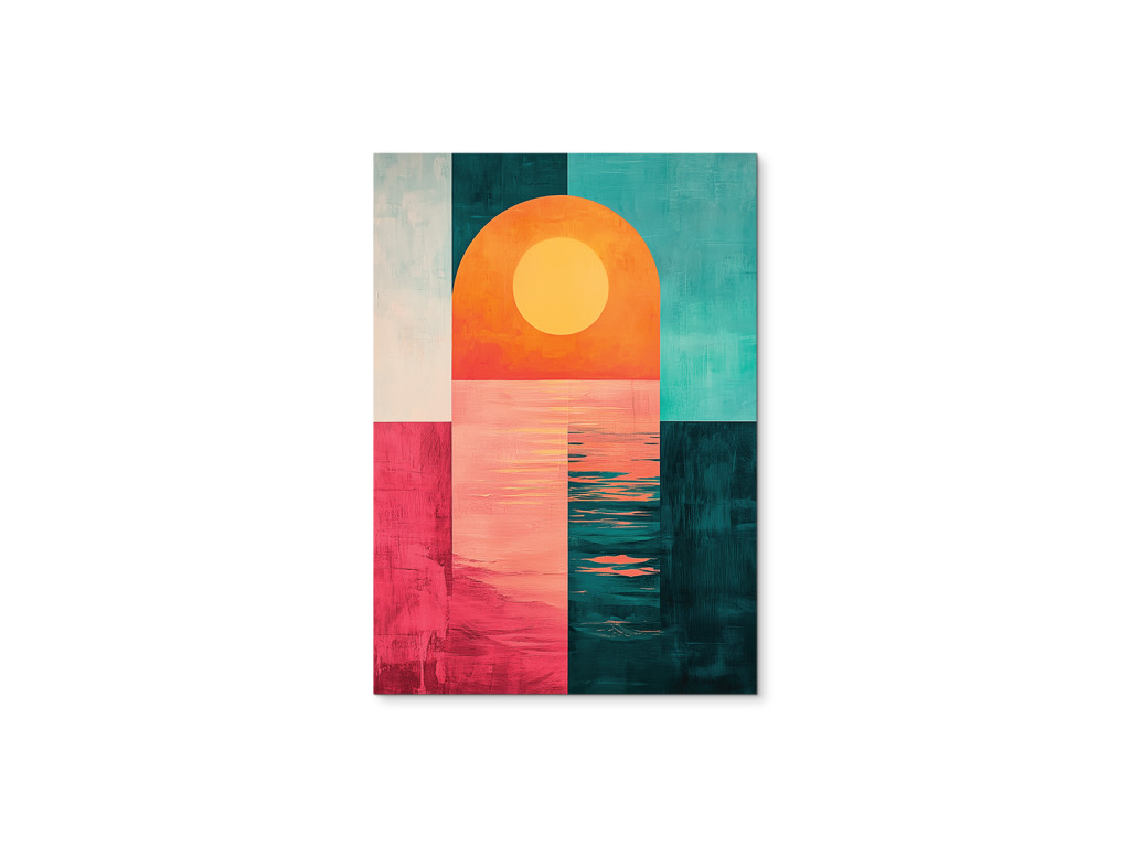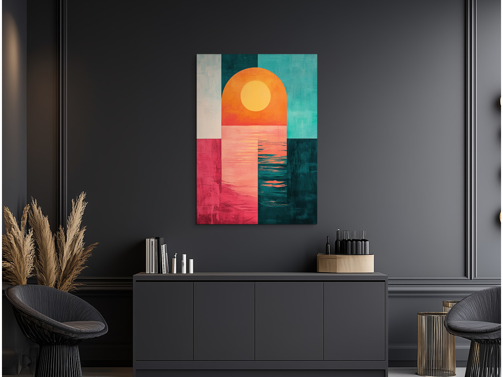 Az absztrakt alkotás geometrikus formákkal és élénk színekkel a víz feletti naplementét idézi. A meleg narancssárga és rózsaszín árnyalatok kontrasztban állnak a hűvös türkiz és sötétzöld tónusokkal, vizuálisan kiegyensúlyozott és harmonikus kompozíciót hozva létre.