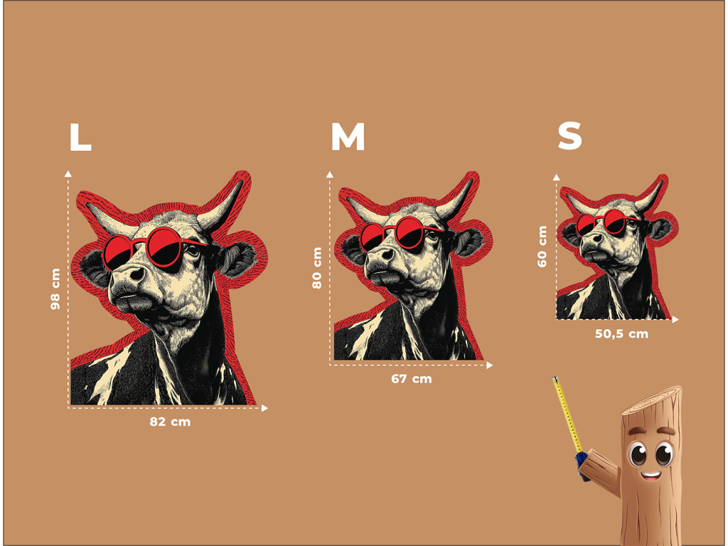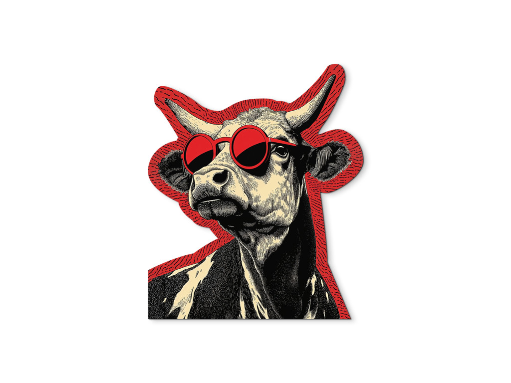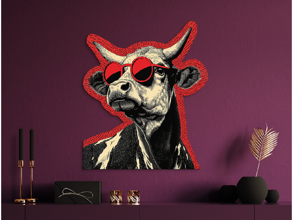 A Stílusos tehén falmatrica egy menő tehenet mutat feltűnő, piros, kerek napszemüveggel, amely modern és vicces megjelenést kölcsönöz, a hagyományos képzőművészeti stílus és a kortárs elem párosítása pedig játékos, eredeti kompozíciót hoz létre.
