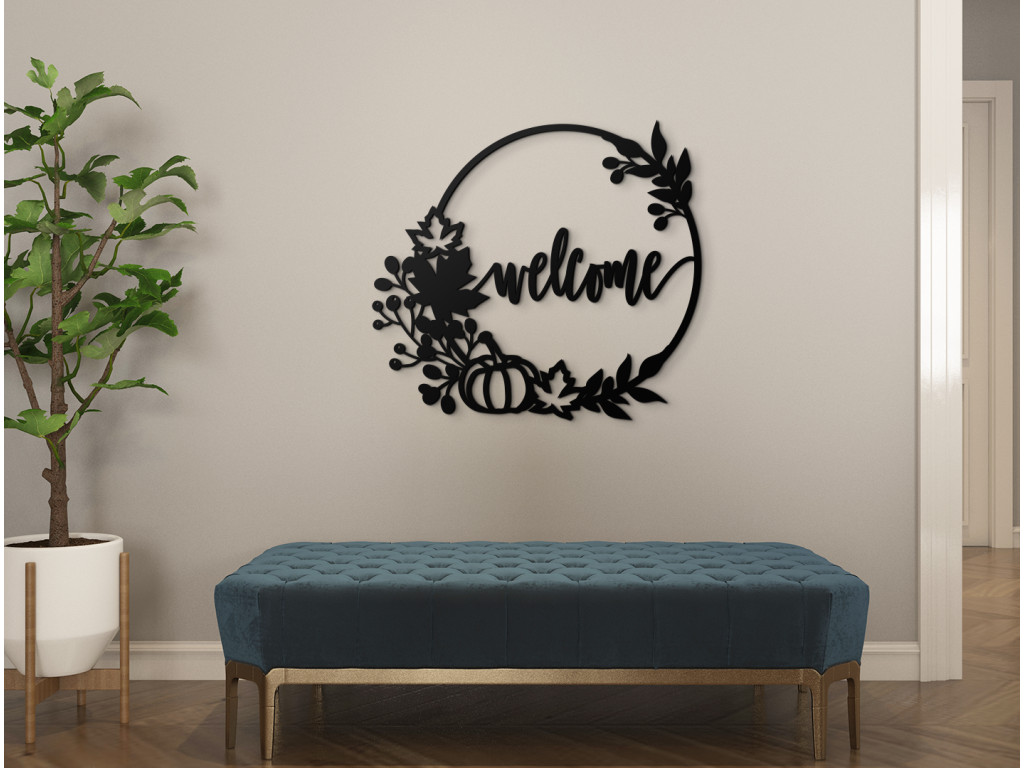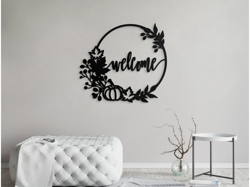 Üdvözölje vendégeit a Welcome felirattal. A fakoszorút ezzel a felirattal az előszobában, folyosón helyezheti el az ajtón. A felirat egy őszi témájú fakoszorú közepén található. A dekoráció alkalmas modern és minimalista terekbe.