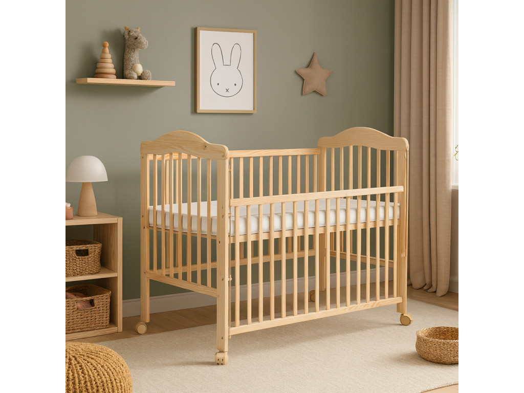 A tömör fenyőből készült kiságy mindkét oldalán 4 pontos rendszerrel ellátott lehúzható mechanizmussal, két pozícióban állítható rácsos kerettel és lehajtható oldallal rendelkezik, így minden gyermek számára adaptálható.