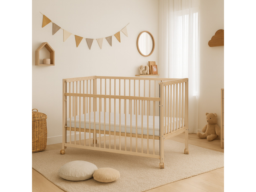A kiváló minőségű fenyőfából készült, felületkezelés nélküli gyermek fa kiságy klasszikus formájú, lehúzható oldallal. Biztonságos és stabil, garantálja a biztonságos alvást 3 éves korig.