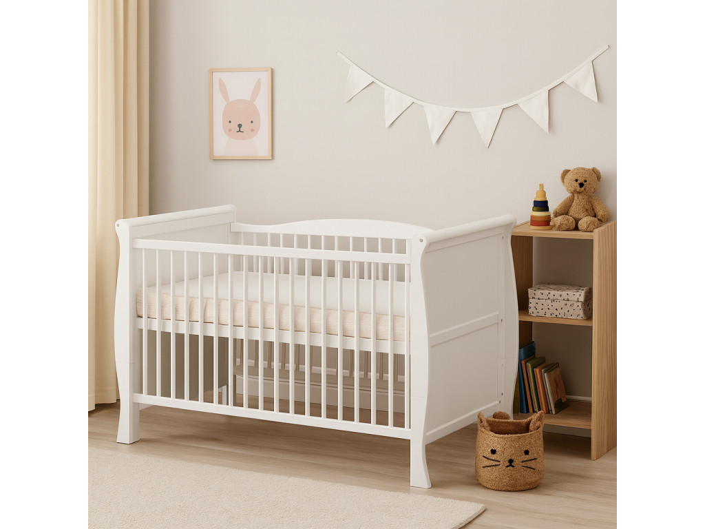 A kiságy prémium minőségű fenyőfából készült, és eleganciát kölcsönöz a gyerekszobának. Különleges formájával és eltávolítható rácsaival a kiságy nemcsak praktikus, hanem stílusos is. Stabil és biztonságos, így több generáció számára is ideális választás lehet.