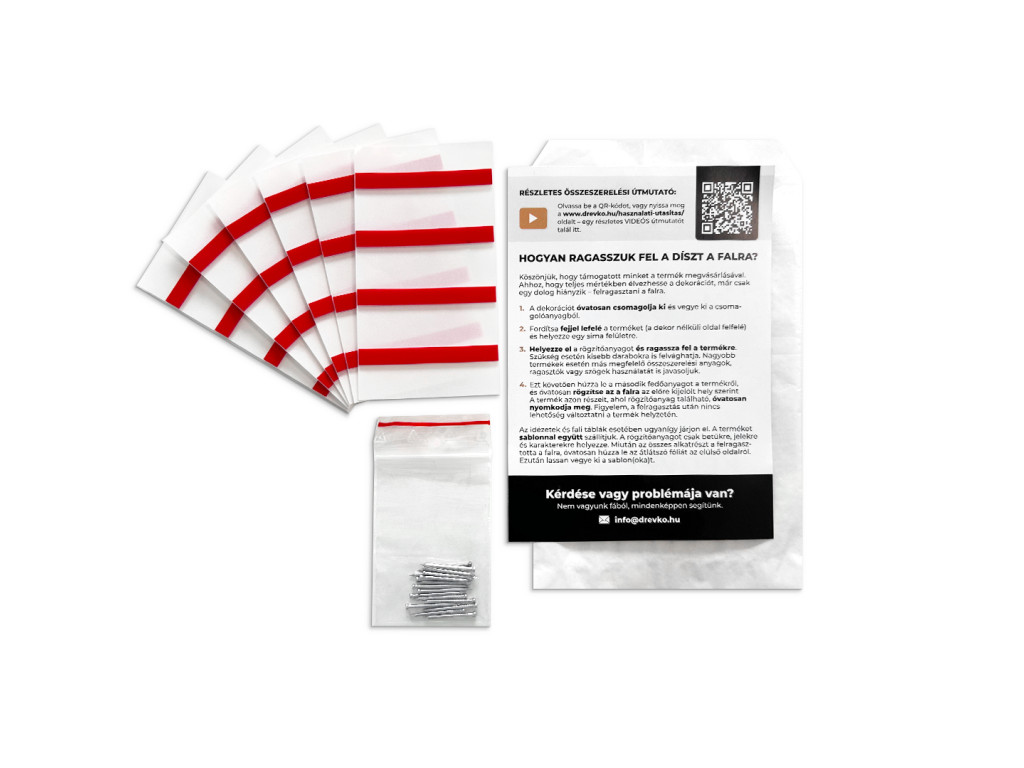 A csomag tartalmazza a képek falra rögzítéséhez szükséges összes rögzítőanyagot - kétoldalas habszalagot és acélszögeket. Egyszerű és praktikus megoldás otthoni használatra.