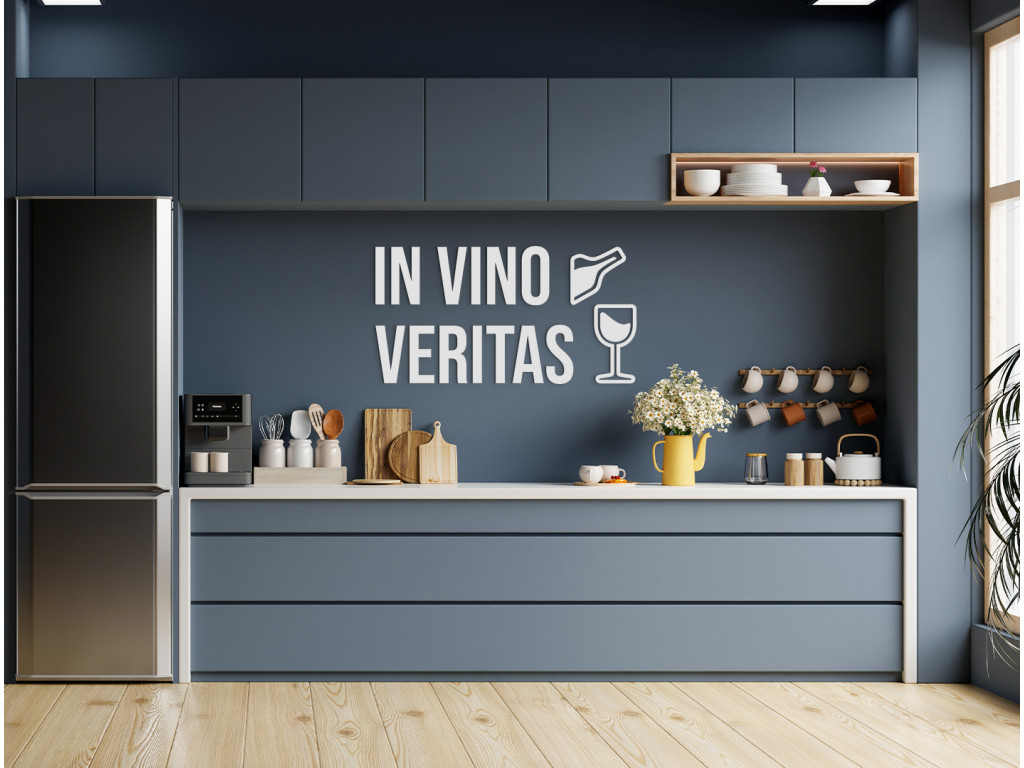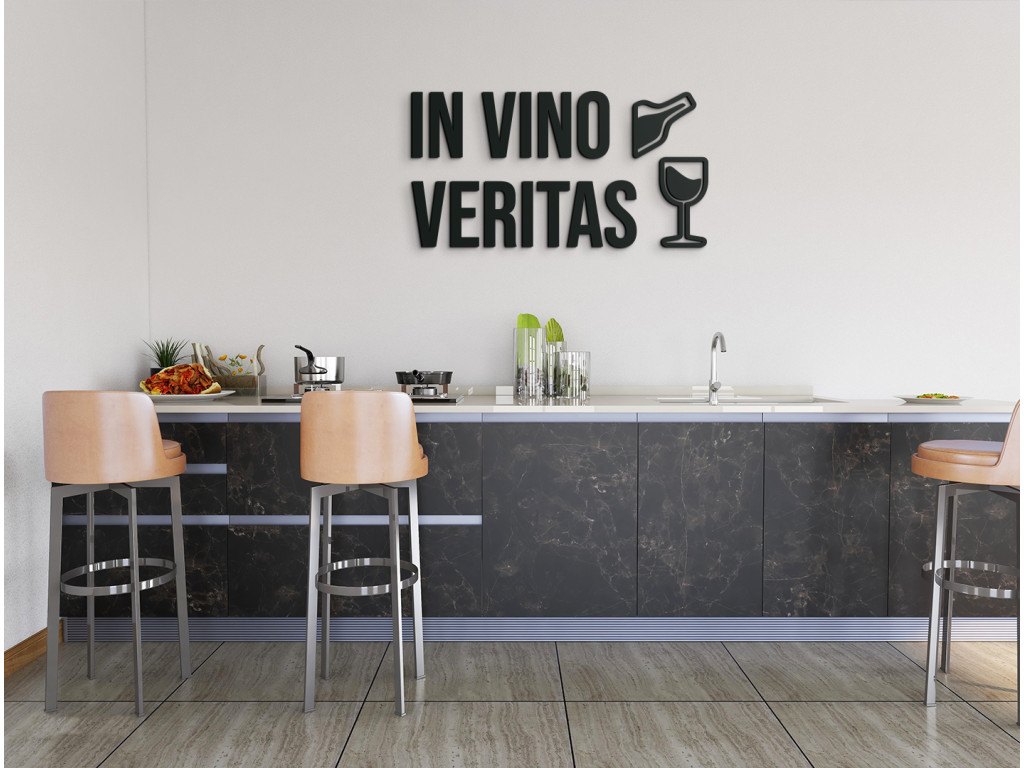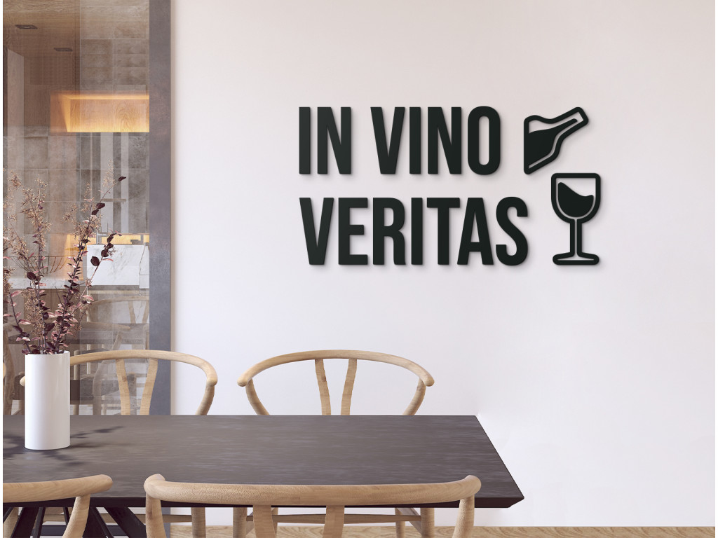 Az In vino veritas dekoráció újjáéleszti a nappali, borospince vagy a borozó fénytelen falait. A fából készült matrica lenyűgöző dizájnja első pillantásra megragadja a figyelmet. Több méret és dekor közül válogathat, így könnyedén hozzáillesztheti a feliratot bútorokhoz és egyéb lakberendezési tárgyakhoz.