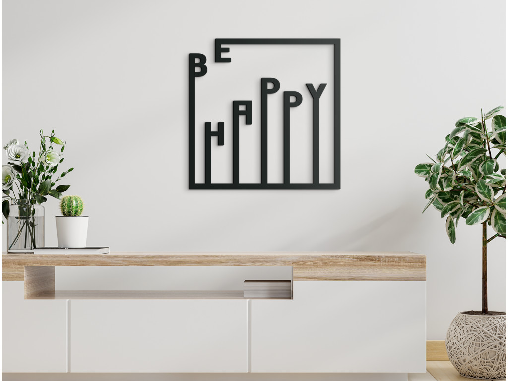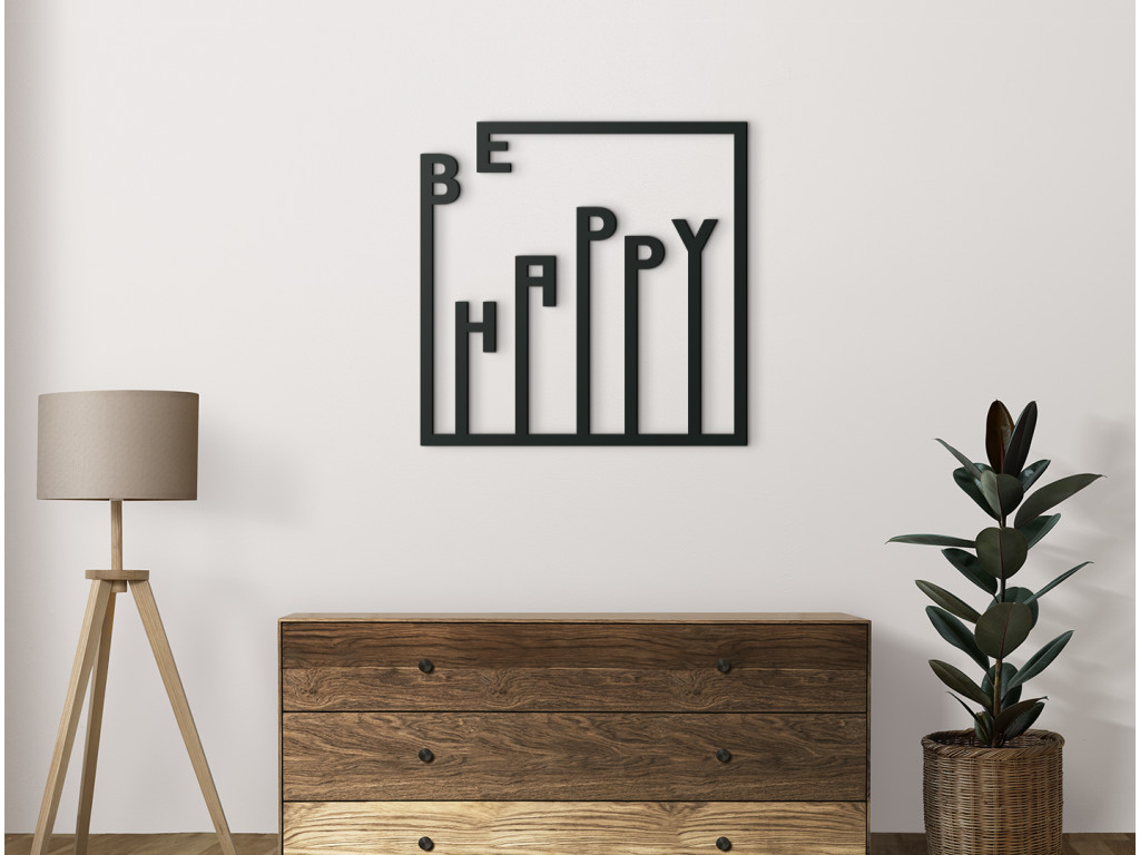 A pozitív üzenetet sugárzó Be happy felirat egyedi hangulatot teremt a szobában. A felirat egy keretben van elhelyezve, amelyet a „Be” felirat hoz létre. A dekoráció alkalmas modern és minimalista terekbe, mint például folyosó, dolgozószoba, hall, iroda.