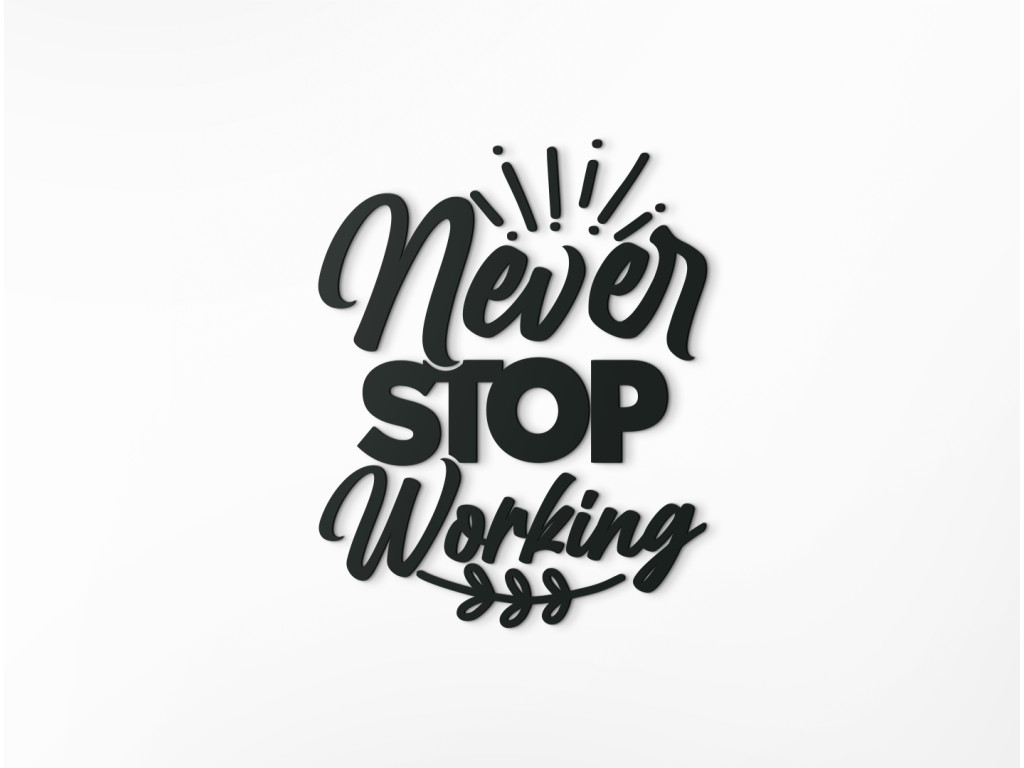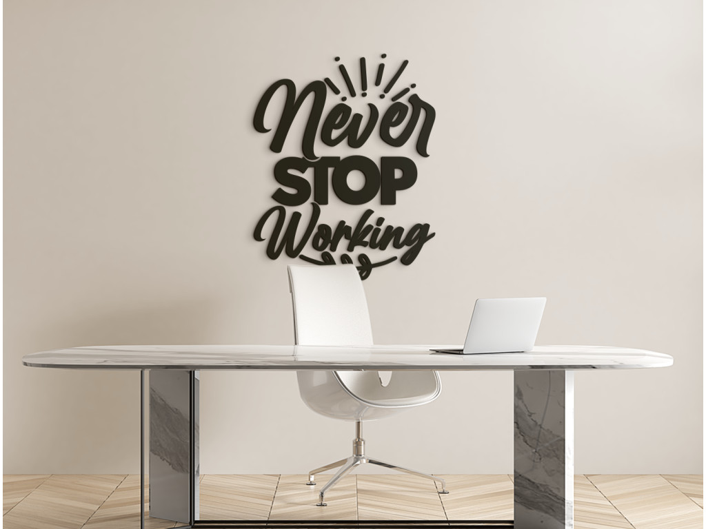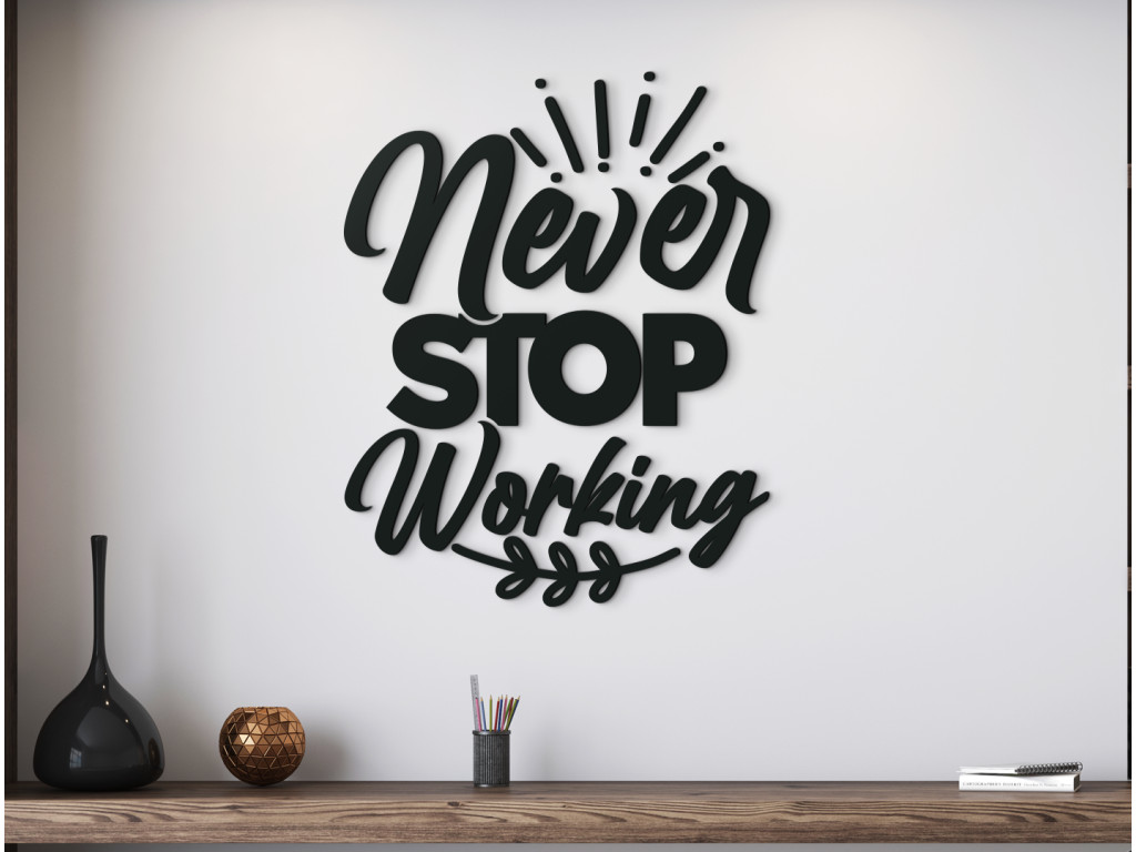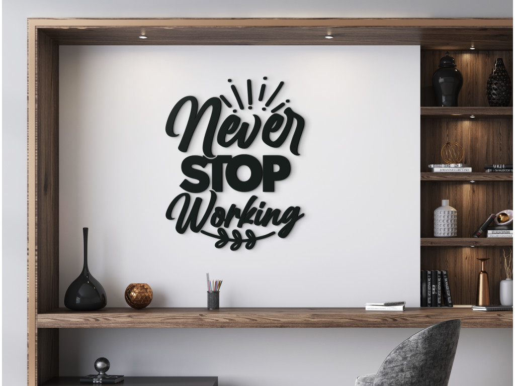 A kreatív fa dekoráció különböző típusú betűtípusokból, díszítőelemekből és levelekből áll. A játékos dizájn egy motivációs ötlettel párosul, amely minden alkalommal új lendületet adhat iskolába vagy munkába induláskor Az angol „Never stop working” idézet ideális jól látható helyen, például irodában, otthoni edzőteremben, diák- vagy kollégiumi szobában történő elhelyezéshez.