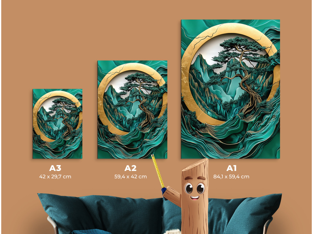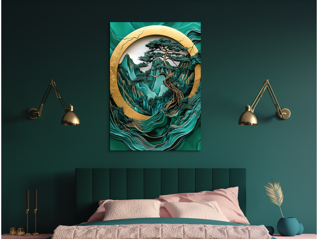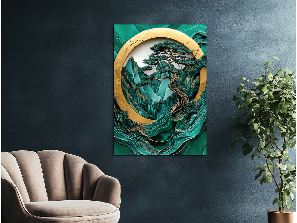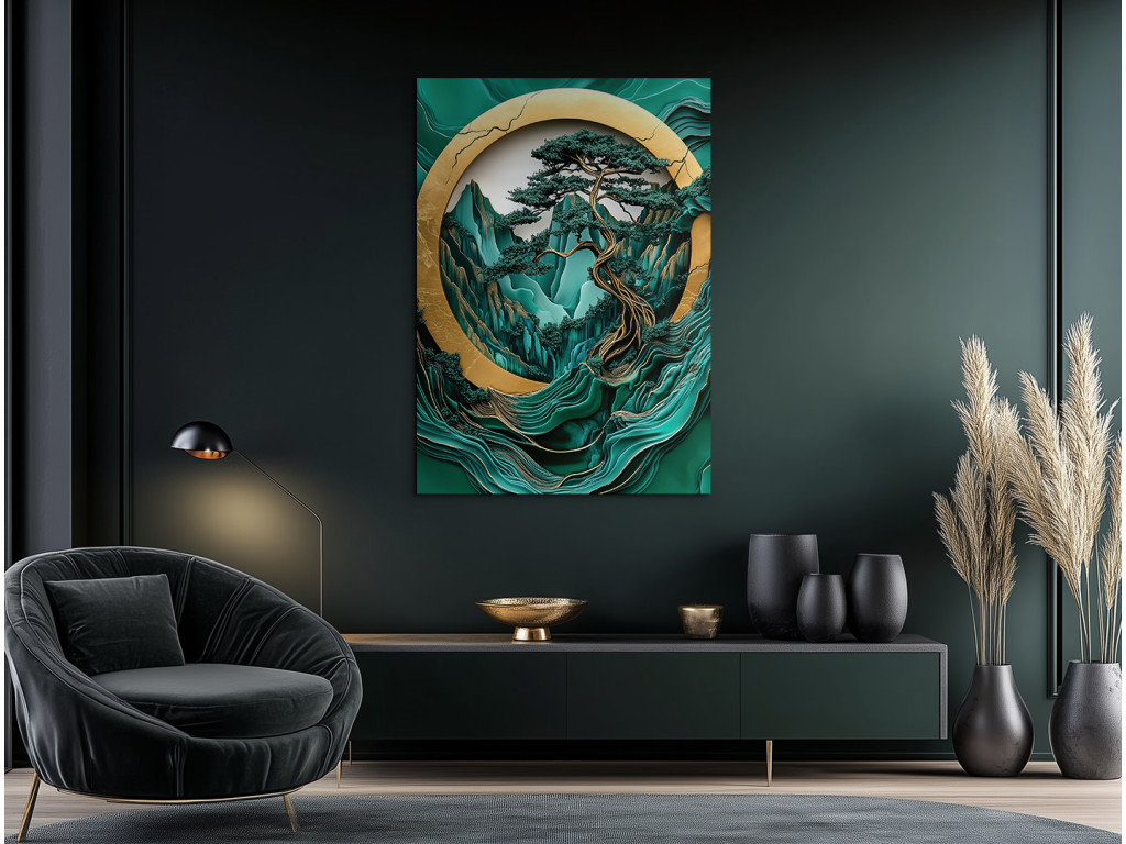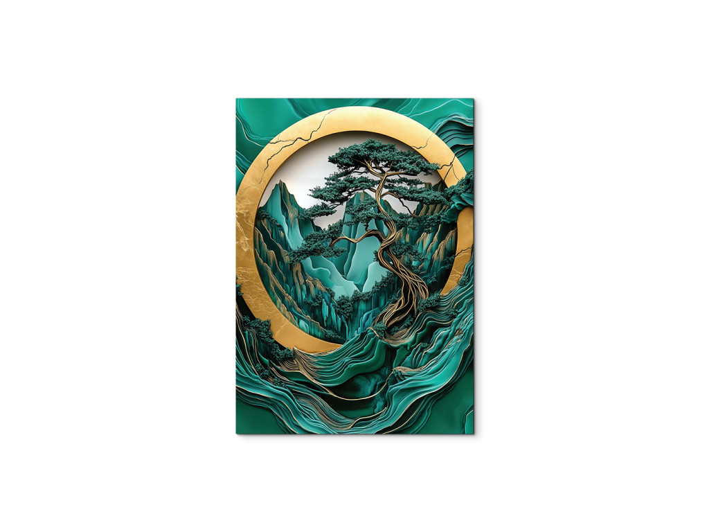 Az Élet Kapuja egy modern műalkotás, amely a természetet ötvözi a spirituális szimbolikával. Középpontjában egy fenséges fa áll, elágazó koronával és erős gyökerekkel, mintha maga a föld része lenne. Egy arany kör veszi körül – az örökkévalóság és az egyensúly szimbóluma –, amely egy másik, békés világba vezető kapu benyomását kelti.