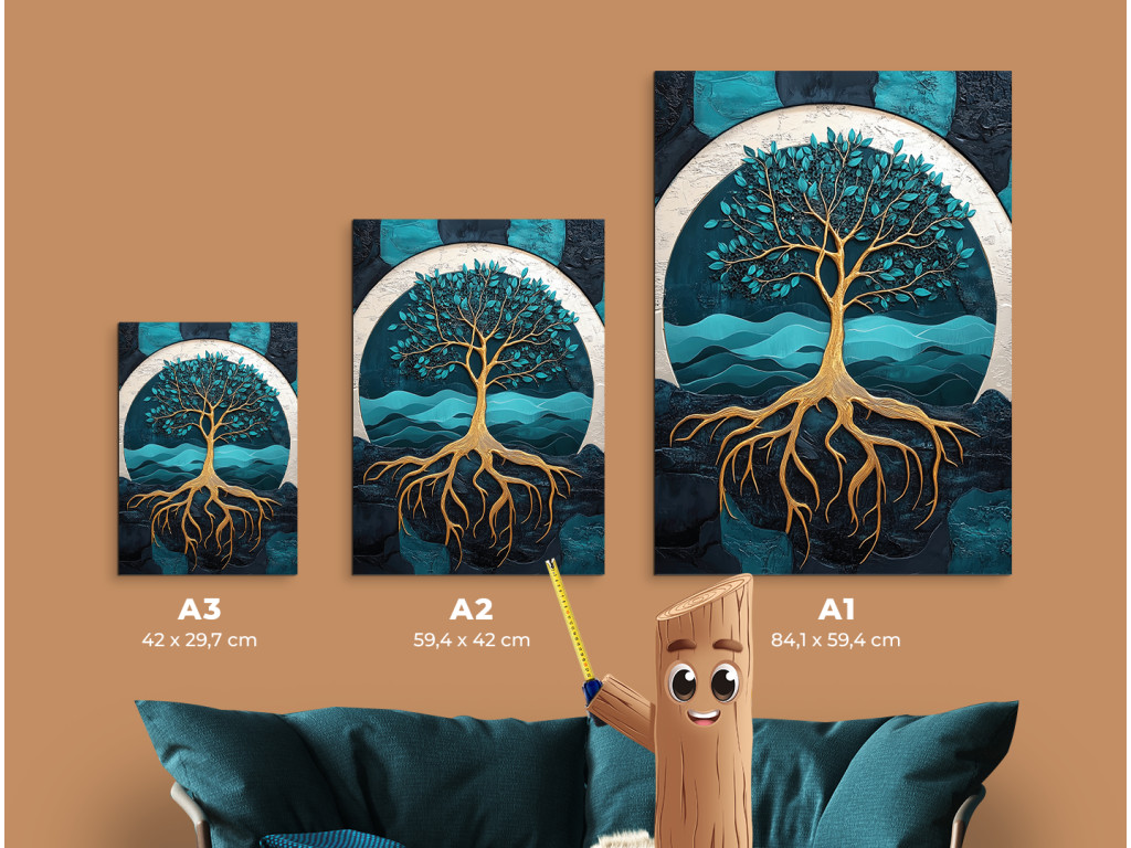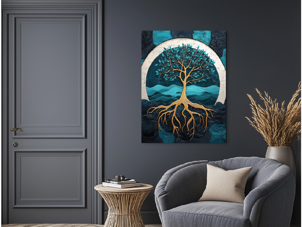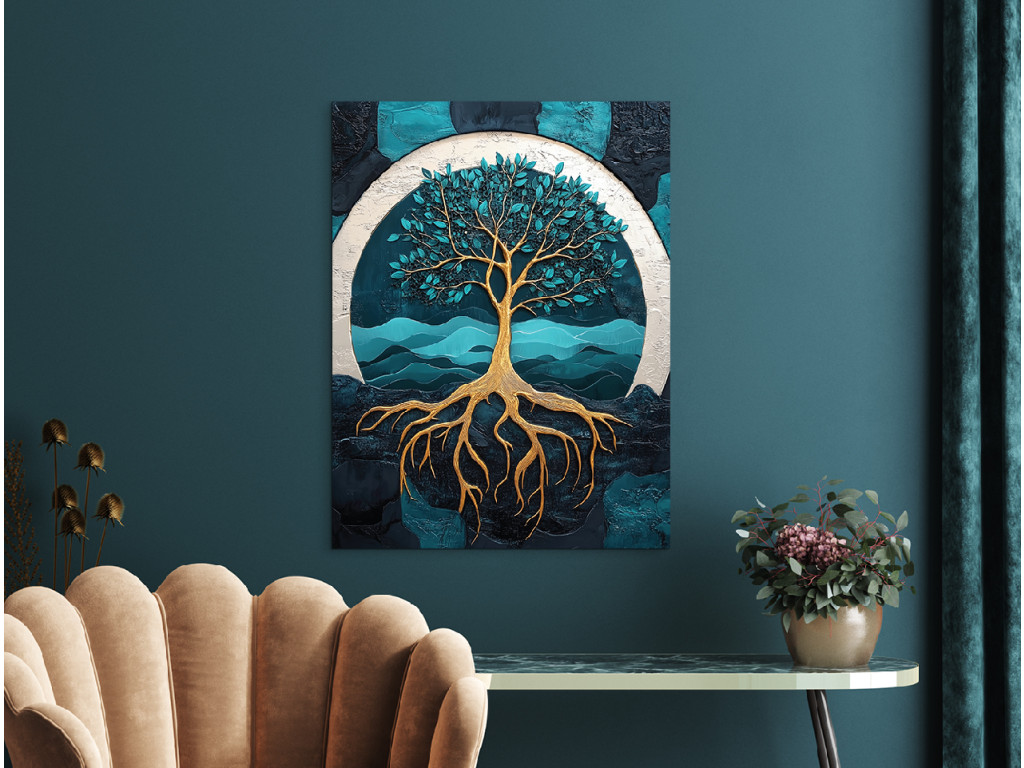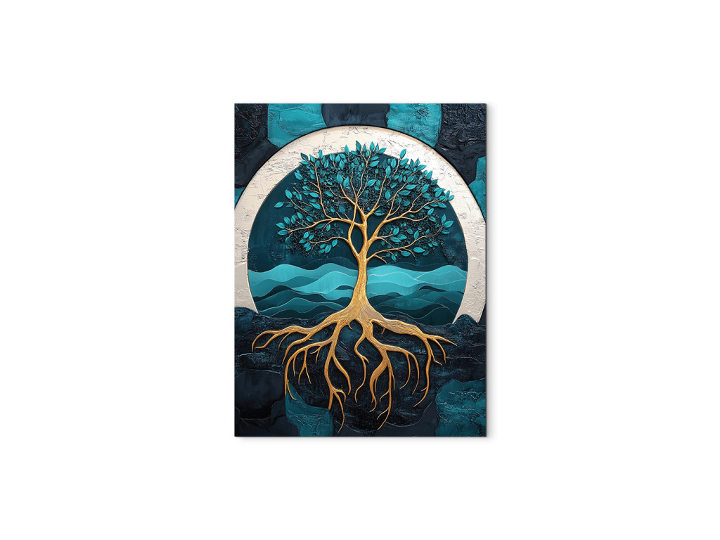 A markáns gyökerek és az aranyló korona erőteljes szimbólumot alkotnak az ég és a föld kapcsolatáról. A türkiz‑kék háttér finom ívei a nyugalom és harmónia érzetét keltik. A felületi textúra és az arany részletek mélységet, művészi karaktert és természetes energiát adnak a képnek.