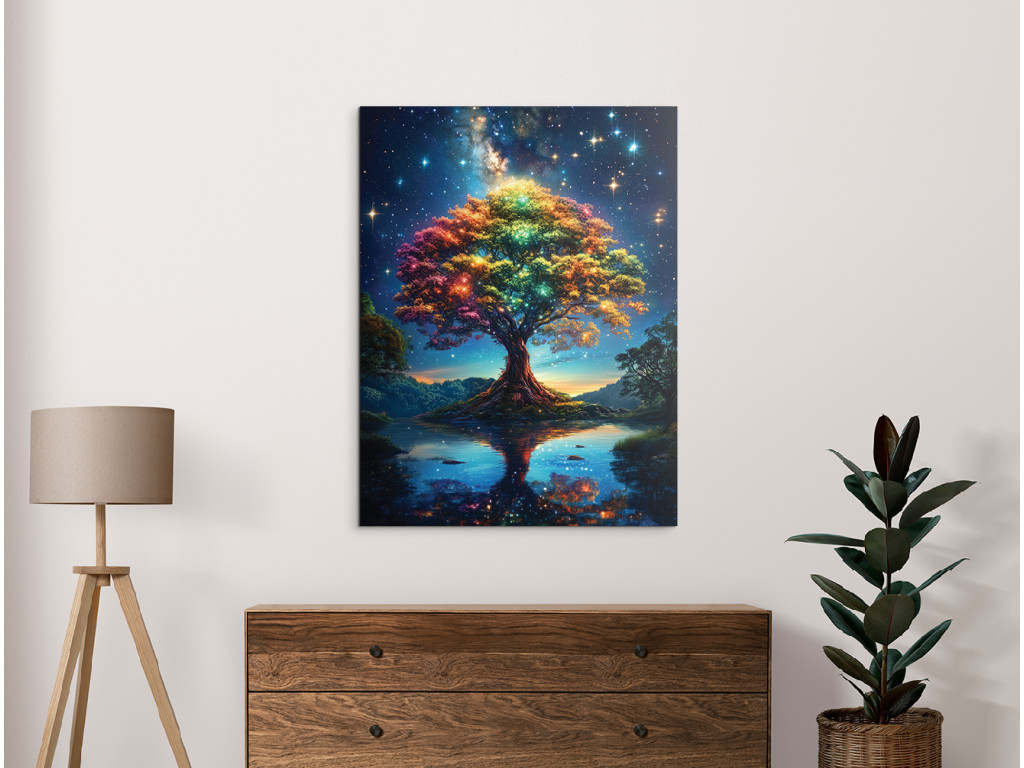 A színes életfa csillagos égbolt előtt áll, hídként a világegyetem és a föld között. Sziluettje a víztükörben tükröződik, nyugodt, álomszerű kompozíciót teremtve. A kép inspirációt, csendet és spirituális dimenziót hoz a térbe.