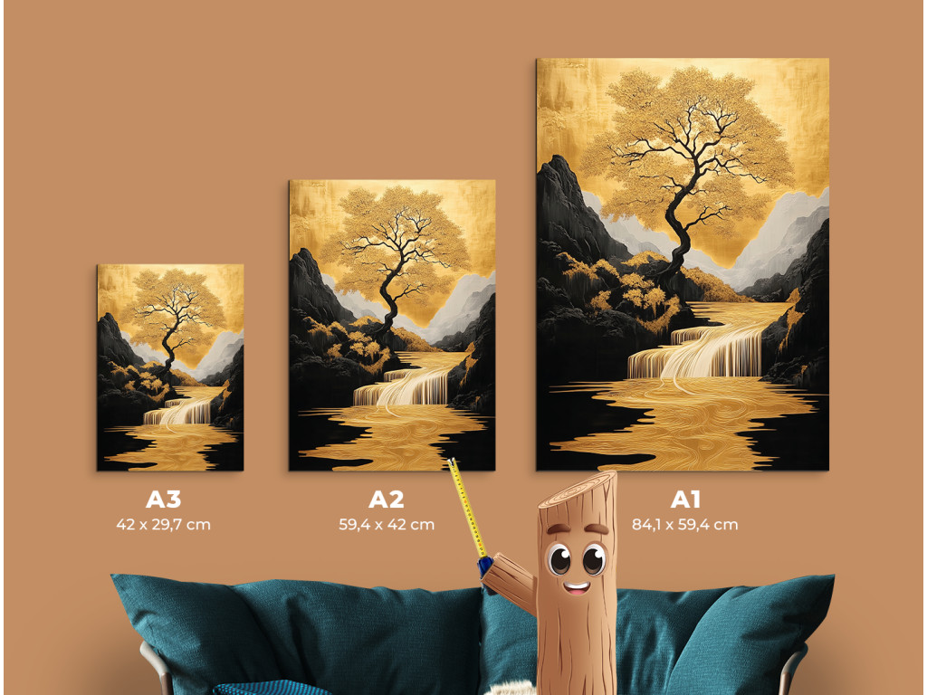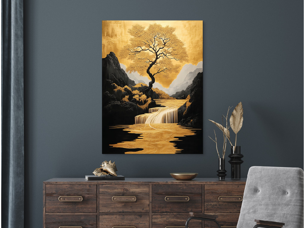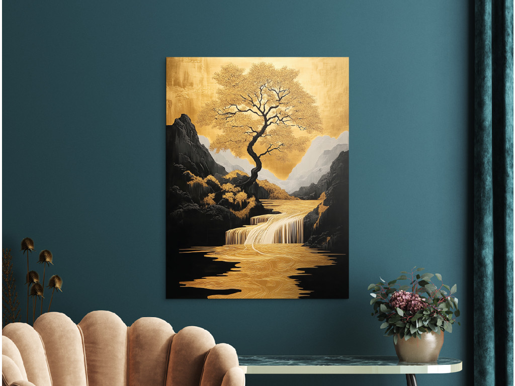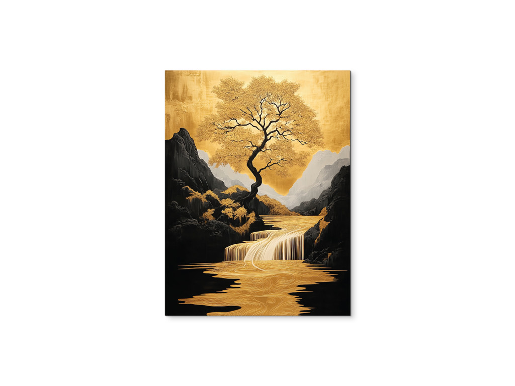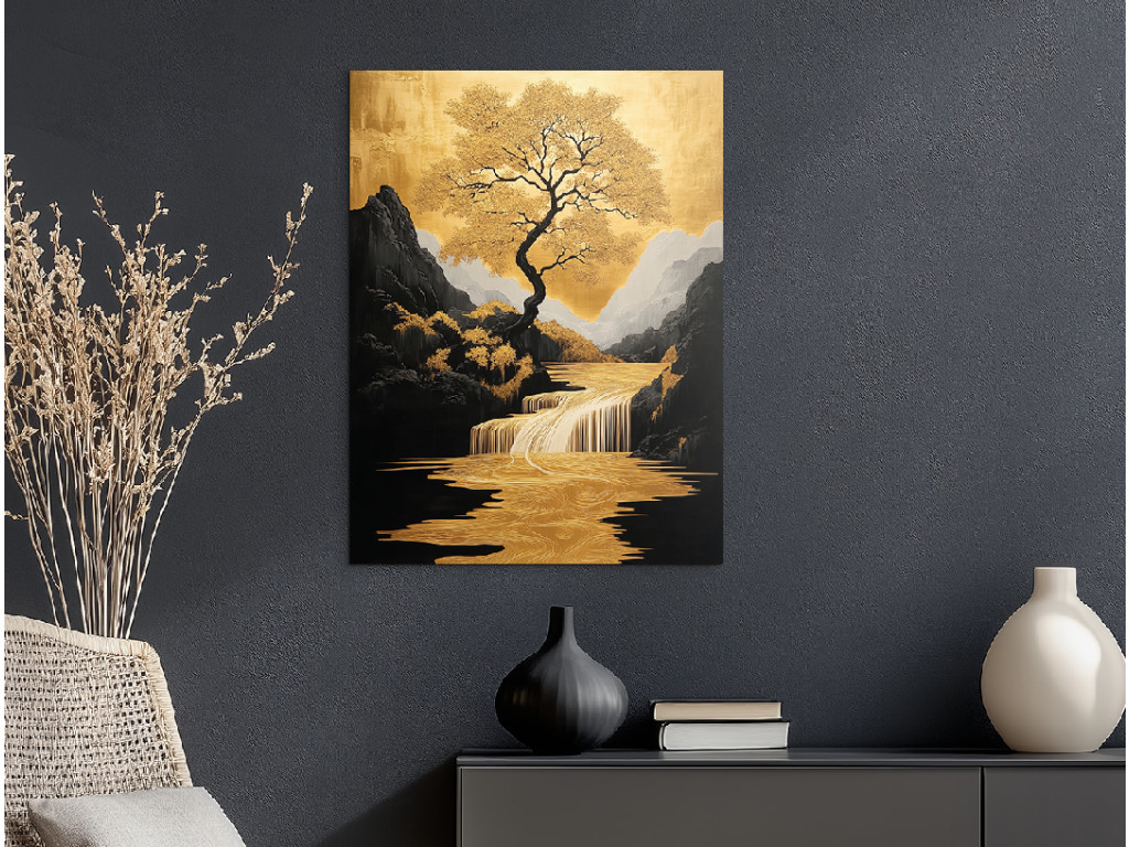 Az Életfa Völgy kép közepén egy fenséges fa áll aranyló levelekkel, stilizált tájban, ahol a folyó és a vízesés ugyanazon arany árnyalatokban ragyog. A sötét hegyek és a békés égbolt kontrasztot alkotnak a természet meleg tónusaival, így a mű elegáns és karakteres központi elemmé válik az enteriőrben.