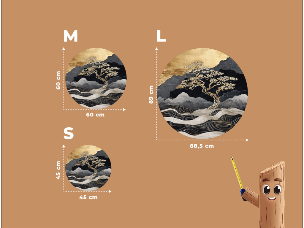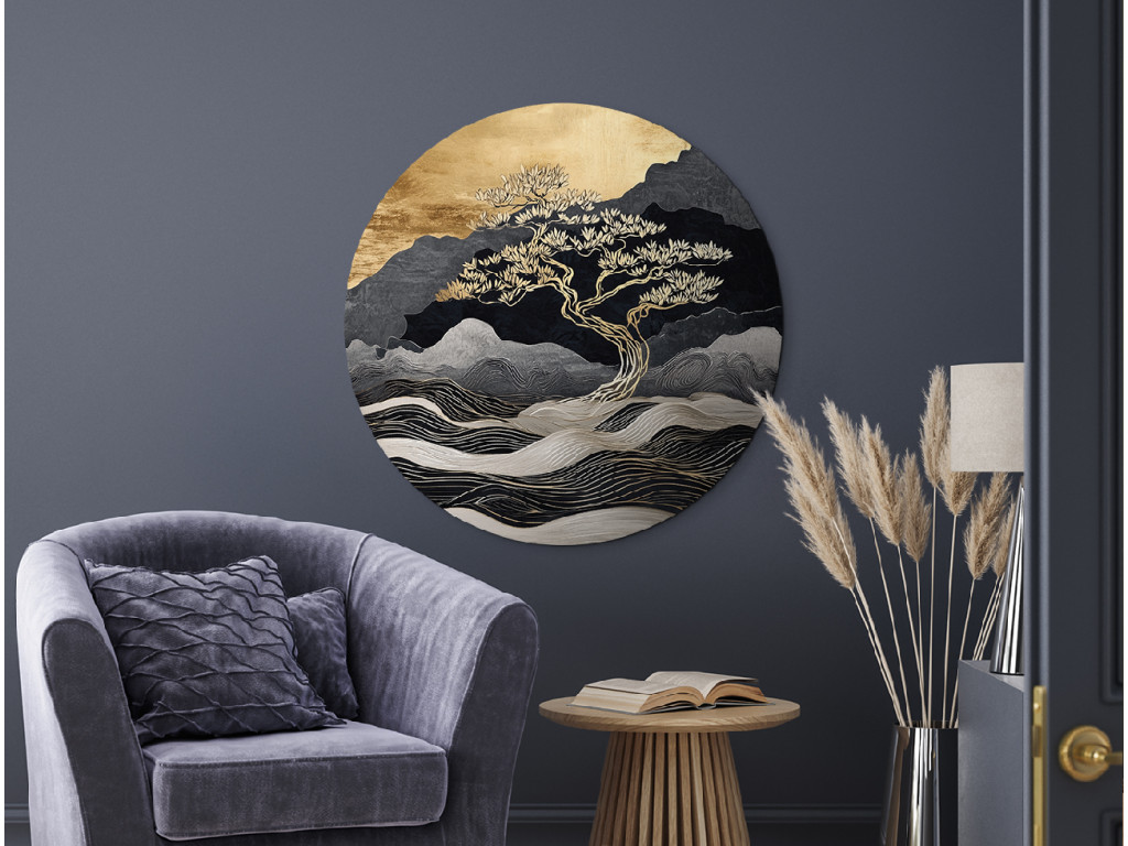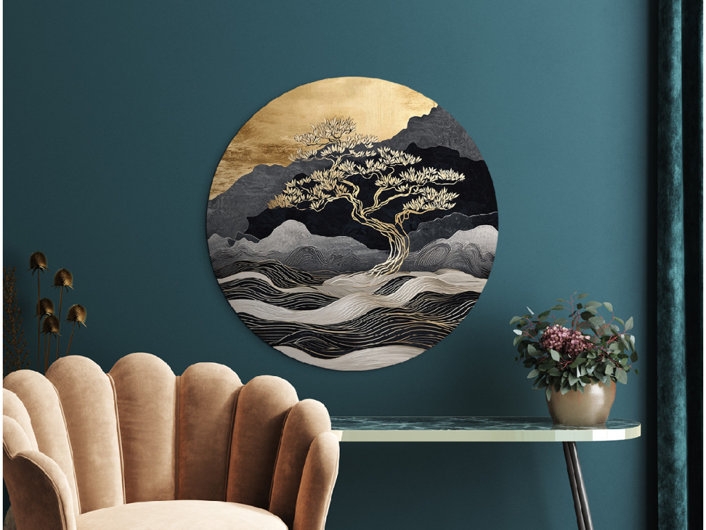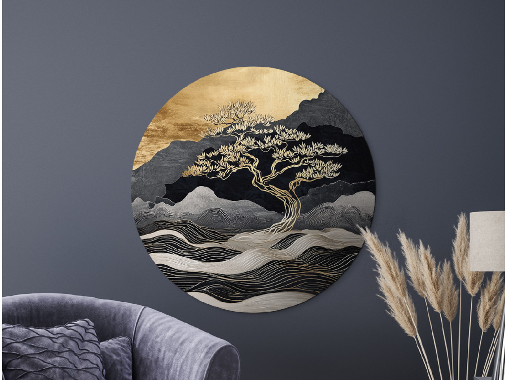 Domináns arany fa absztrakt táj előtt, ahol hullámzó vonalak idéznek hegyeket vagy vizet. A finoman izzó felső rész a naplemente hangulatát hozza, a modern megjelenés nyugodt és meditatív hatású, enyhe ázsiai esztétikával.