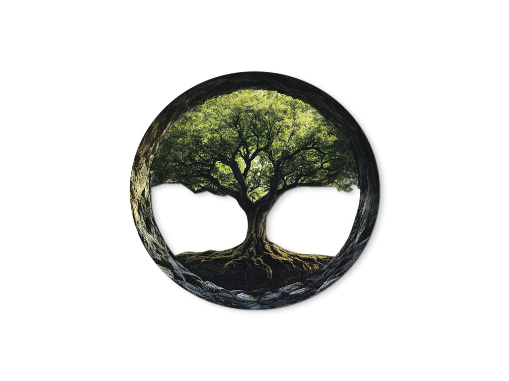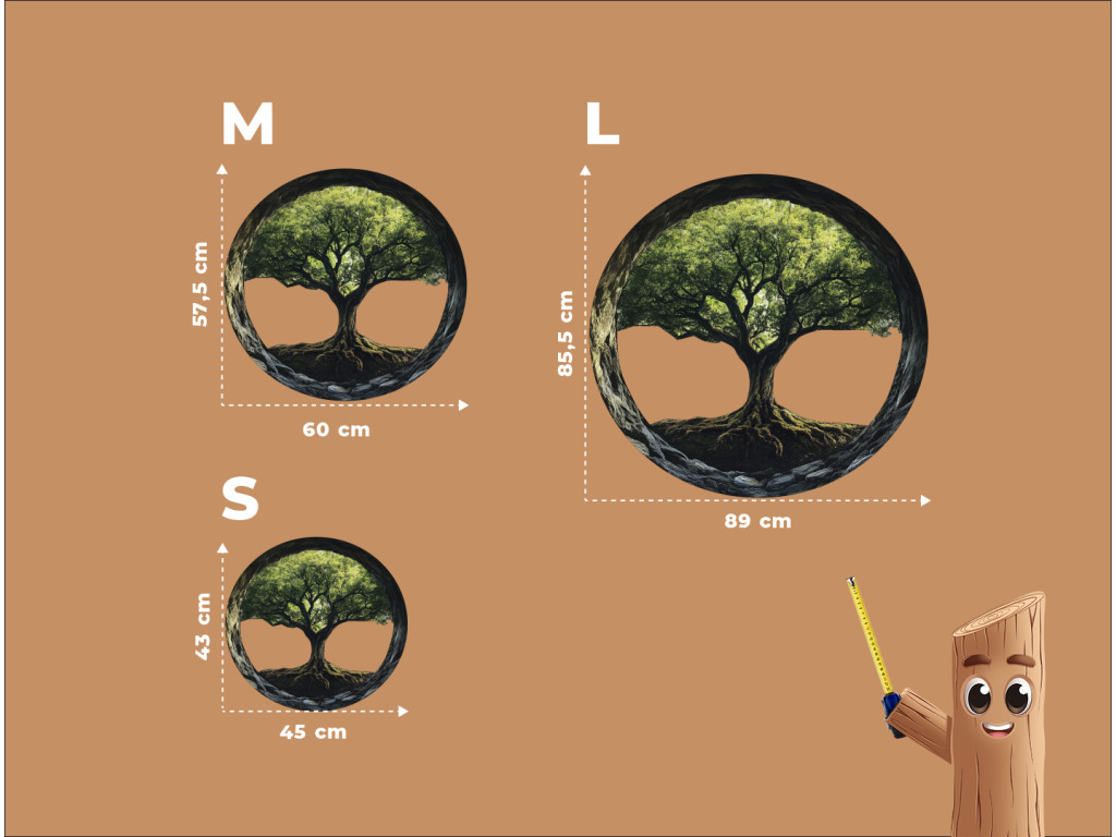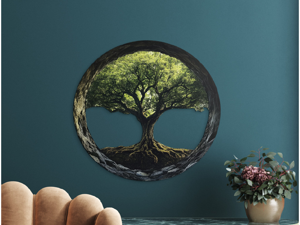 A fa összefonódó gyökerei és koronája a végtelen körforgást és a mindenség kapcsolódását jelenítik meg. A sötét keret kiemeli a központi motívumot, nyugodt, kiegyensúlyozott karaktert adva a kompozíciónak.