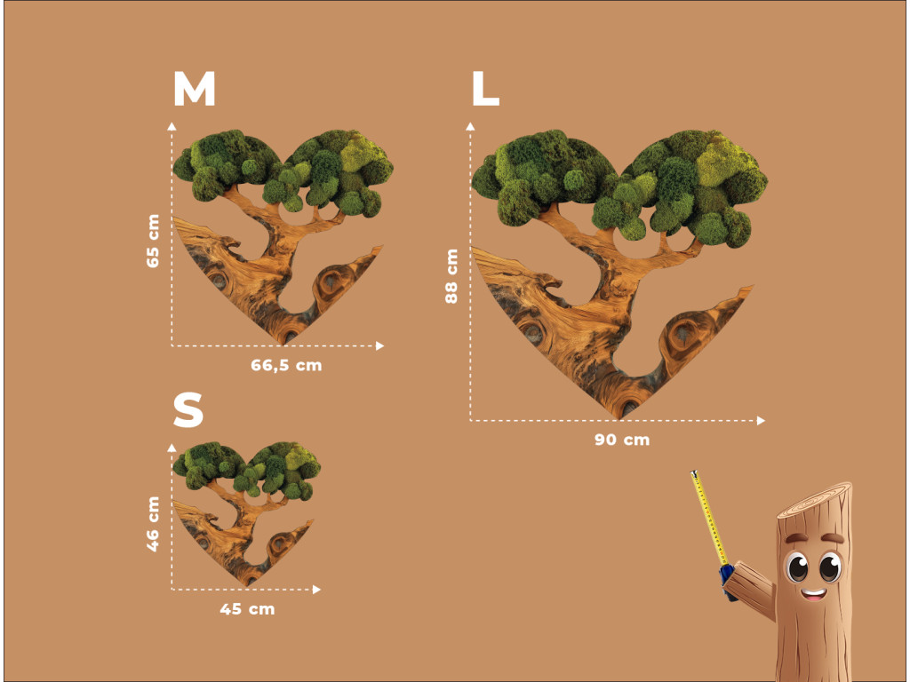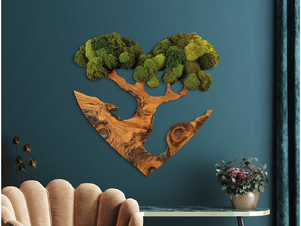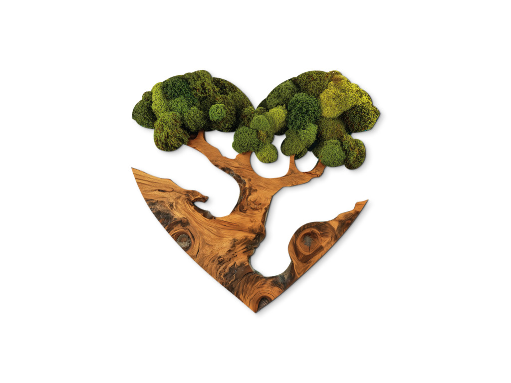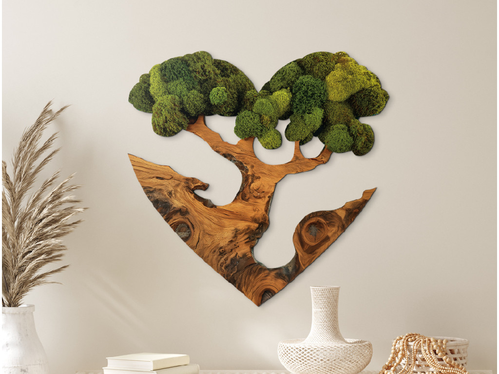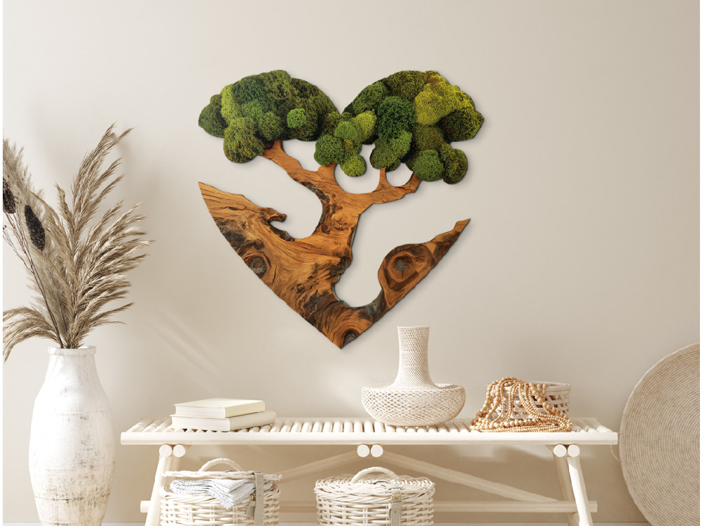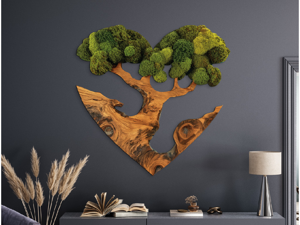 A Moha Életfa Szív egy egyedi festmény, amelyen az élet szimbóluma a szerelem szimbólumával van kombinálva. A fa szív alakú térben van faragva, sűrű zöld koronája mohára hasonlít, gyökerei pedig harmonikus kapcsolatot hoznak létre. A modern UV nyomtatásnak köszönhetően a festmény realisztikusnak tűnik, ugyanakkor hosszú élettartamot, nulla karbantartást és kedvezőbb árat kínál a klasszikus mohás alkotásokhoz képest.