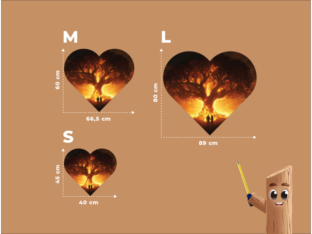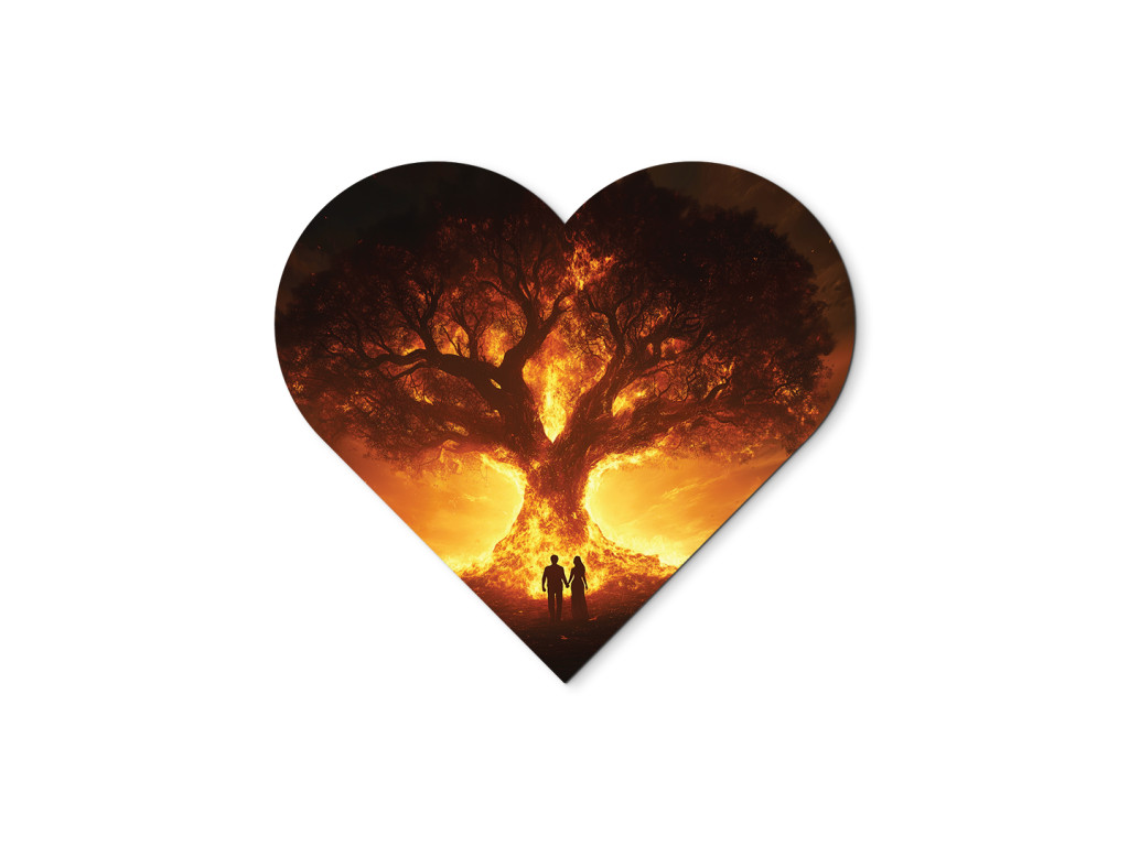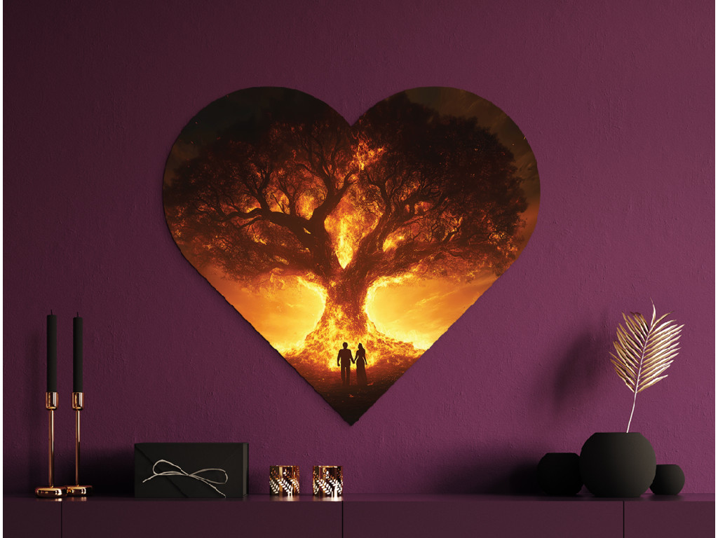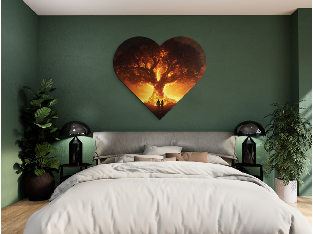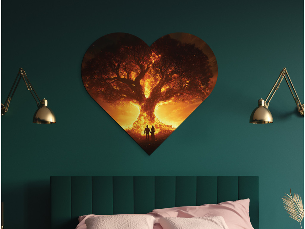A fénylő, narancs és sárga tónusú fa melegséget, szenvedélyt és a kapcsolódás erejét idézi. A fa alatt kézen fogva álló két sziluett a szerelmet, az egységet és a közös utat jelképezi. A szív alakú, lángoló naplemente különlegessé teszi a dekorációt a hálószobába vagy a nappaliba.