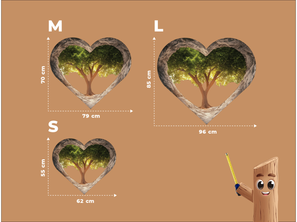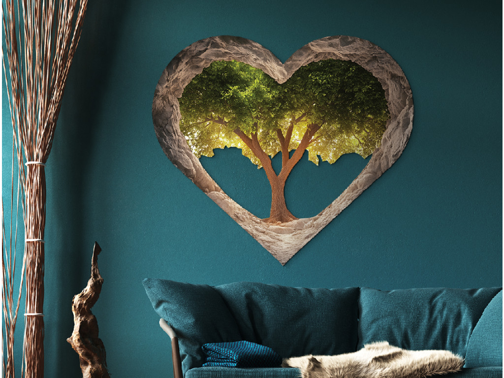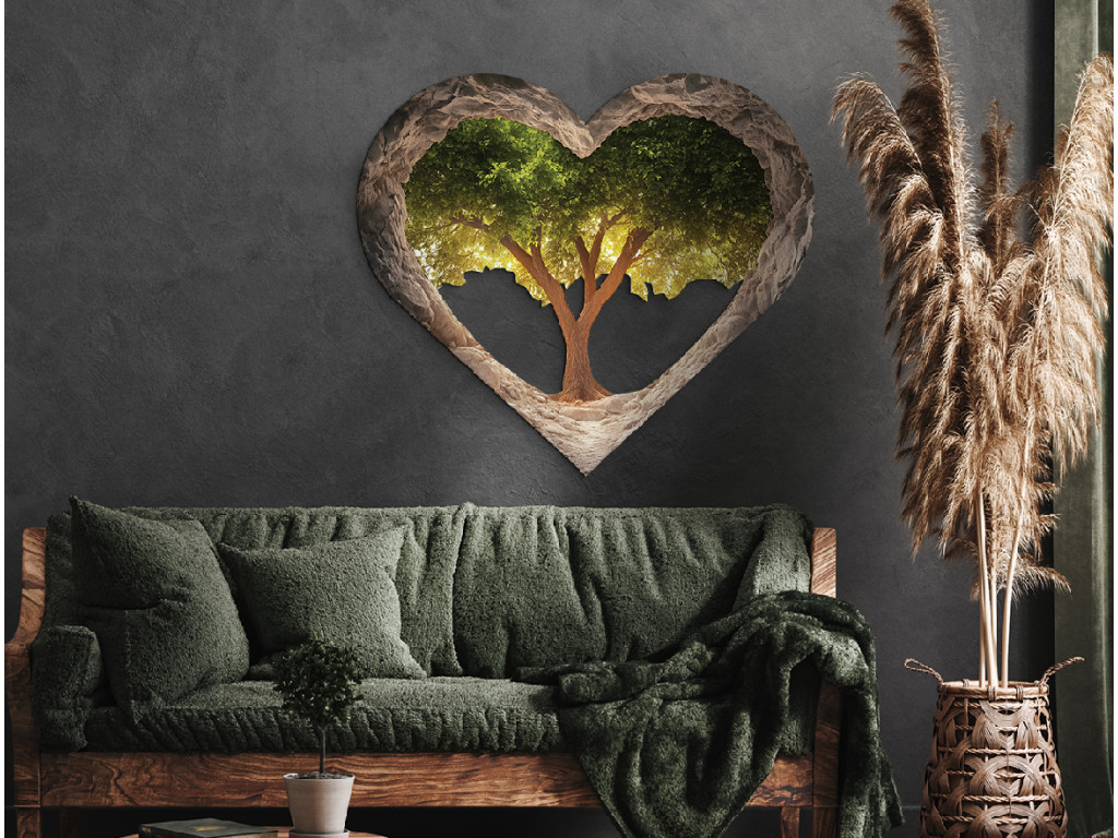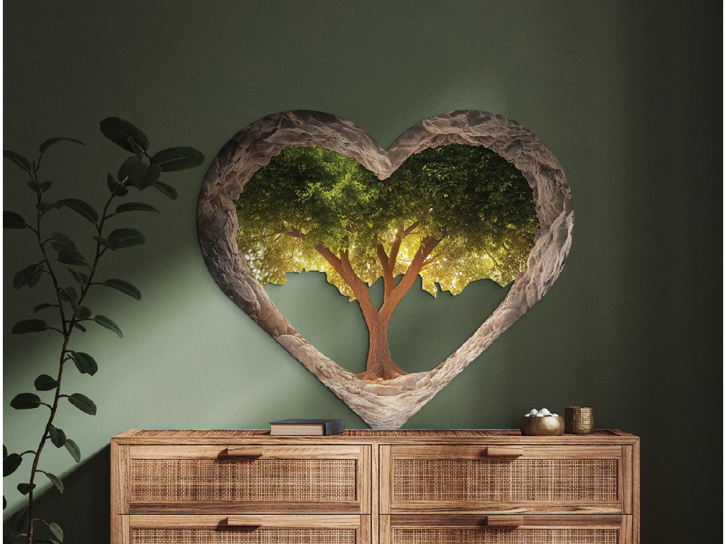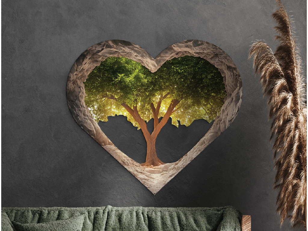A szív formájú kép élénk zöld lombkoronájú fát ábrázol, amely egy barlangszerű, sziklás térben bontakozik ki. A szív texturált peremei a védelmet és a mélységet idézik, miközben a hátulról átszűrődő fény a remény és a nyugalom érzetét kelti. A mű az életet, a növekedést és a természet szívében rejlő erőt szimbolizálja.