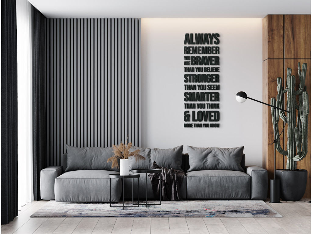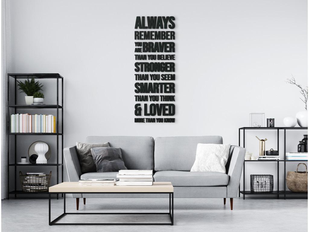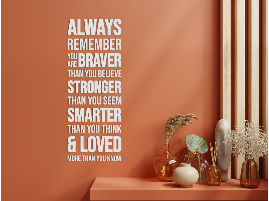 A fa fali idézet: Fa idézet: "Always remember you are braver than you believe, stronger than you seem, smarter than you think & loved more than you know." mindig erőt és bátorságot ad, amikor csak szüksége van rá. Az gondolat szerzője Alan Alexander Milne angol író.