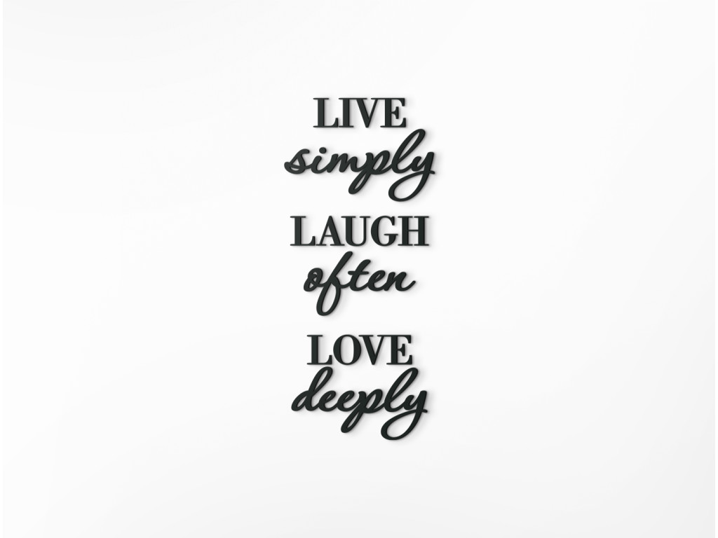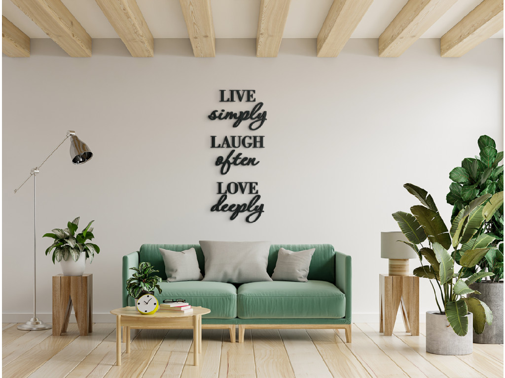 A fa fali idézet az életről Live simply, laugh often, love deeply egy gyakorlati útmutató, hogyan éld meg az életet a legteljesebben. Amellett, hogy élénkíti az unalmas belső falakat, motiválni fogja önt, hogy élvezze minden egyes napját mindazzal, amit magával hoz.