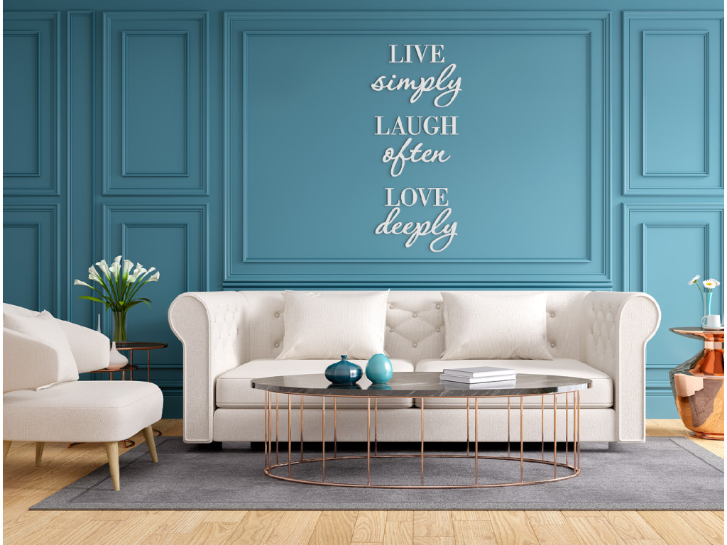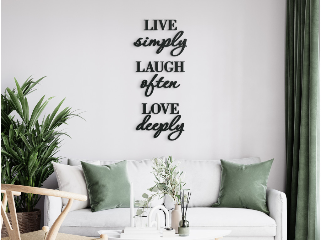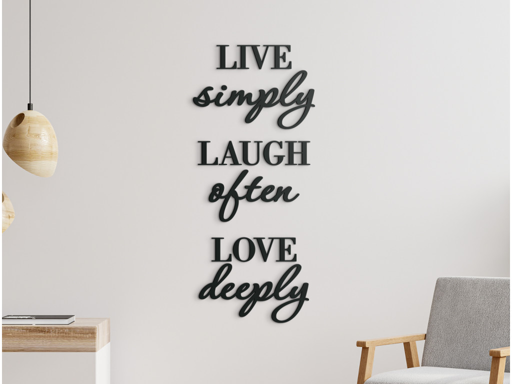 Univerzális receptet keres az élethez? Élj egyszerűen, nevess gyakran, szeress mélyen. Pontosan ezt ajánlja a falon található "Live simply, laugh often, love deeply" motivációs idézet. Egy egyszerű és igaz mottó minden nap elkísérhet bölcsességével, csak ragassza fel a falra a nappaliban vagy a hálószobában, egyszóval bárhol, ahol naponta emlékeztetni fogja rá.