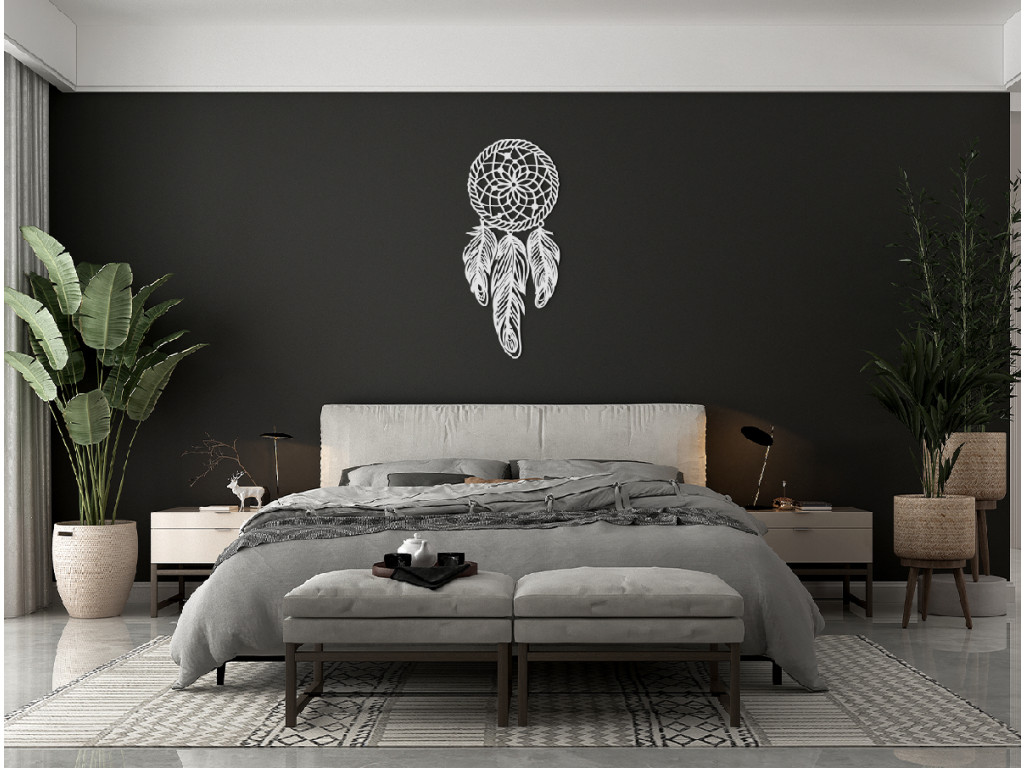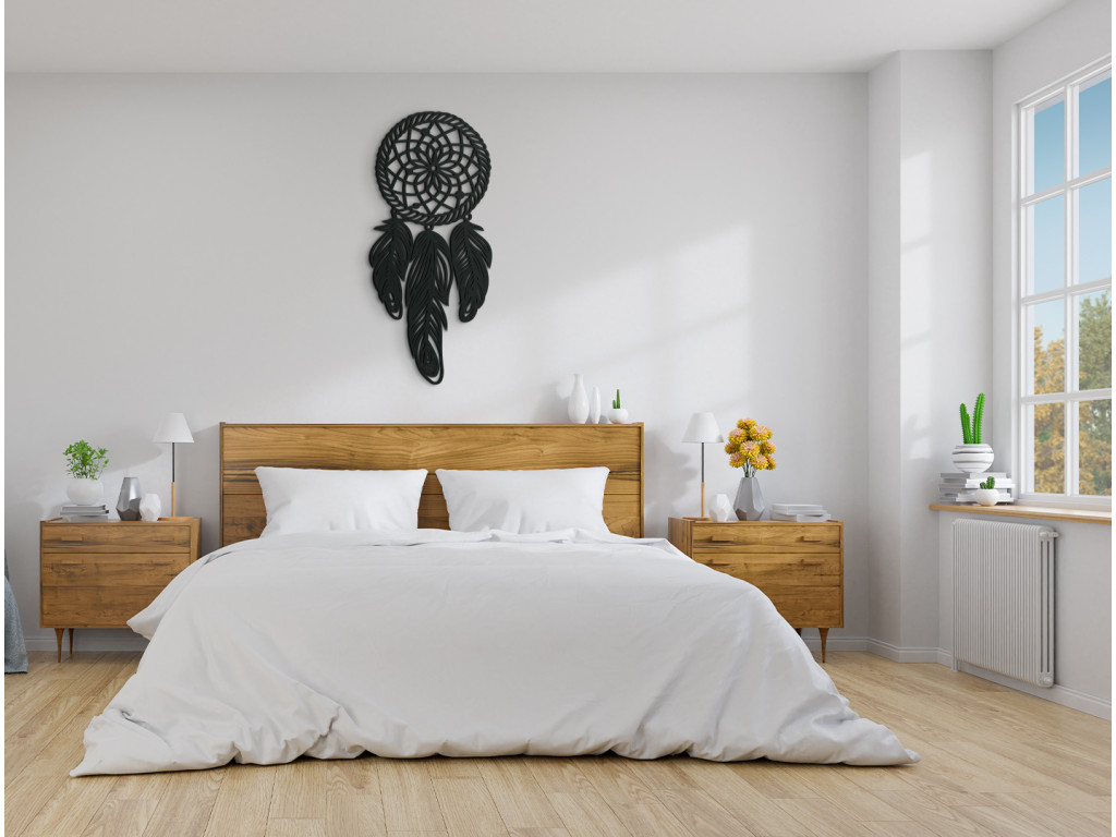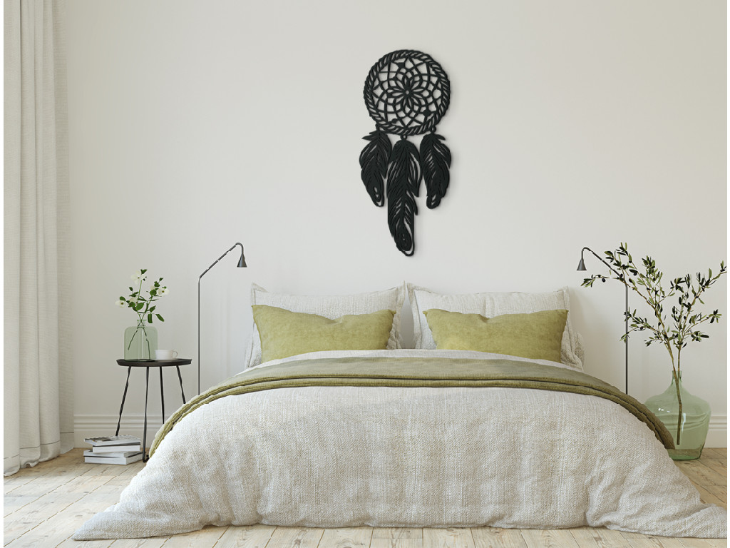 Az álomfogó az egyik legnépszerűbb dekoráció. Nyugodt és kellemes légkört kölcsönöz a szobának. A kör a holdat jelzi, rajta tollak lógnak. A dekoráció alkalmas hálószobába, előszobába, folyosóra és gyerekszobába.