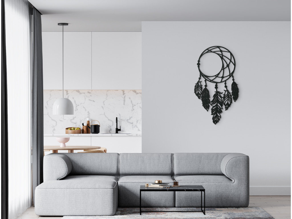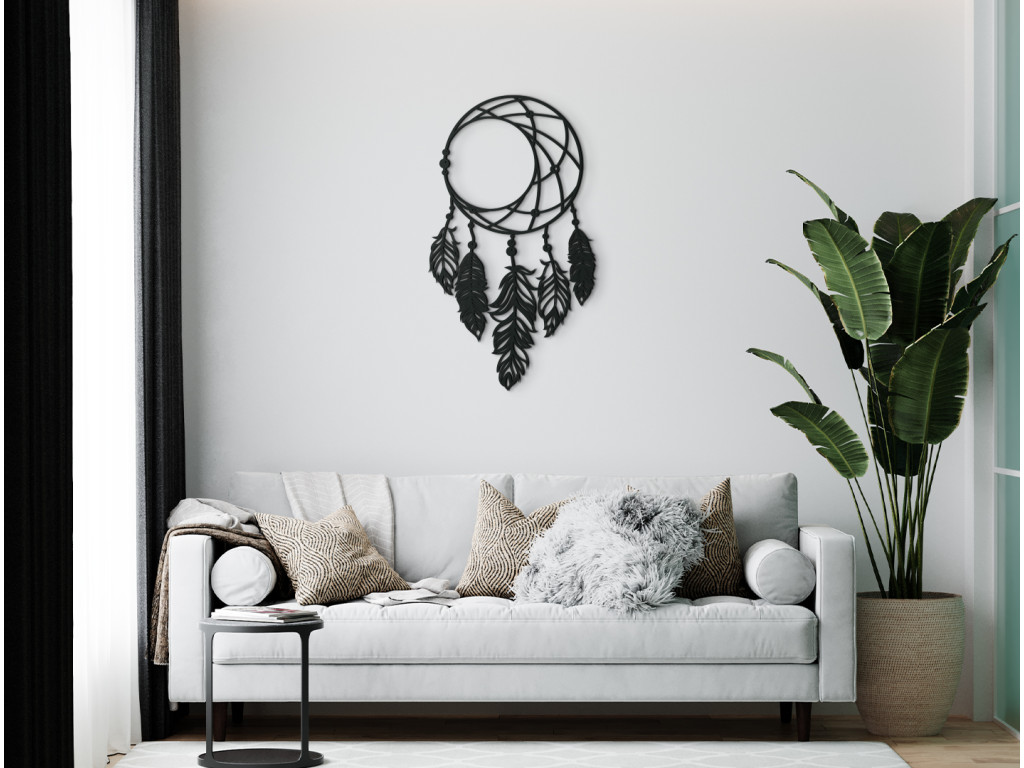 A fából készült ízléses álomfogó nyugodt és kellemes hangulatot hoz a szobába. A kör a holdat jelzi, rajta pedig tollak lógnak. A dekoráció alkalmas hálószobába, előszobába, folyosóra és gyerekszobába.