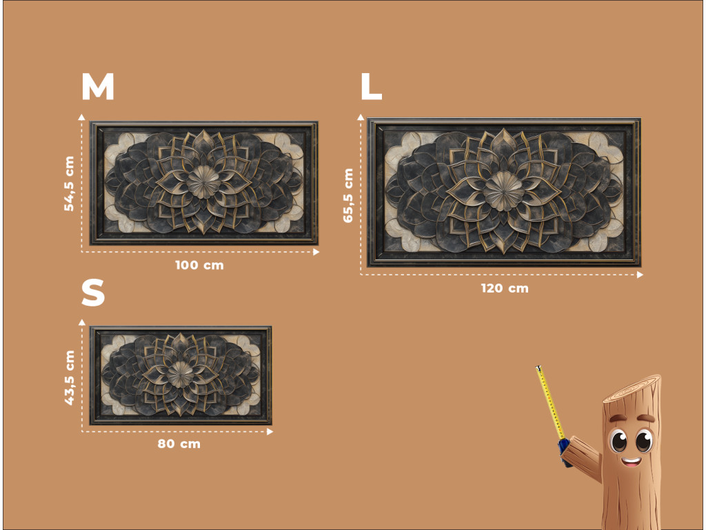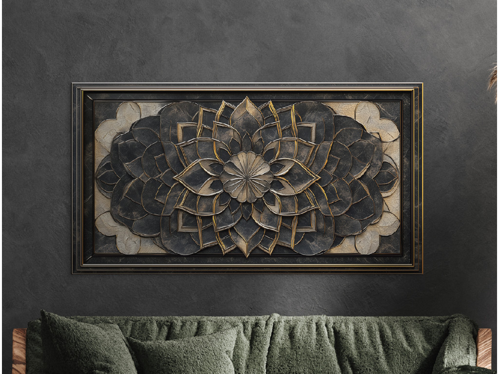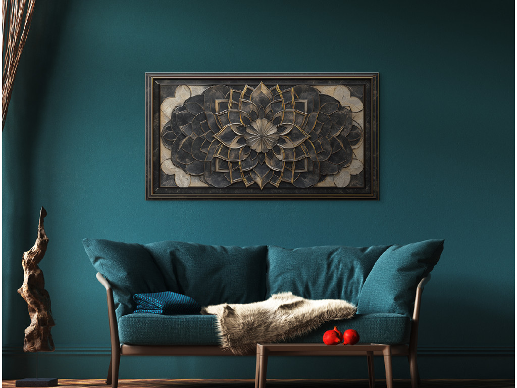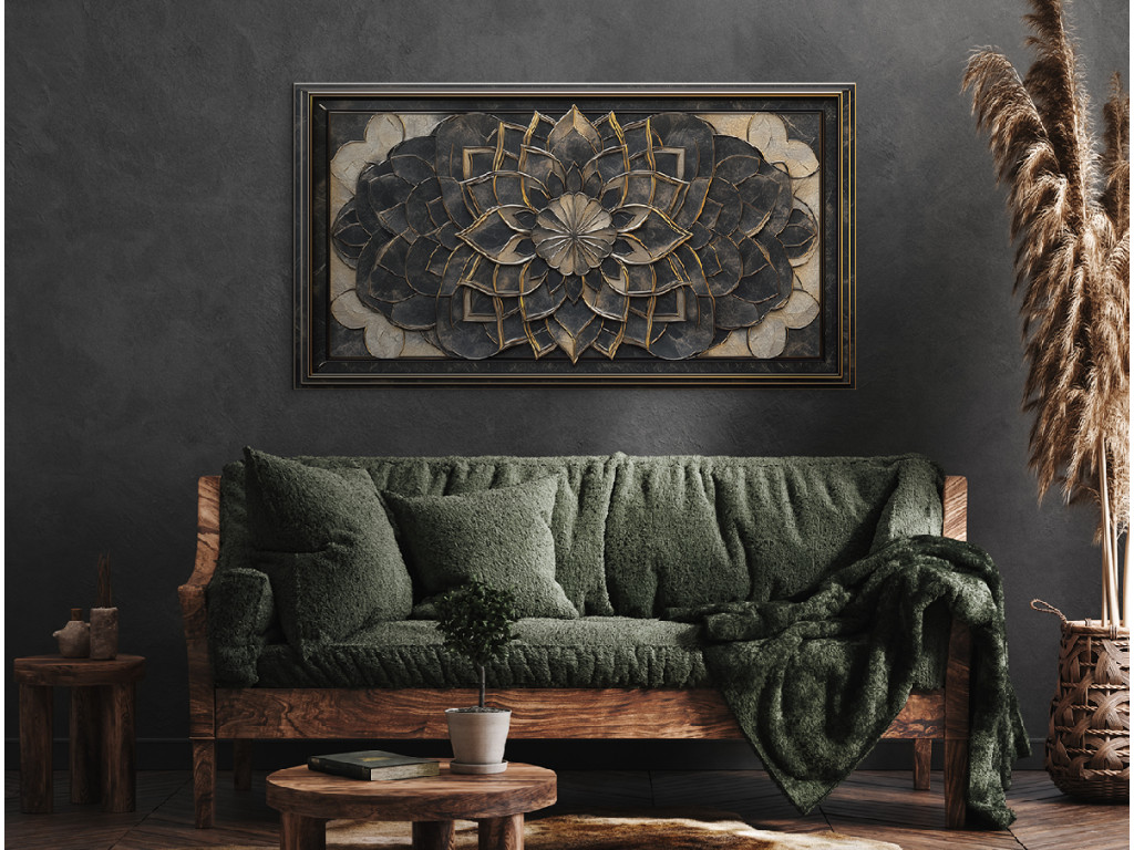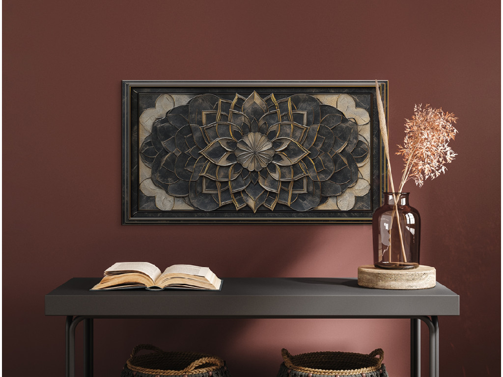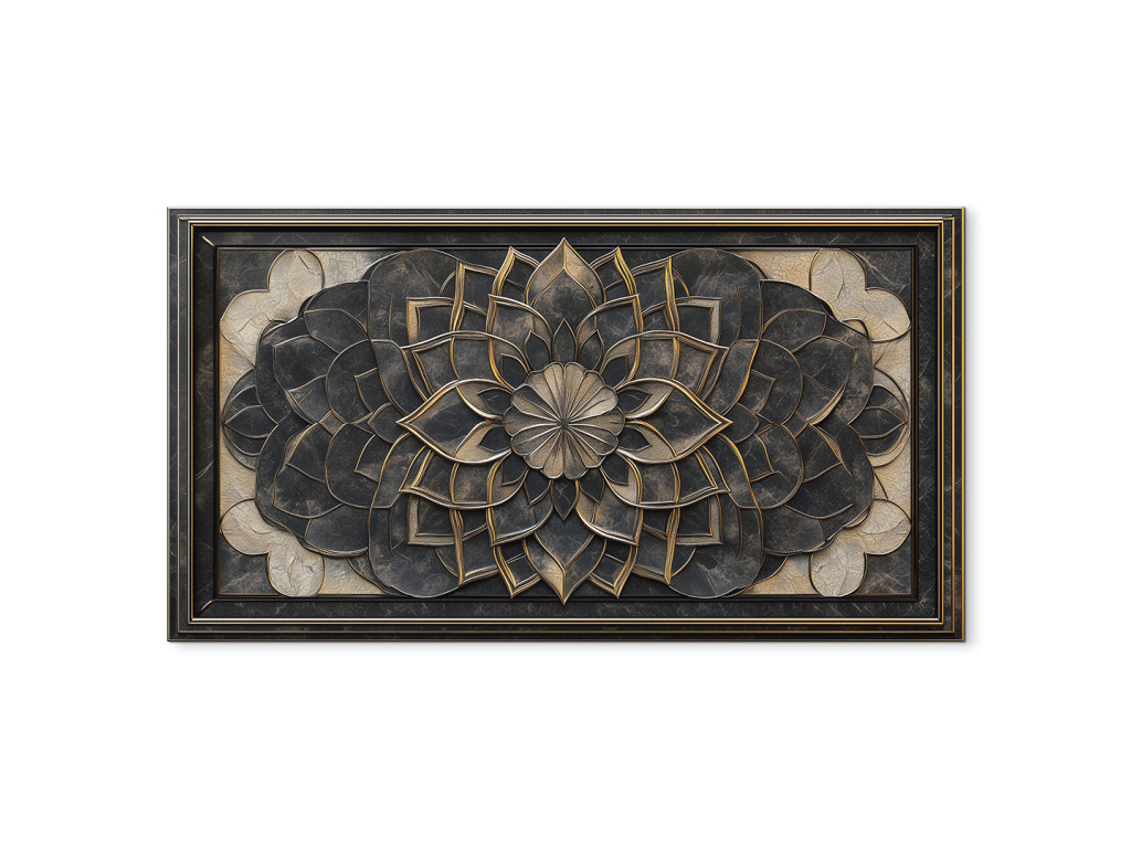 Egy részletesen kidolgozott virág- vagy mandala motívumú dombormű feltűnő háromdimenziós hatást kelt. A sötét fém textúrák finom arany díszítéssel kiemelik az egyes rétegeket, és elegáns, antik jelleget kölcsönöznek a darabnak.