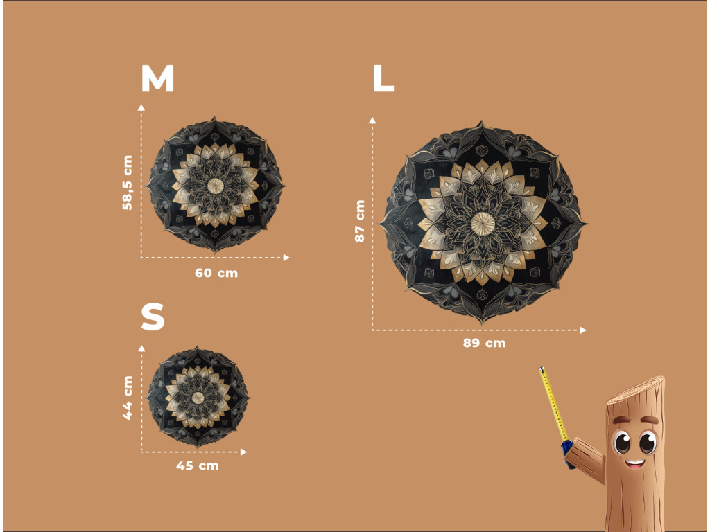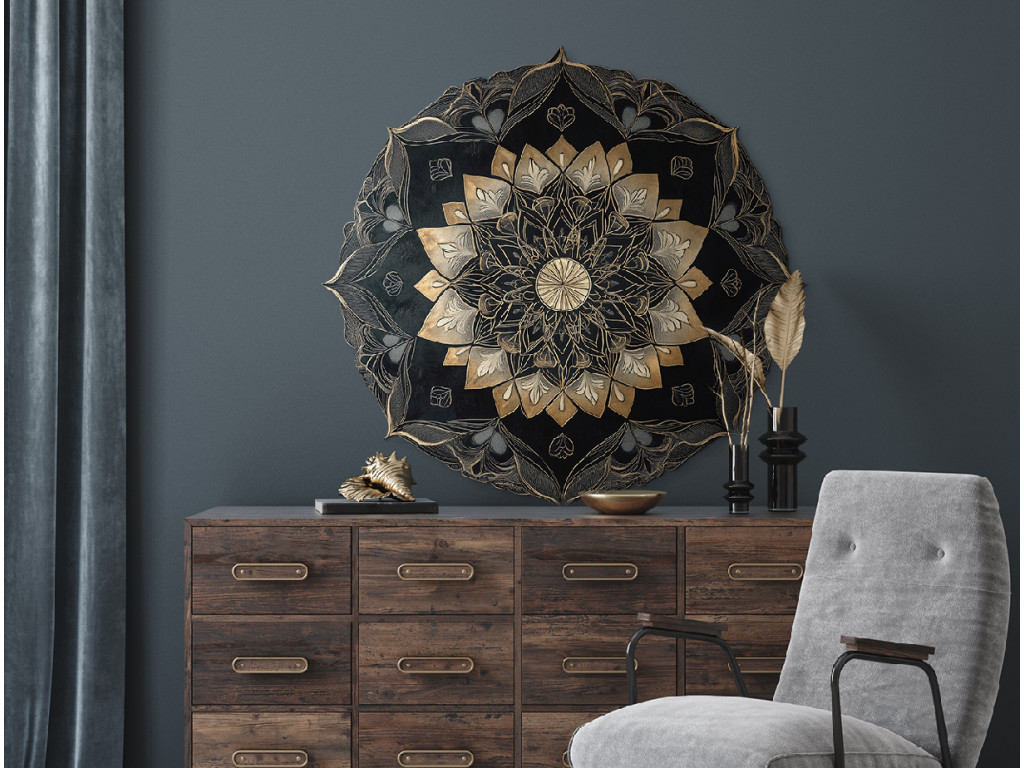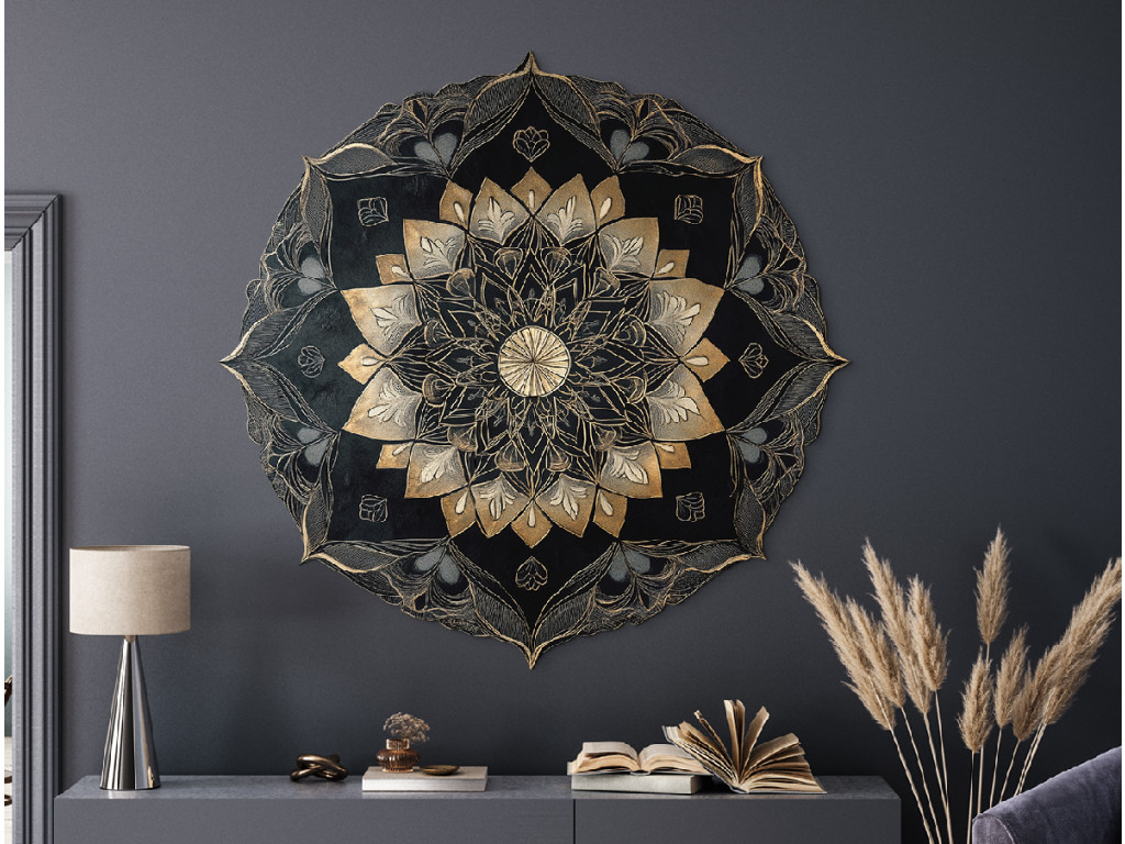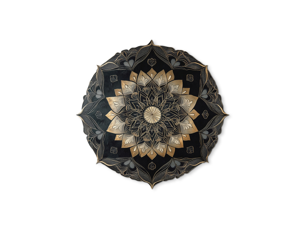 Részletesen kidolgozott fekete és arany mandala komplex, réteges mintával és ismétlődő geometriai és virágmotívumokkal. A központi kört szimmetrikus díszek veszik körül, amelyek mélységhatást és gazdag textúrájú felületet hoznak létre. A sötét tónusok és az arany díszítések elegáns kombinációja határozott művészi jelleget kölcsönöz a darabnak.
