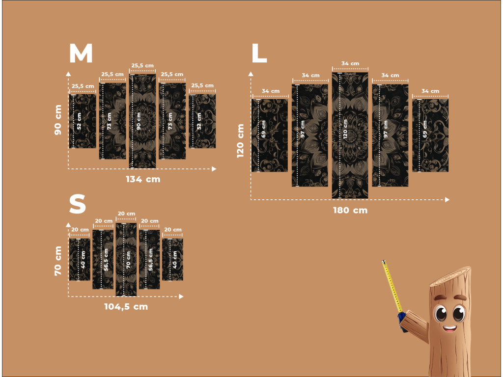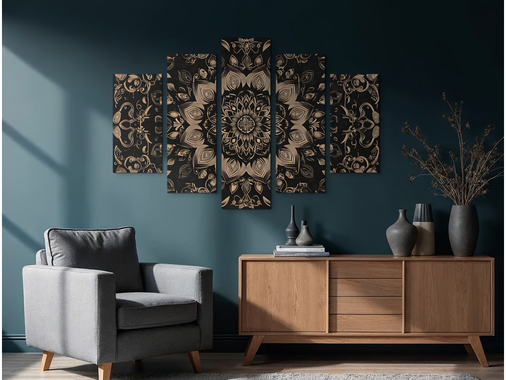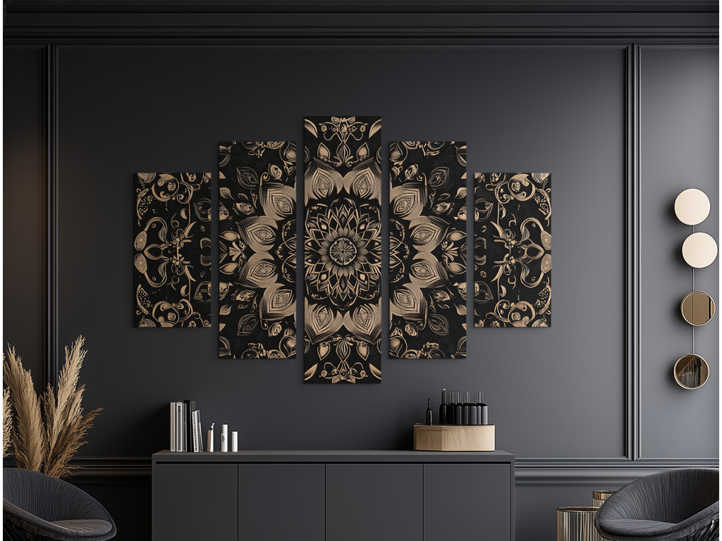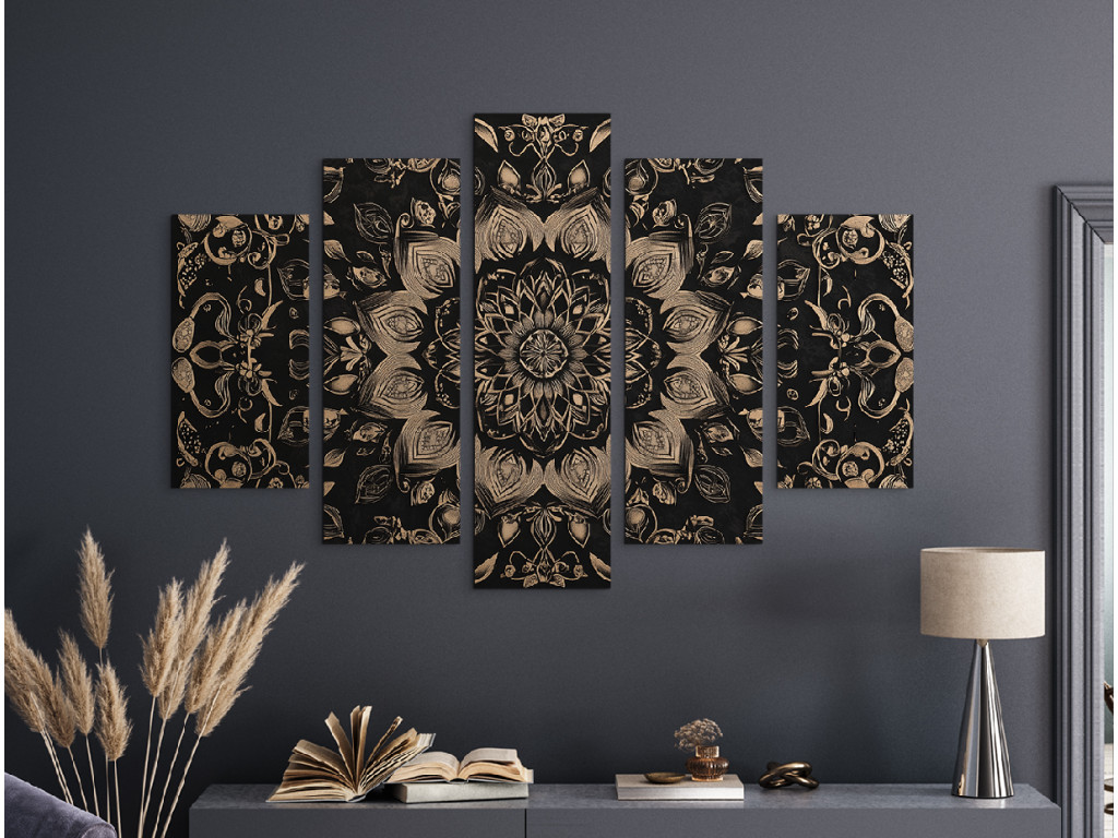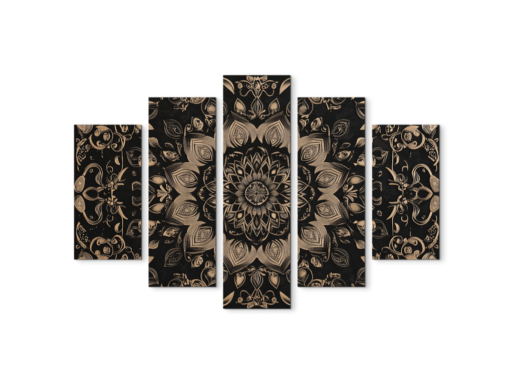 Erőteljes vizuális hatást kelt ez az ötrészes szimmetrikusan elrendezett arany-fekete mandala képszett. A középső panelt a részletgazdag rajz uralja, míg a szélső elemek harmonikus keretet adnak. Az elegáns kivitel luxus és nyugtató összhatást teremt.