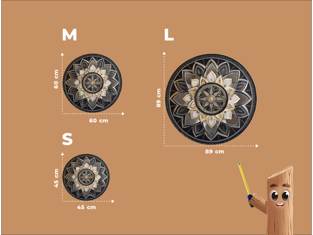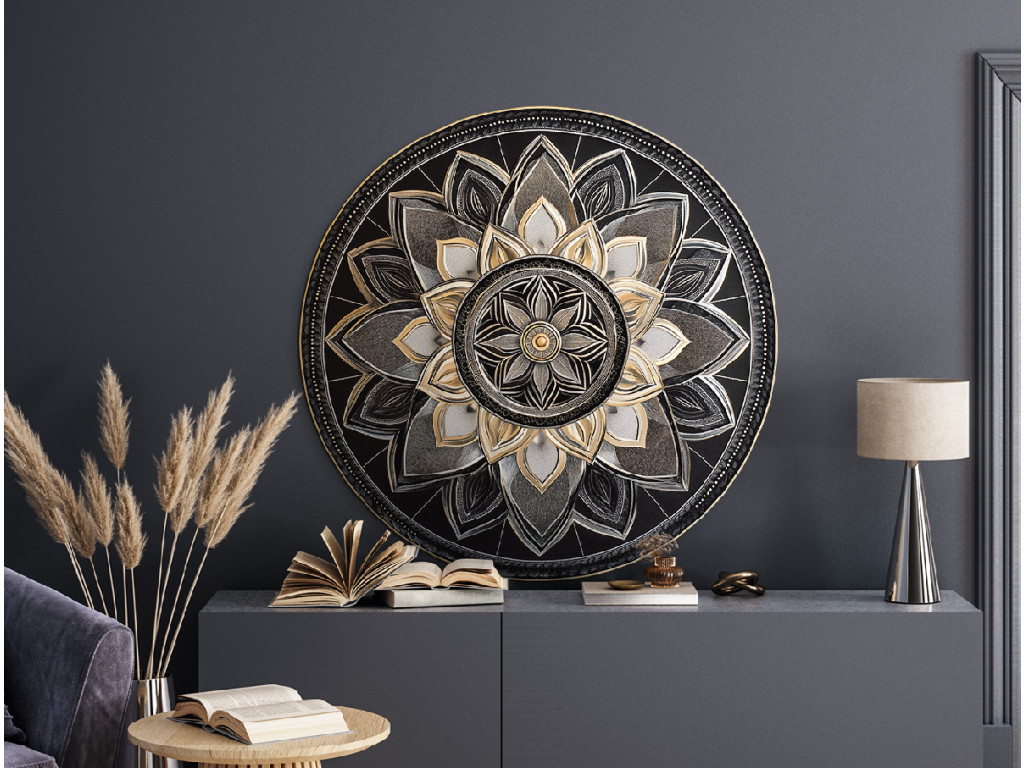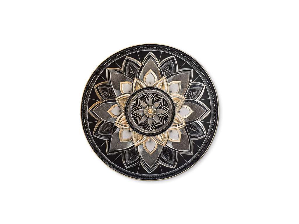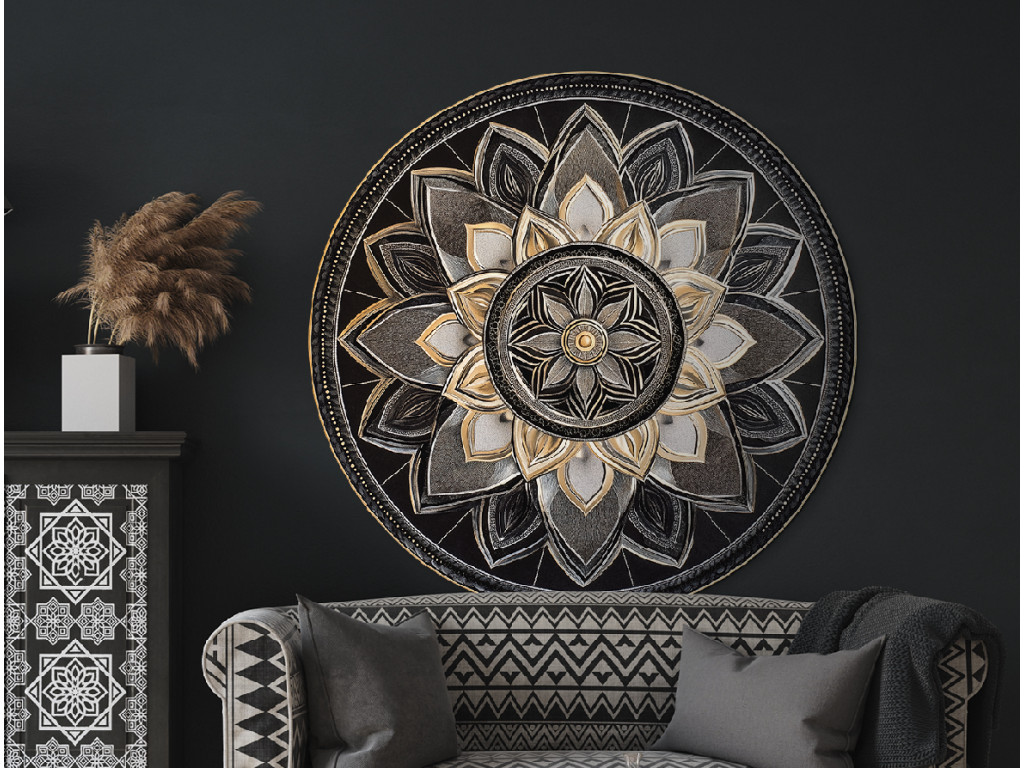 Elegáns mandala gazdag részletekkel, fekete, szürke és arany kombinációjában, amely egy központi körből koncentrikus díszítőrétegekbe sugárzik. A finoman kiálló minták háromdimenziós hatást keltenek, amely mélységével és szimmetriájával lenyűgöző. A minta harmonikus és nemes megjelenésű, ideális dekoráció modern vagy bohém enteriőrökbe.