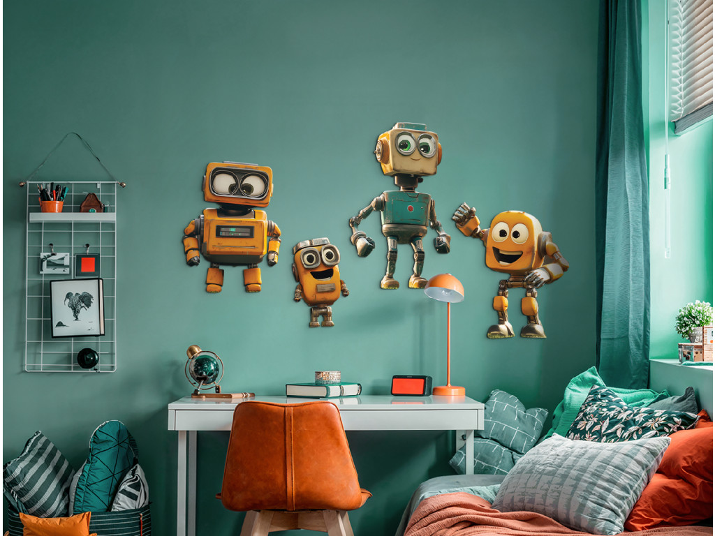 Ez a játékos faldekoráció négy animált robotból álló csoportot ábrázol, akik igazi barátokként viselkednek. A színes, kifejező arcú és változatos mintákkal rendelkező karakterek ösztönzik a gyerekek képzeletét és kíváncsiságát. A dekoráció ideális a technológia, a sci-fi és a robotikus kalandok szerelmeseinek.