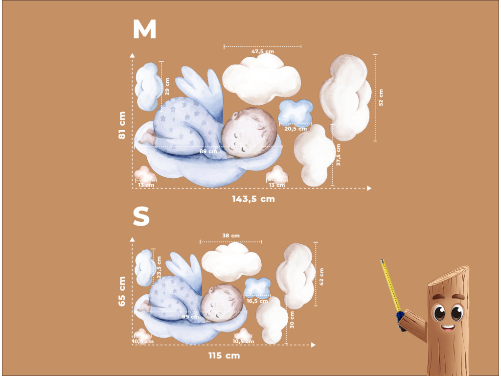 Egy aranyos rajzolt angyal kék pizsamában békésen pihen a puha felhőkön. A lágy színek és a finom motívum a béke és a biztonság érzetét kelti. Nagyszerű választás a gyerekszoba hangulatossá tételéhez vagy egy kellemes légkör megteremtéséhez a pihentető alváshoz.