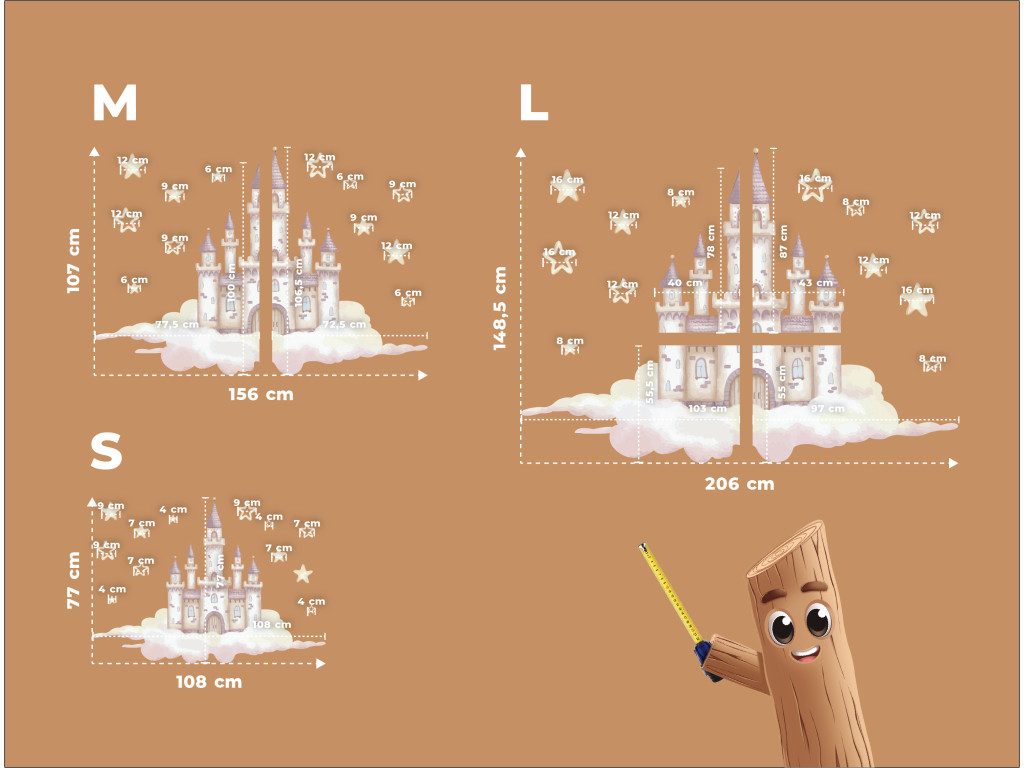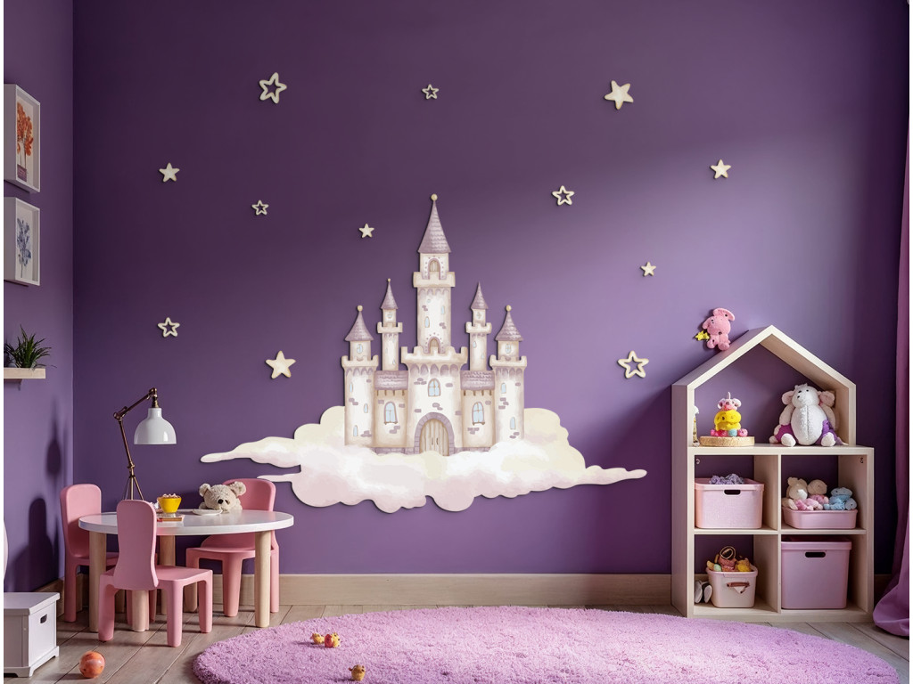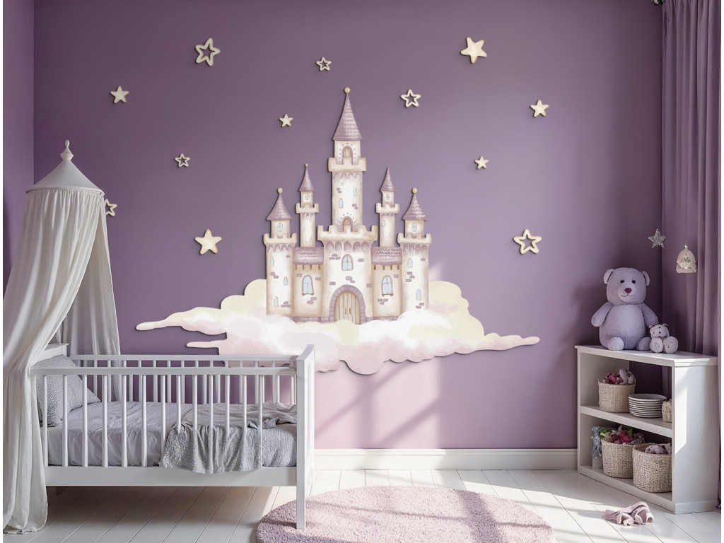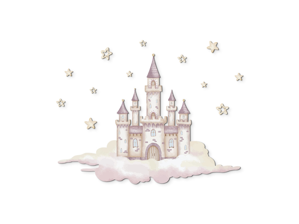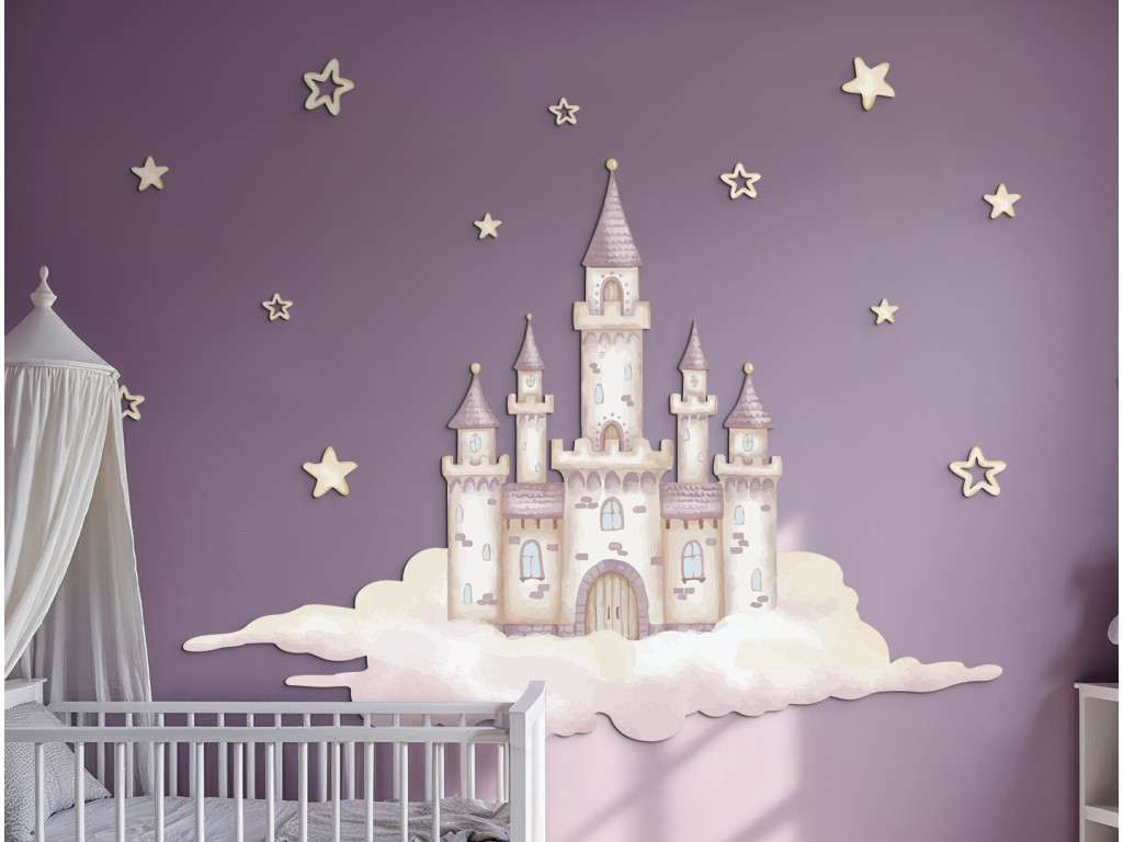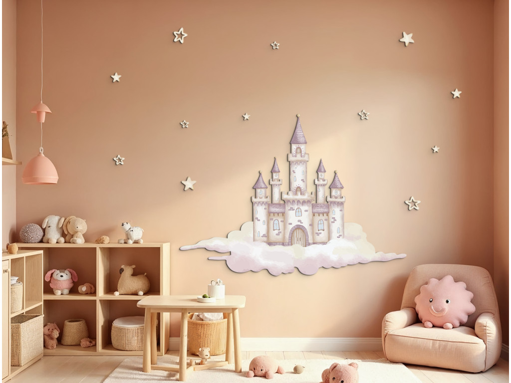 Egy bolyhos felhőn álló mesebeli kastélyt csillagos ég vesz körül, varázslatos hangulatot kölcsönözve a jelenetnek. A lágy színek és a játékos dizájn varázslatos és fantáziás hangulatot teremt a gyerekszobában.