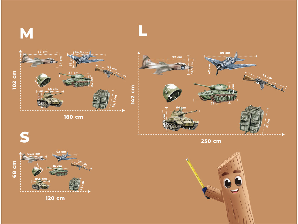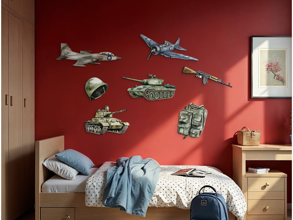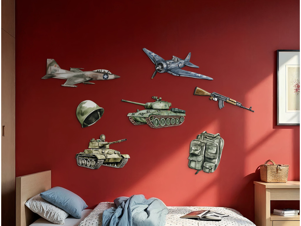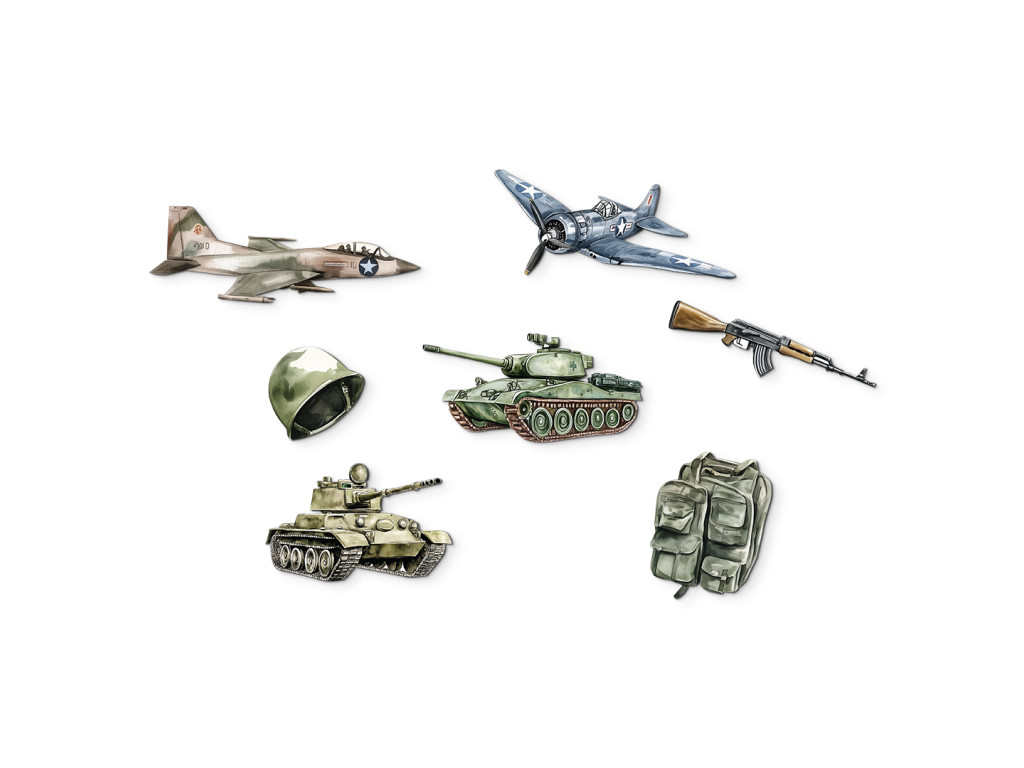Ez a gyerek illusztrációkból álló szett vadászgépeket, tankot, sisakot és felszerelést mutat be játékos, rajzolt stílusban. A katonai téma finoman, a gyermeki képzeletre fókuszálva jelenik meg, nem a harcra. Tökéletes kiegészítő kis repülő‑, gép‑ és kalandrajongók szobájába.