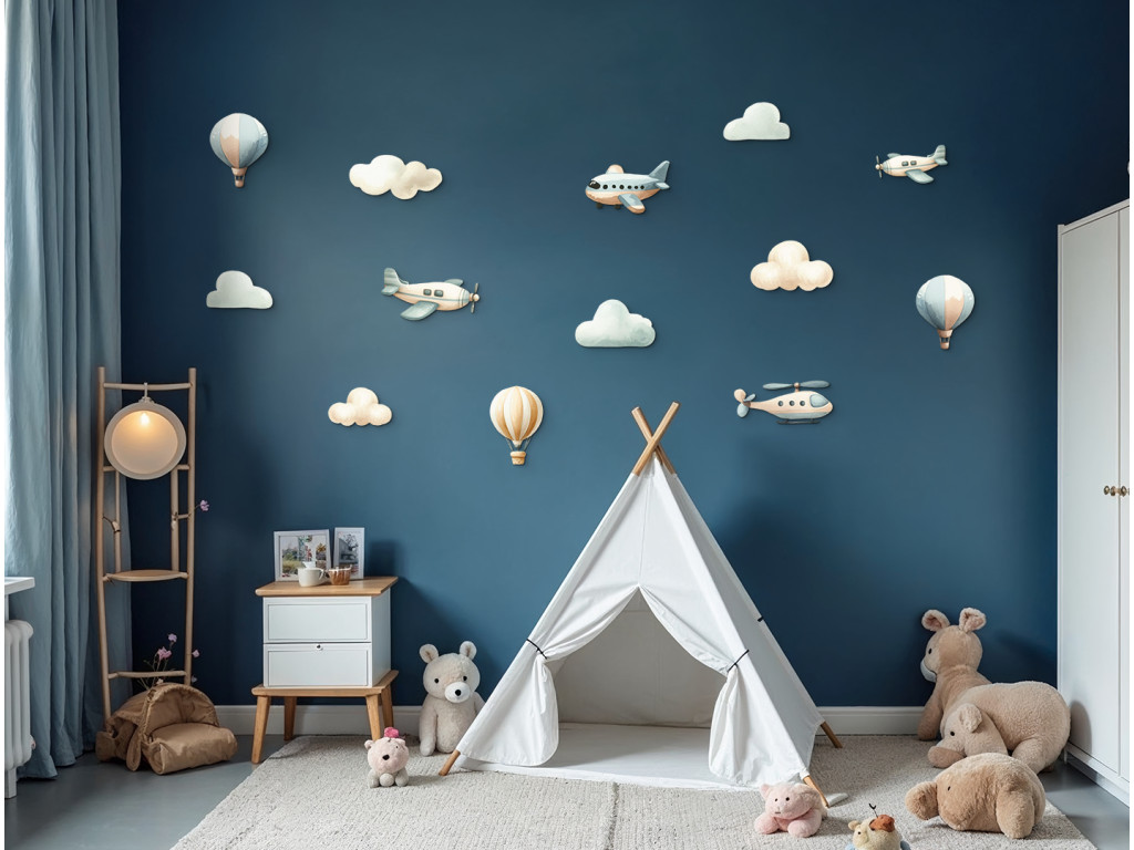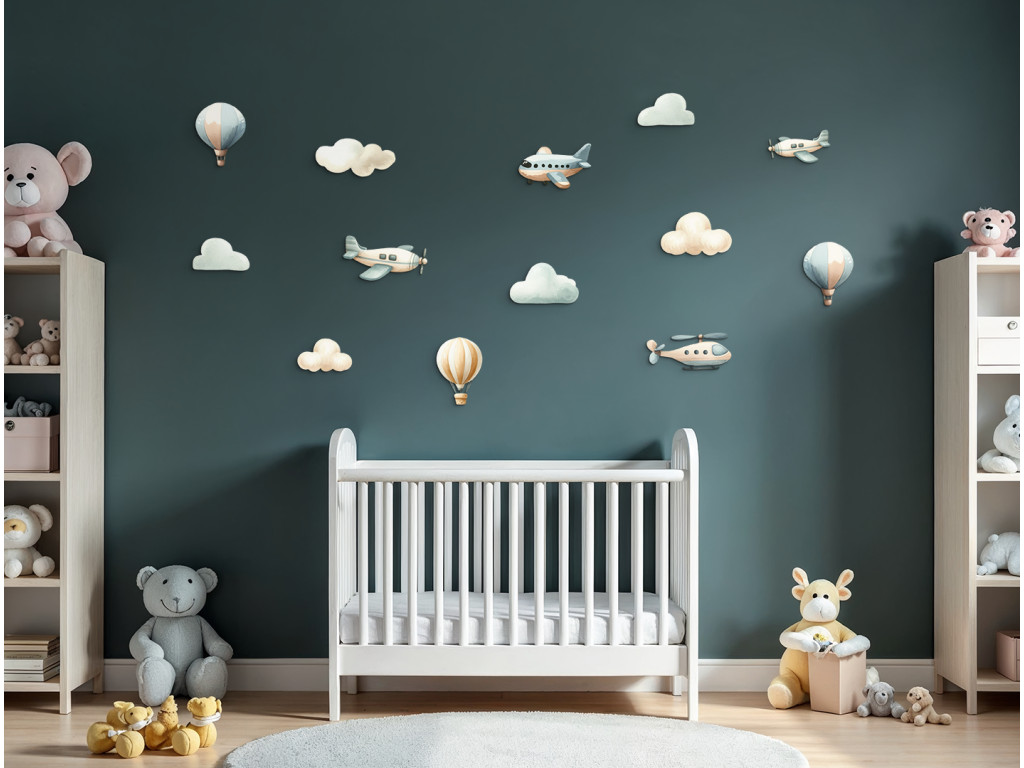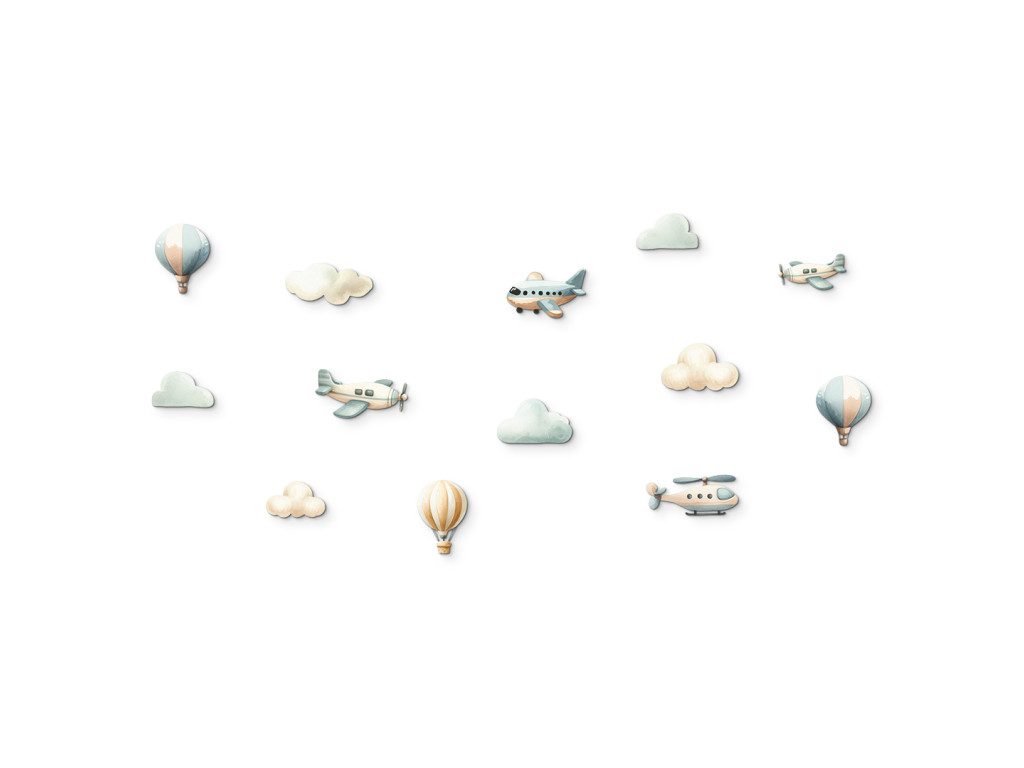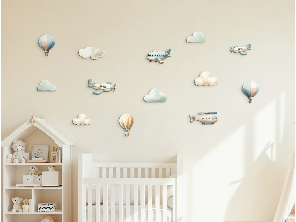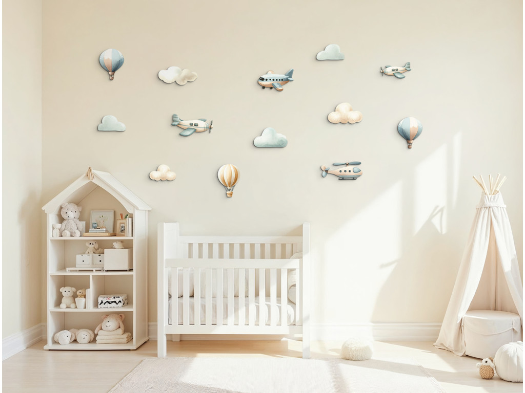 Kellemes pasztell dekoráció szürke és kék árnyalatokban, kis repülőkkel, hőlégballonokkal és pihe-puha felhőkkel. Nyugodt, harmonikus összhatást ad a térnek. Ideális kicsiknek és babáknak, letisztult, megnyugtató vizuális környezettel.