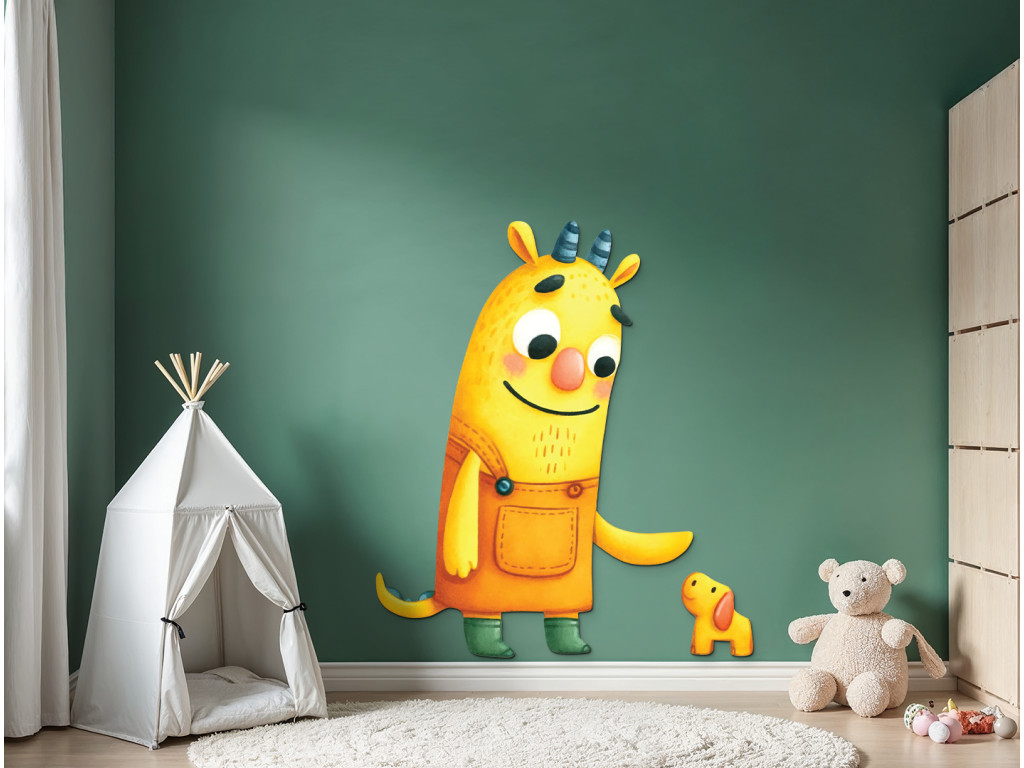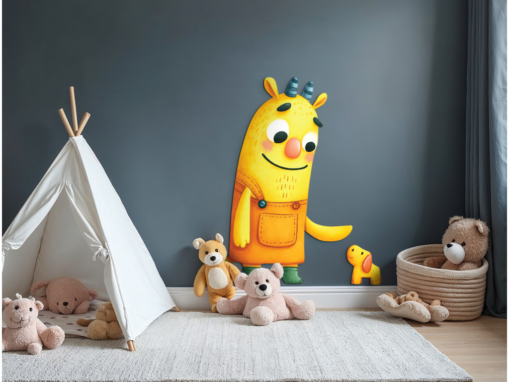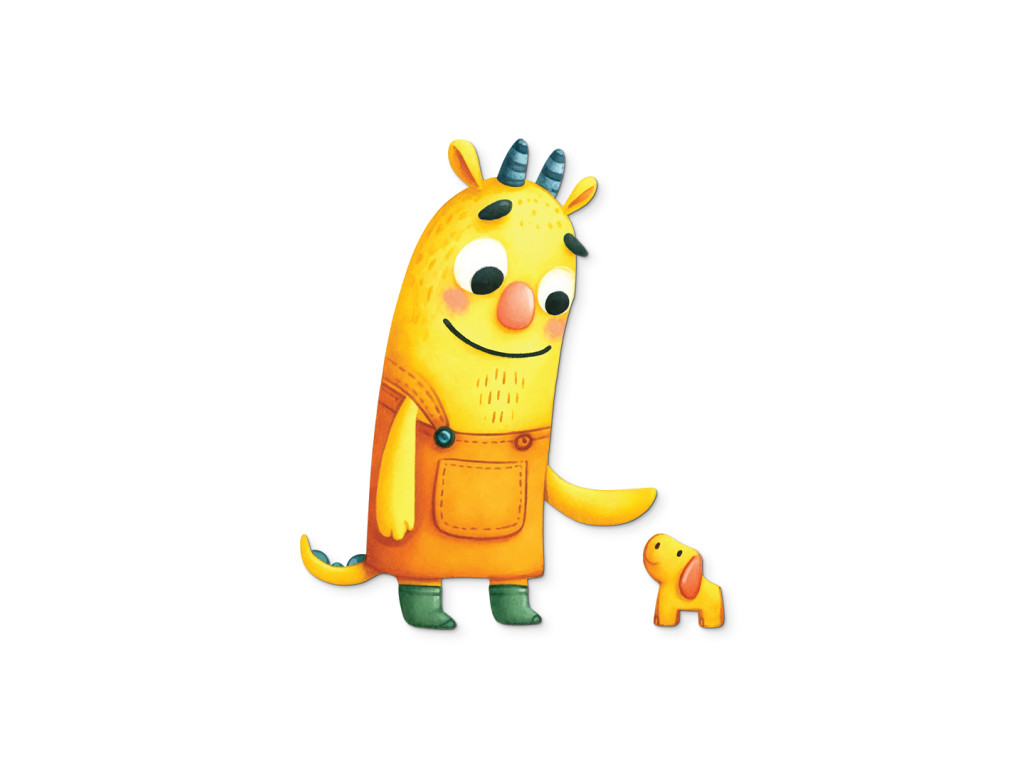 Az egyiknek szarvai vannak, a másiknak farka – mégis egymás tekintetét vonzzák. A sárga alak a kiskutyára mosolyog, aki talán épp most találta meg a legjobb barátját. Egy kép, amely egy néma barátság történetét meséli el.